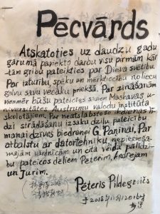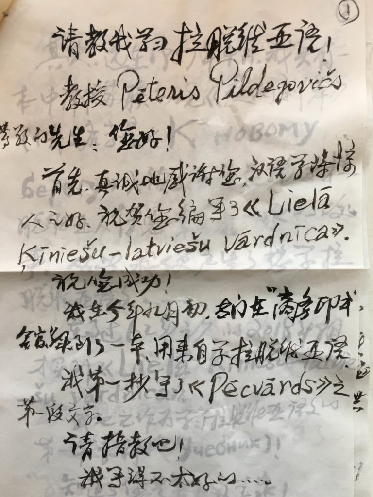 In April 1957, 22-year-old Mr. Zheng bought a Chinese translation of the Soviet novel “Towards a New Shore”, which described the life of a Latvian family. He was deeply moved after reading it, so he developed the desire to learn Latvian language and began to study the three Baltic languages, including Latvian language by himself for a long time. However, he has been hampered by the lack of suitable teaching textbooks. It was not until 2018 that the 84-year-old Mr. Zheng finally found the <Chinese Latvian Dictionary> wrote by Professor Pēteris Pildegovičs, which he regarded as the first official “textbook” for learning Latvian. After reading the postscript of the dictionary, Mr. Zheng carefully copied the postscript of the dictionary in Latvian and wrote a letter full of sincere emotions, expressing his sincere gratitude to Professor Pēteris Pildegovičs for his years of dedication to studying Chinese and his hard work for writing this dictionary. He sincerely hoped that Professor Pēteris Pildegovičs can accept him as an “old student” and help him learn Latvian language. He also said: “You are working hard to learn Chinese, and I will also work hard to learn Latvian and strive to master it.” The handwritten letter is neatly written and full of affection, expressing the pursuit of knowledge and respect for culture by an old gentleman who is sincerely studying, yearning for civilization, and desire for peace.