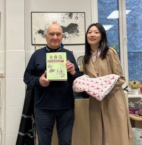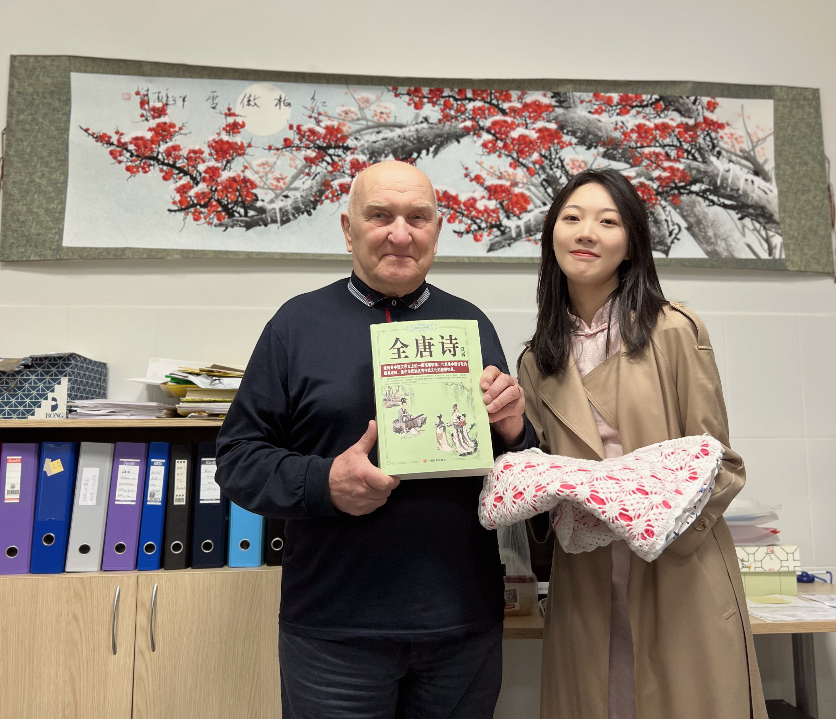 After talking to Mr. Zheng, Tang Jing could not calm down for a long time, and then told Mr. Shang Quanyu the good news. Mr. Shang was very happy after hearing this and immediately suggested, “Before you return to China in the summer, we ask Professor Pēteris Pildegovičs to give Mr. Zheng gifts : <Chinese Latvian Dictionary> and <Selected Translations of Tang Poems> and asked Professor Pēteris Pildegovičs to autograph it, then you bring it to Mr. Zheng, so that he would be very happy!” In August this year, Teacher Tang returned to his hometown Mianyang, lived up to expectations, she brought the books to Mr. Zheng, which made him overjoyed. He said, “In order to learn Russian, I spent more than 300 yuan to buy a dictionary. It is not easy to compile a dictionary and it is even more difficult to compile such a heavy <Chinese Latvian Dictionary>. I am very interested in it, Professor ēteris Pildegovičs is full of respect.” Coincidentally, Mr. Zheng also gave Mr. Pēteris Pildegovičs a book, which happened to be “Appreciation of All Tang Poems”, which coincided with Mr. Pēteris Pildegovičs’s new book <Selected Translations of Tang Poems> . In addition, although Mr. Zheng is nearly 90 years old, he is full of energy and has been hand-crocheting for more than 60 years. He even presented Professor Pēteris Pildegovičs with two pieces of exquisite handmade fabrics. The passers-by who were watching learned about this touching story said one after another: “These two old people are really amazing!”