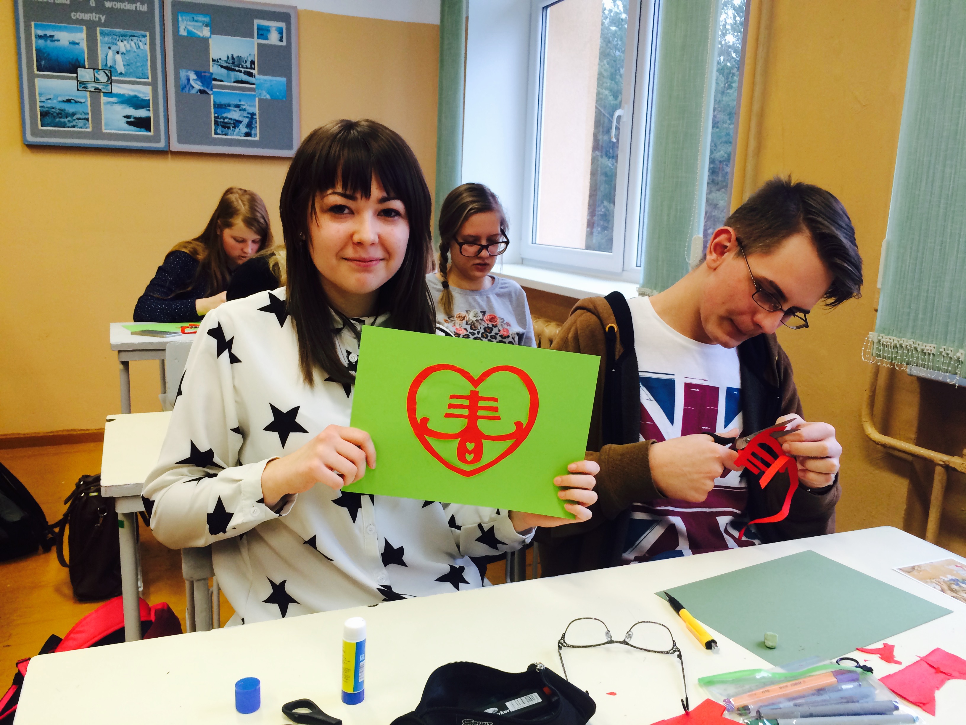 After the introduction of the origin and customs of the Spring Festival, and watching the show “picturesque landscape” of the 2015 Spring Festival Gala , Tr. Liang took out the paper-cutting work, “Spring in the heart”, she explained the meaning of the Chinese character “Chun”, which means spring, that when your heart is filled with spring ,your heart is filled with hope. After that, she began to teach students and teachers how to make this paper-cutting ,and told them to write best wishes for the New Year.