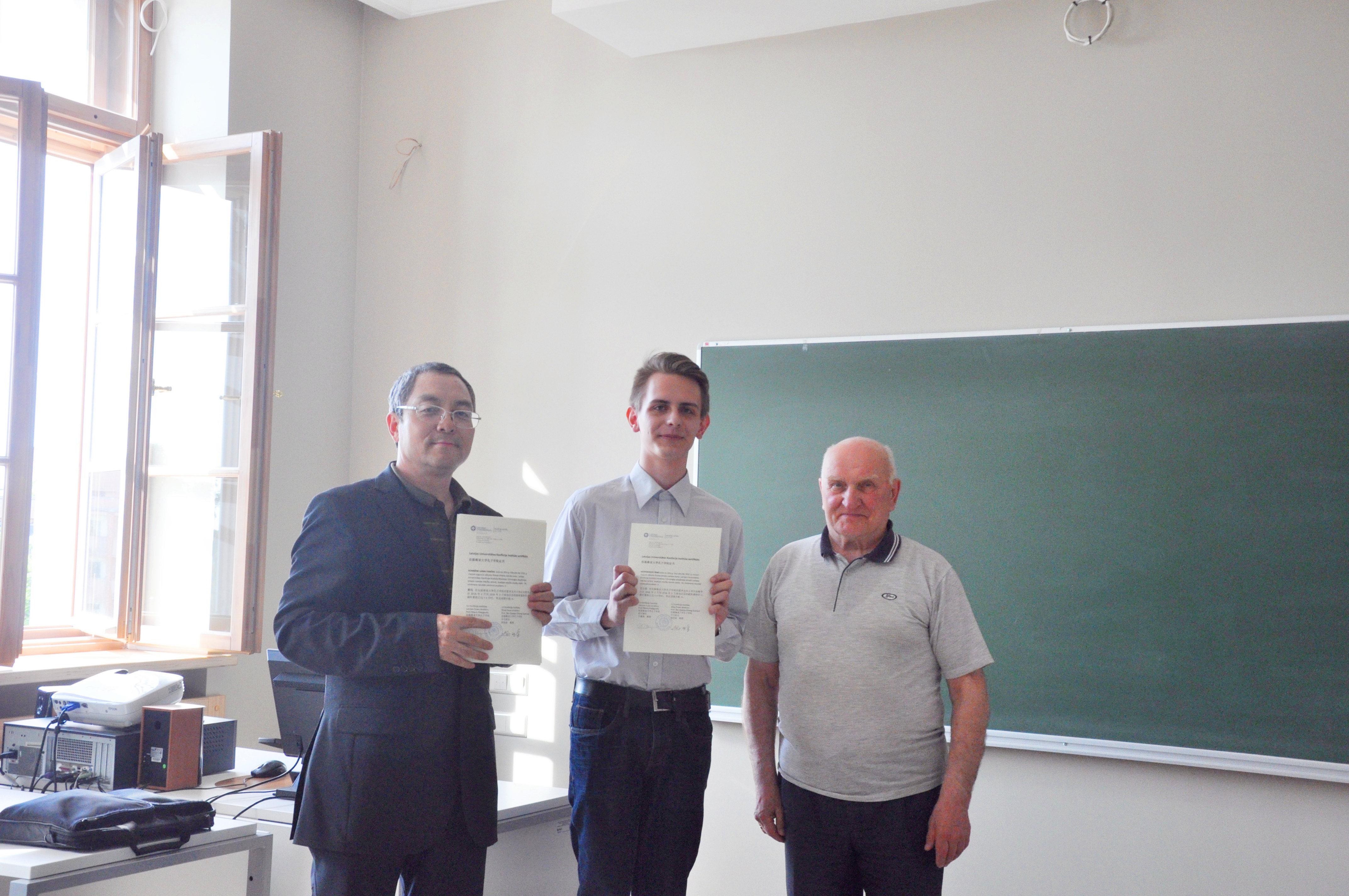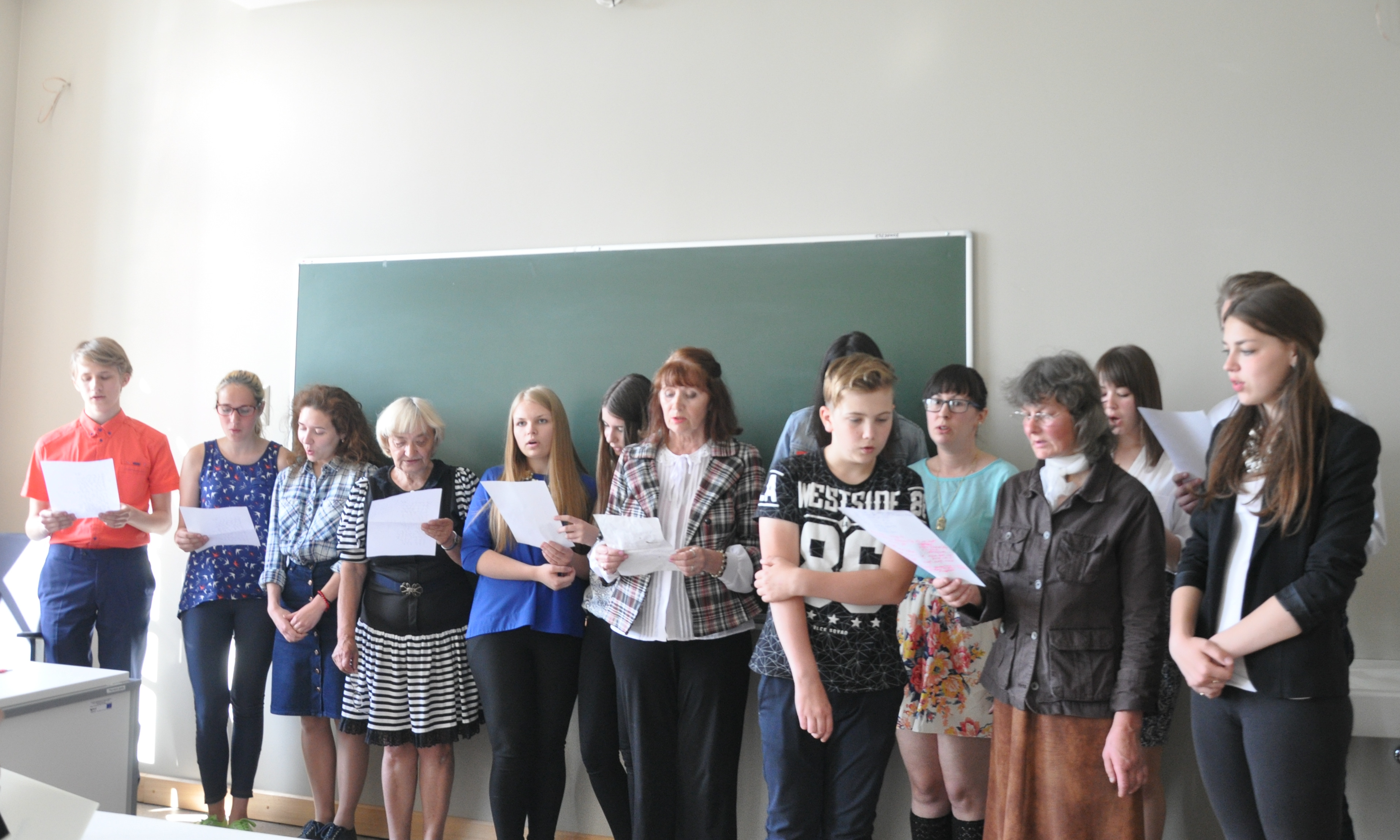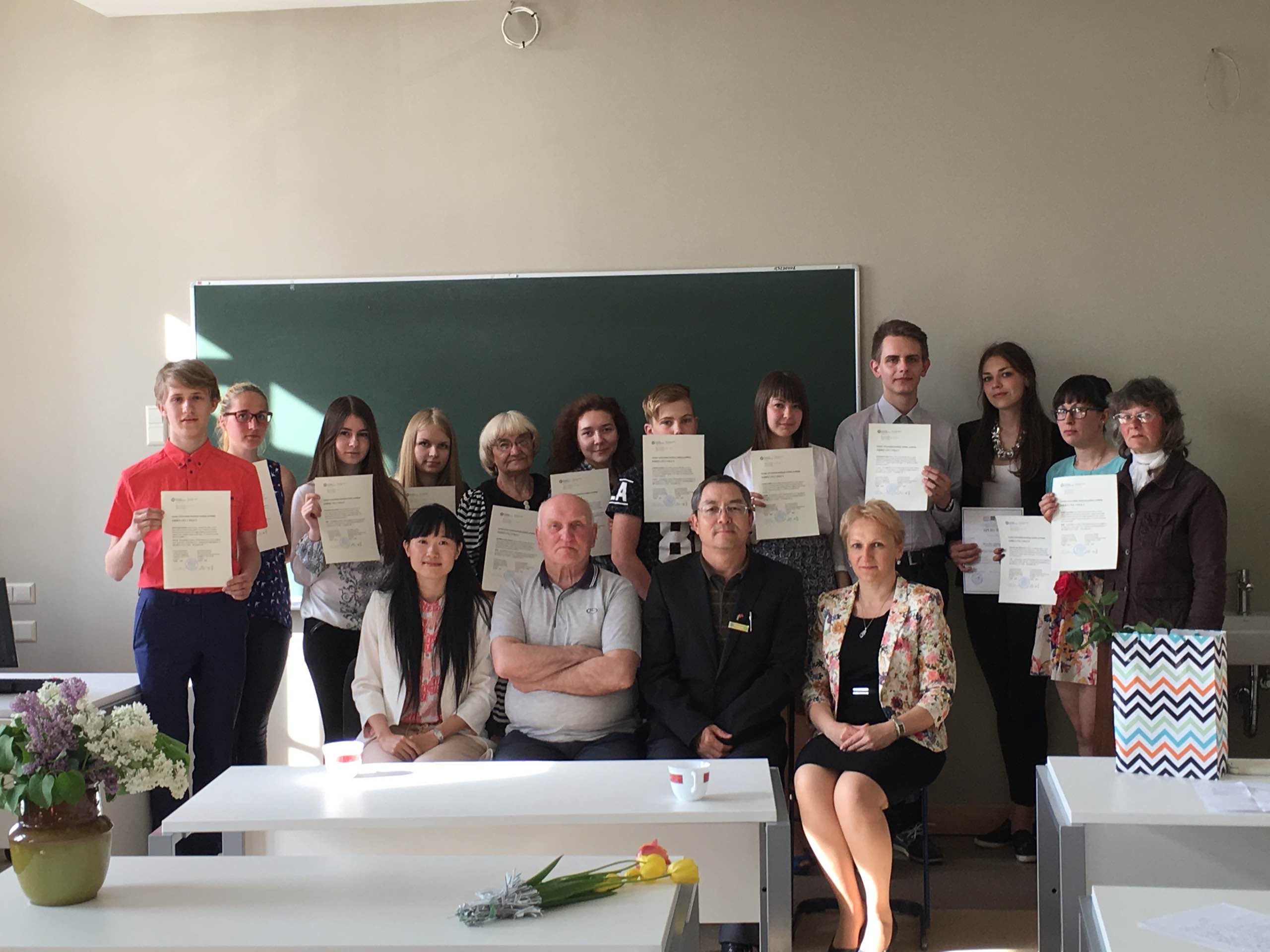 At 16:00, Chinese certificate awarding ceremony began. Two directors met the Chinese learners at classroom 314. Professor Shang quanyu encouraged students to continue to learn Chinese, to participate in summer camp or go to China to study.Professor Peteris Pildegovics answered students’ questions about Chinese learning patiently. Next, Eriks ,the student who has participated in Chinese Bridge Competition brought a poetry reading, “Snow”, followed by Katja ‘s poetry reading “Early Spring”, after the poetry reading, all the students sang the Chinese song “Friend”. Subsequently, the two directors awarded certificates to the students and congratulated them of their completion of this year’s Chinese studying, also encouraged them to make continued efforts to learn Chinese.