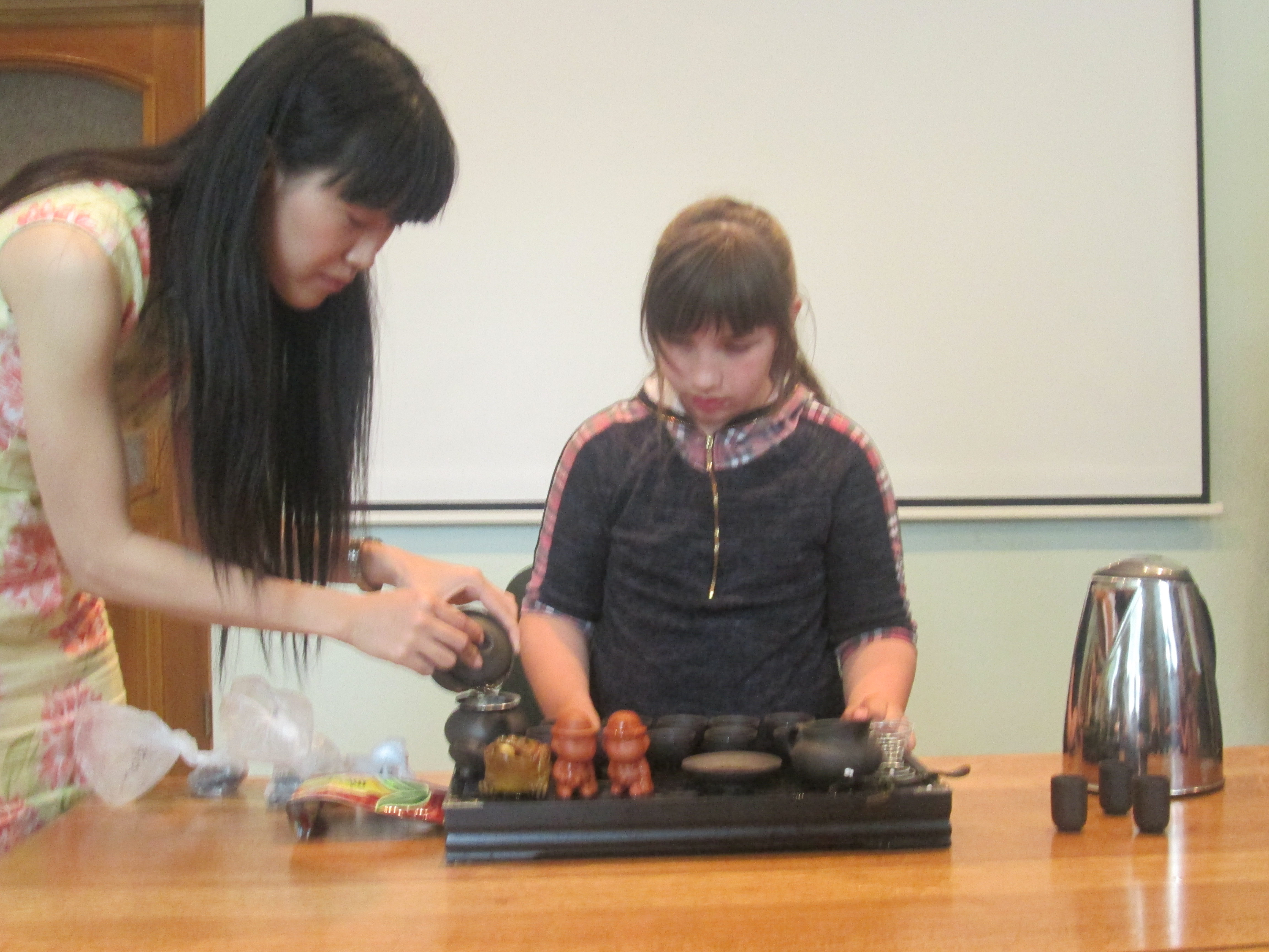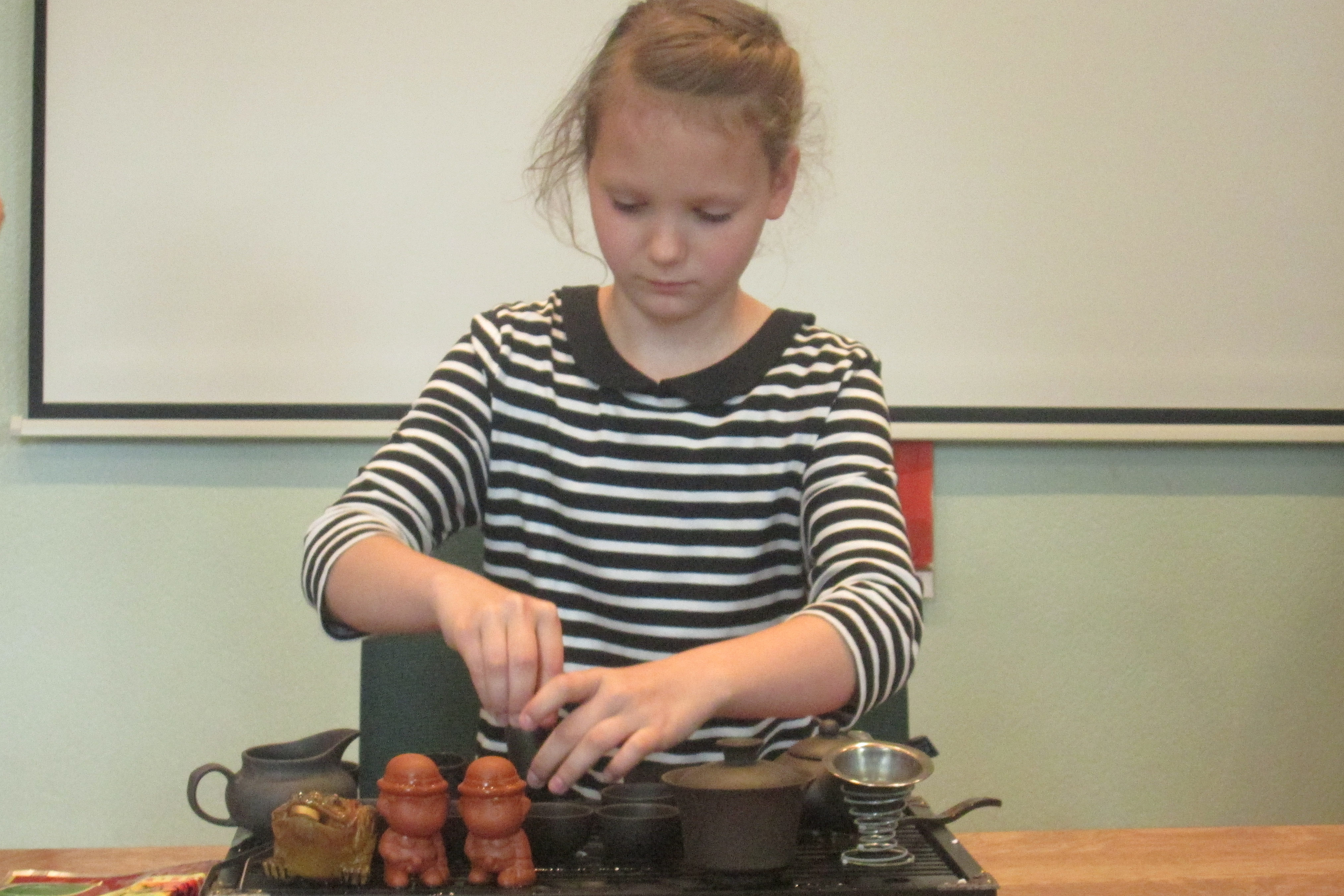 The second part was the demonstration of tea ceremony. Teacher Liang first showed the process of making the tea TieGuanYin to the audience,later,she invited the children to perform on stage to experience the tea ceremony. Step by step , under the guidance of Chinese teacher, children have learned how to make tea and serve it to the audience. They were praised by the audience.