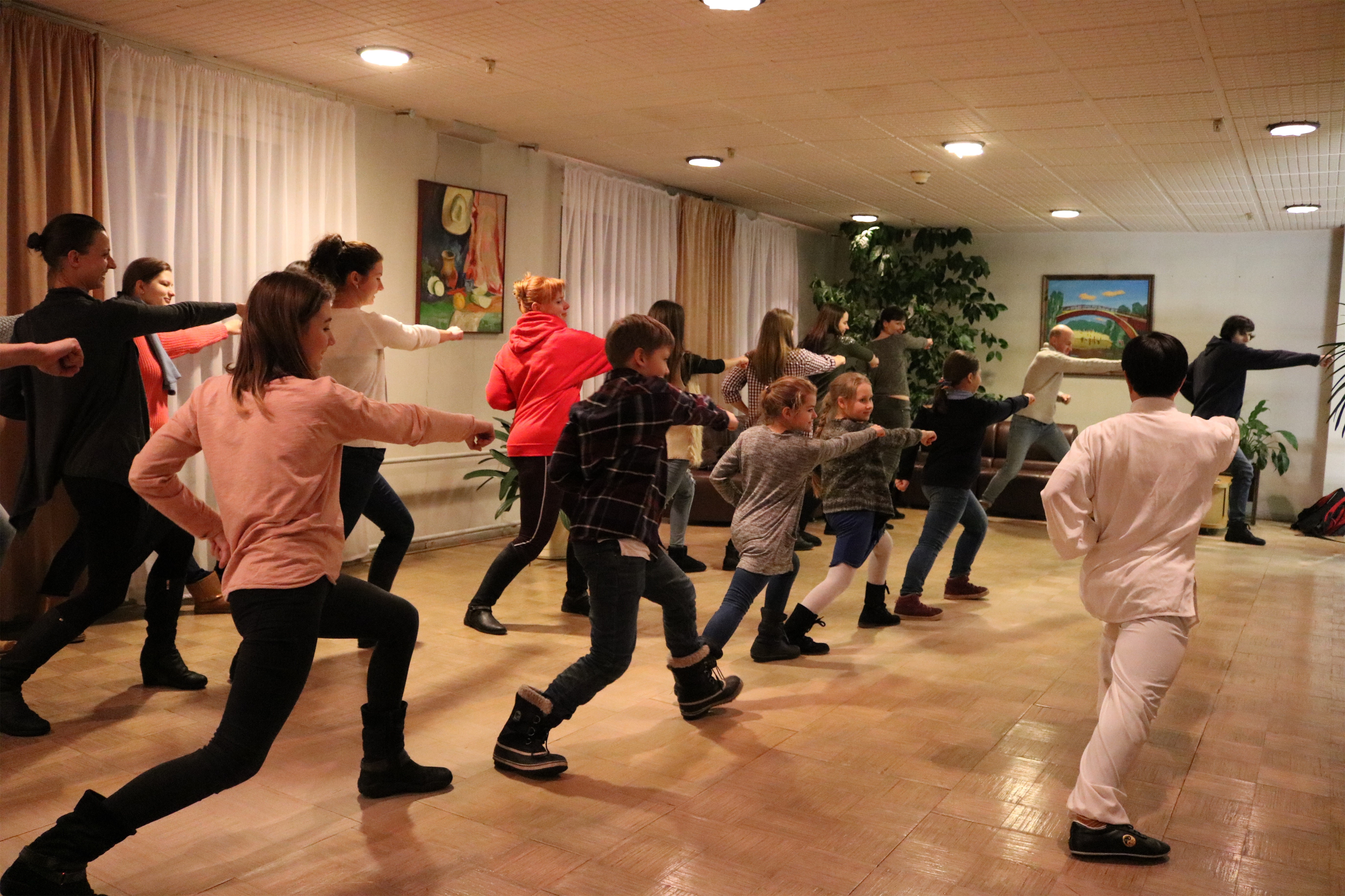 At the very beginning, Mr. Zhang, the martial artist demonstrated Shaolin Boxing, Five-Step Boxing, Taichi Quan and Taichi Fan to the students. Vigorous and flexible movement and humorous instruction attracted the students and won their applause. After warm-up, the martial artist introduced and tutored 5 basic footwork and Five-Step Boxing techniques. All the students, from pre-teenagers to university students to parents, followed closely to the instructor, tying their best to internalize all the movements.