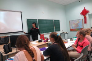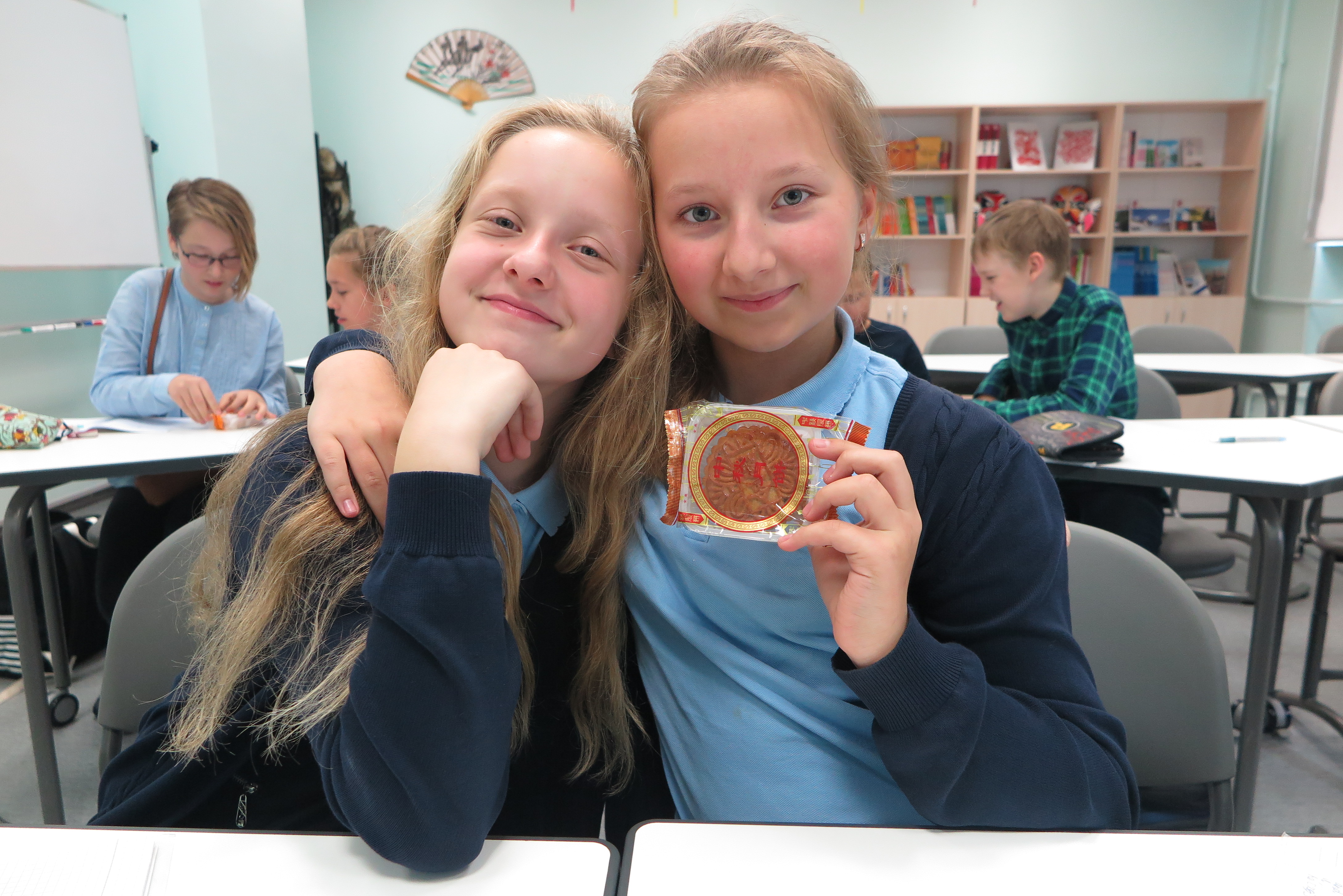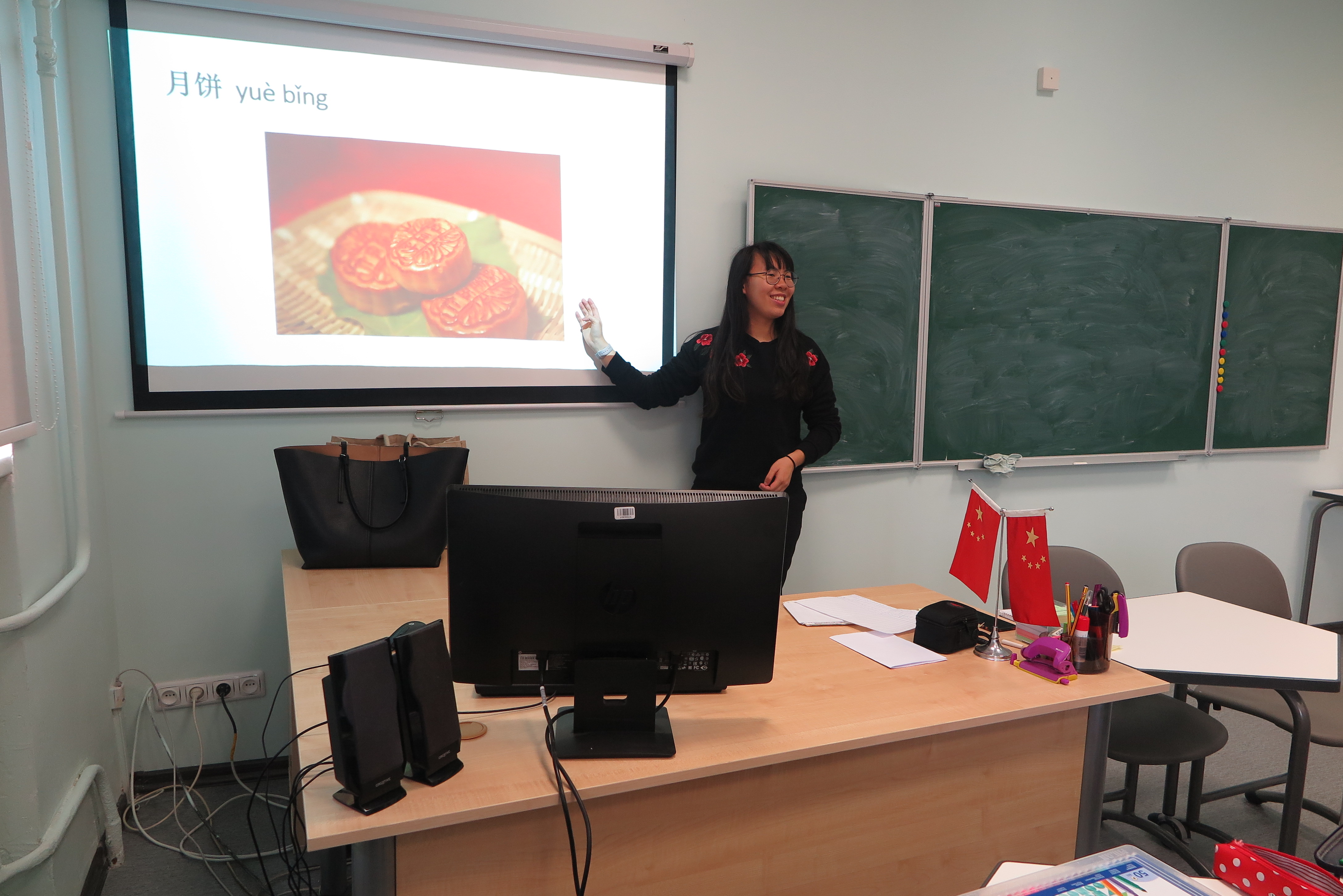 Celebrating from the introduction of the Mid-Autumn Festival, the Chinese volunteer teacher Wu Wei wrote on the blackboard “Happy Mid-Autumn Festival” five characters, and with Pinyin and English, Russian translation, and then introduced in Russian about the Mid-Autumn Festival, she taught students to read aloud “Happy Mid-Autumn Festival” in Chinese. After that, the wonderful Chinese music came from the computer, everyone listening to the music while eating the moon cakes and taken pictures.