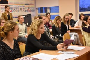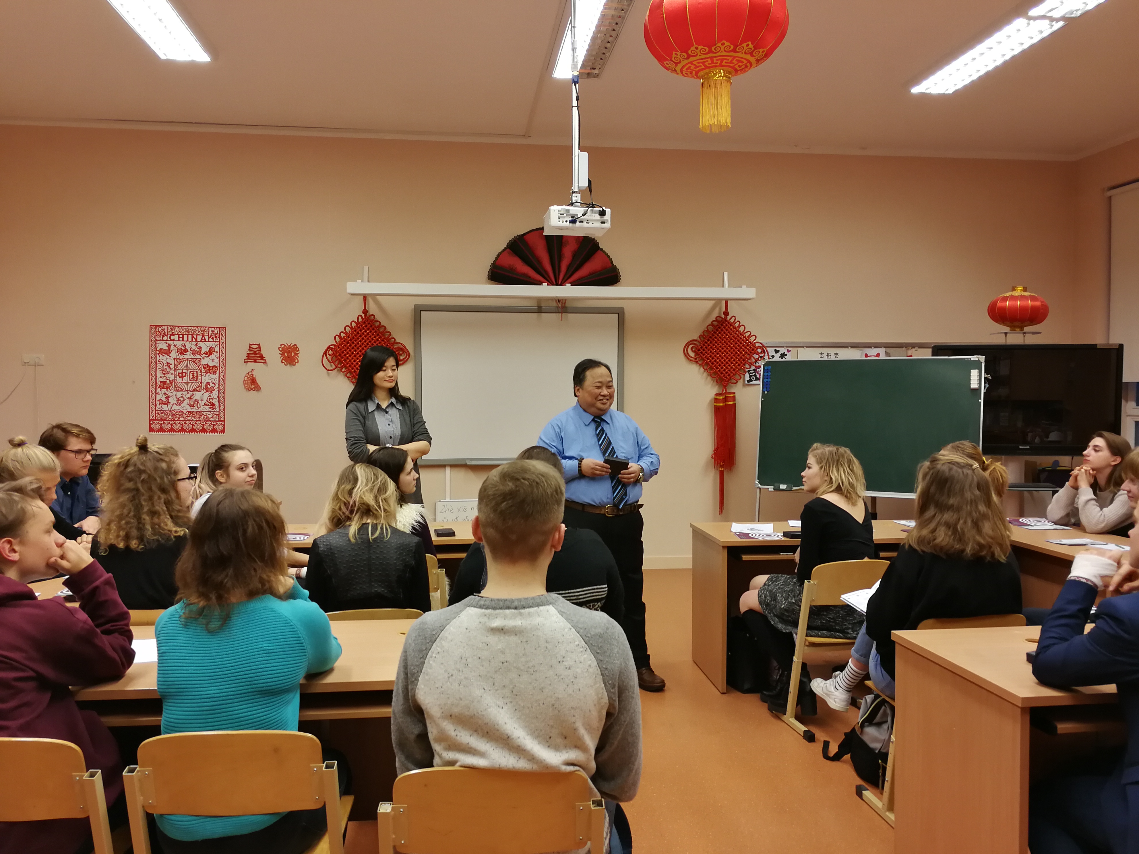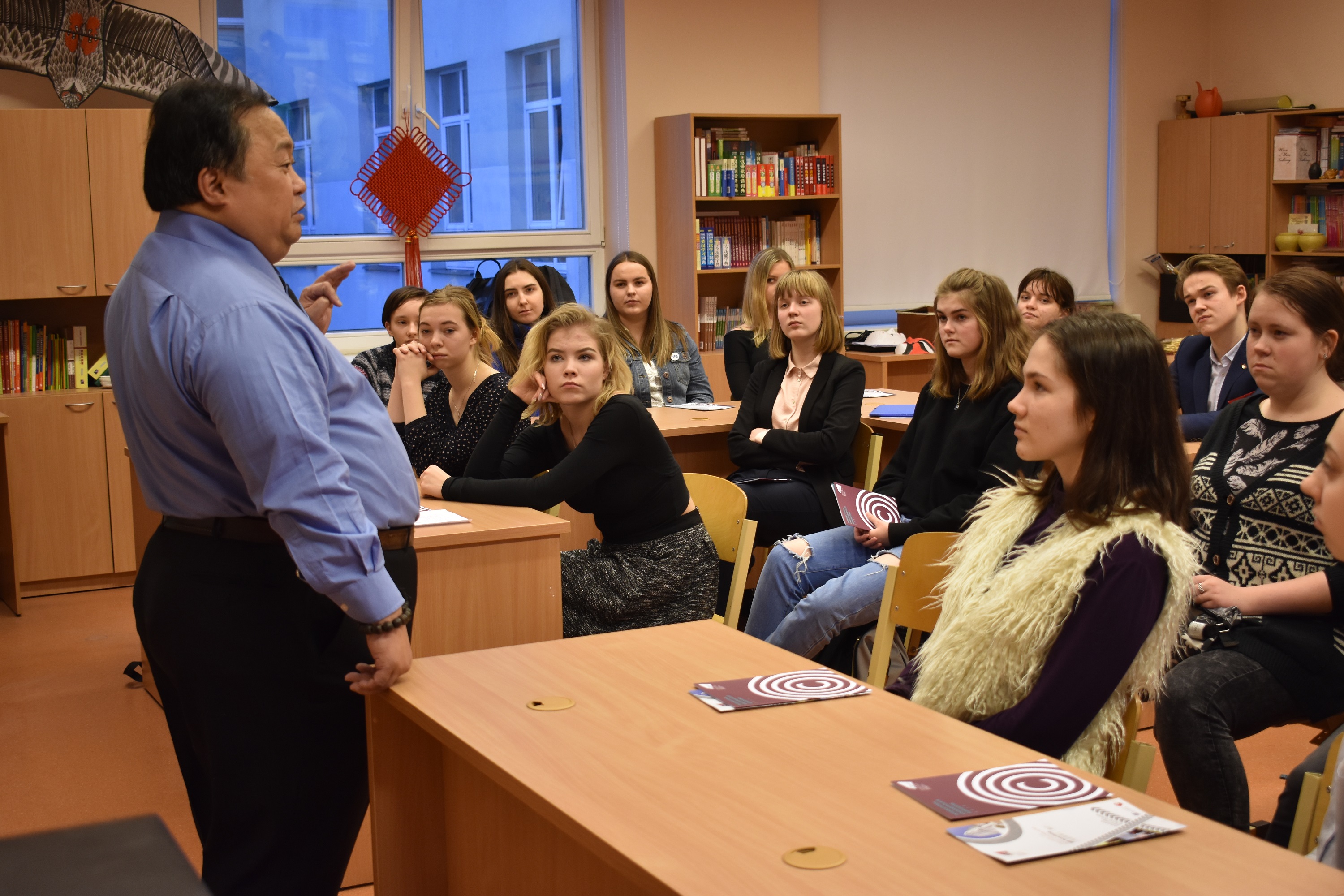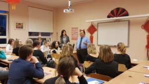 讲座开始前,代表团们向在座的学生们发放了关于香港城市大学的留学宣传手册。讲座由里加文化中学孔子课堂的汉语教师董芳老师主持,由叶世安教授主讲。本次讲座,叶教授向学生们介绍了香港城市大学的有关信息,并着重介绍了商学院的课程设置、结业率等相关情况。叶教授还对香港这个城市做了一定的介绍,包括历史、社会和文化等,此外,叶教授还结合自身的教育经历进行补充讲解。在提问环节,学生们就城市大学的汉语专业、记者专业、体育专业及班级规模等方面提出了不少问题,叶教授耐心、幽默作答,教室里充满了欢笑。
