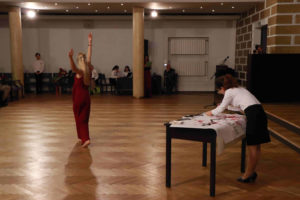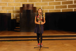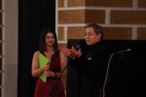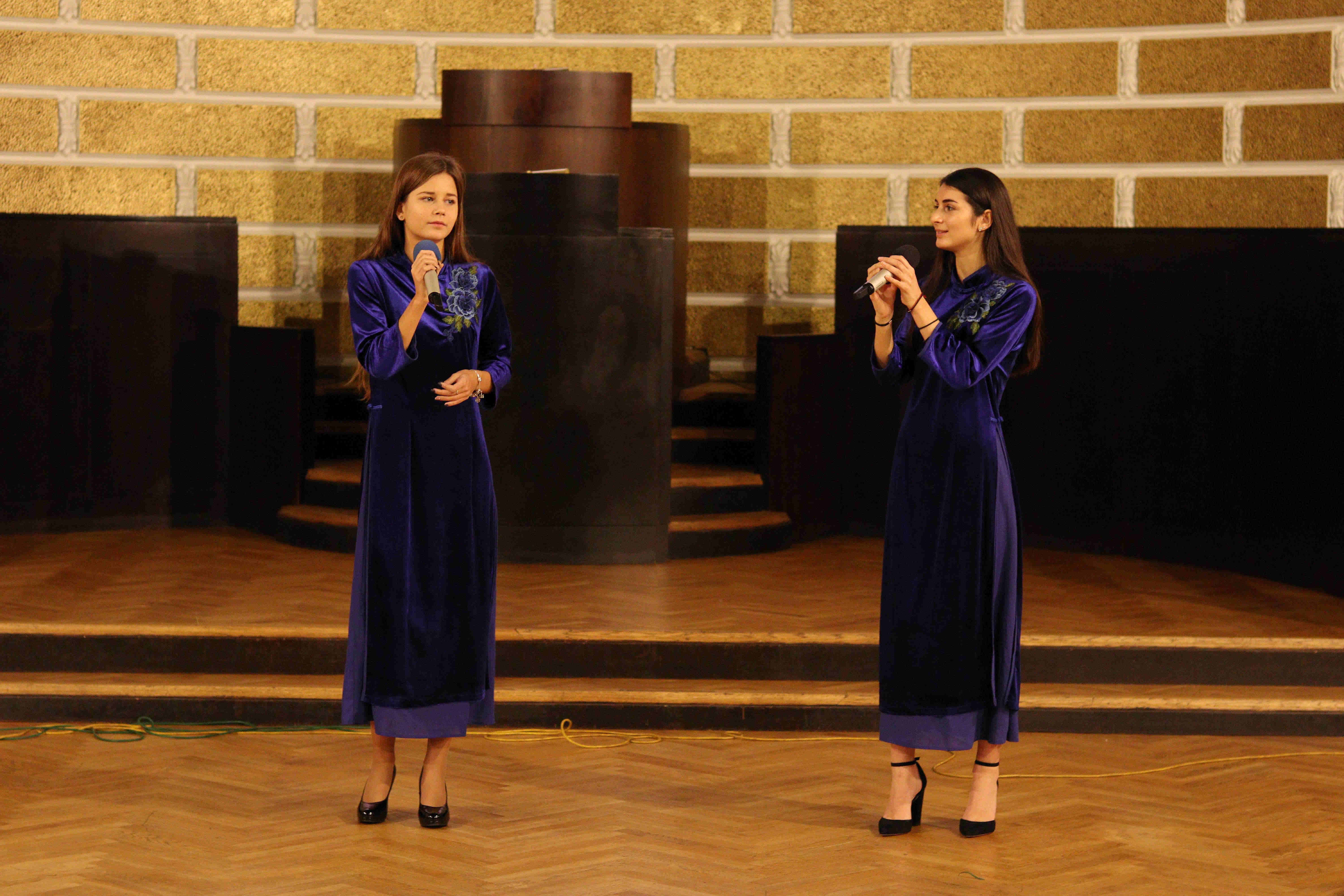 随着电子词典演示完毕,一场诚意满满的文艺表演欢乐开场。汉语志愿者教师尹艳和学生玛丽亚同台表演,用书法和中国舞,诠释“以和为贵”的中国传统美德;中学生贝娜茜和丽莎深情演唱《月亮代表我的心》;汉语爱好者小荷花和安娜一家带来了歌舞节目《朋友》;来自叶尔加瓦的玛莎欢快演绎《青春修炼手册》让现场充满青春气息;来自留华同学会的安娜和丽莎展示了有趣的杯子歌《我做得到》;汉语志愿者教师集体演唱欢乐喜庆的《祝寿歌》和寓意深厚的《好大一棵树》,用歌声表达对贝教授的生日祝福。表演接近尾声,惊喜依旧持续。汉语老师手捧鲜花,还有一本写满祝福的留言册,让贝教授和在场的各位再次心中掀起波澜。贝教授上台发言,再次表达了自己心中的喜悦与感激之情。
