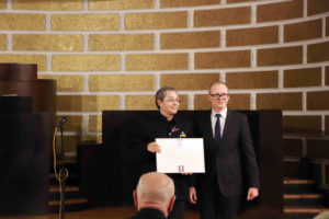 首先孔子学院拉方院长贝德高教授上台致辞,他向在场的各位嘉宾表示热烈欢迎并对大家的关心和祝福表示衷心的感谢。接着拉脱维亚外交部国务秘书Andris Pelšs先生、中国驻拉脱维亚大使馆代办孙应来先生、拉脱维亚教育部副国务秘书Gunta Araja女士、拉脱维亚大学校长穆伊日涅克斯教授、贝教授学生代表Agita Baltgalve教授以及孔子学院中方院长尚劝余教授分别致辞,表示了对贝教授的祝福,并对汉拉大词典顺利发布表示祝贺。国务秘书Andris Pelšs高度赞扬了贝教授对中拉两国关系和拉脱维亚汉学发展做出的巨大贡献,并现场亲自为贝德高教授、语言学家Biruta Jēgere女士、尚劝余教授和于立滨女士授予政府颁发的“特殊贡献奖”荣誉称号。孙应来代办对贝教授给予了充分的肯定,他表示贝教授是中拉两国友好交往的见证者,友好关系的奠基者和建设者,同时对《汉语拉脱维亚语大词典》电子版这一成果表示赞赏。教育部副国务秘书Gunta Araja女士表示了对贝教授的深切祝福,对他取得丰硕成果表示祝贺,并代表教育部给贝教授颁奖。穆伊日涅克斯校长在致辞中对贝教授多年来对拉脱维亚汉学发展所作出的努力与贡献表示肯定。Agita Baltgalve教授在发言中表达了对贝教授的感激之情,她深情讲诉了贝教授当年教她们学汉语时的点滴温暖与感人故事。孔院中方院长尚劝余教授表达了对贝教授的崇高敬意与深切的祝福。