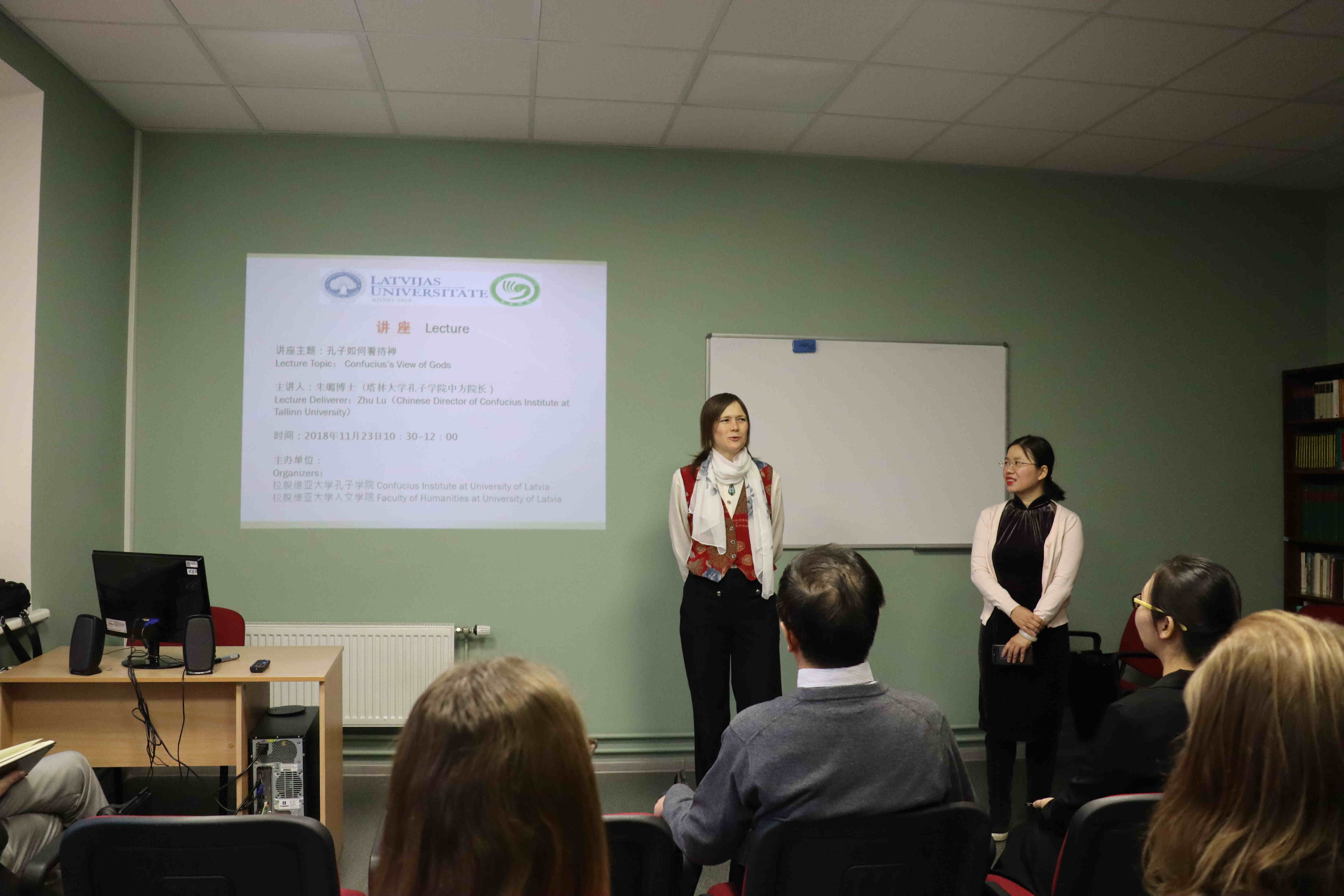 Local time on November 23th, Dr.Zhu Lu, Chinese-side Director of Confucius Institute at Tallinn University , visited the Confucius Institute at Latvia University  and gave a lecture on Confucius’s View of Gods. Prof. Agita Baltgalve, Research Director of Asian Cultural Center at Latvia University, Pro.Leons Taivans from the Faculty of Humanities of Latvia University, Pro.Wang Baohua from South China Normal University, Chinese Teacher Wang Qiongzi, Volunteer Chinese Teachers and other nearly 30 people participated in this lecture.