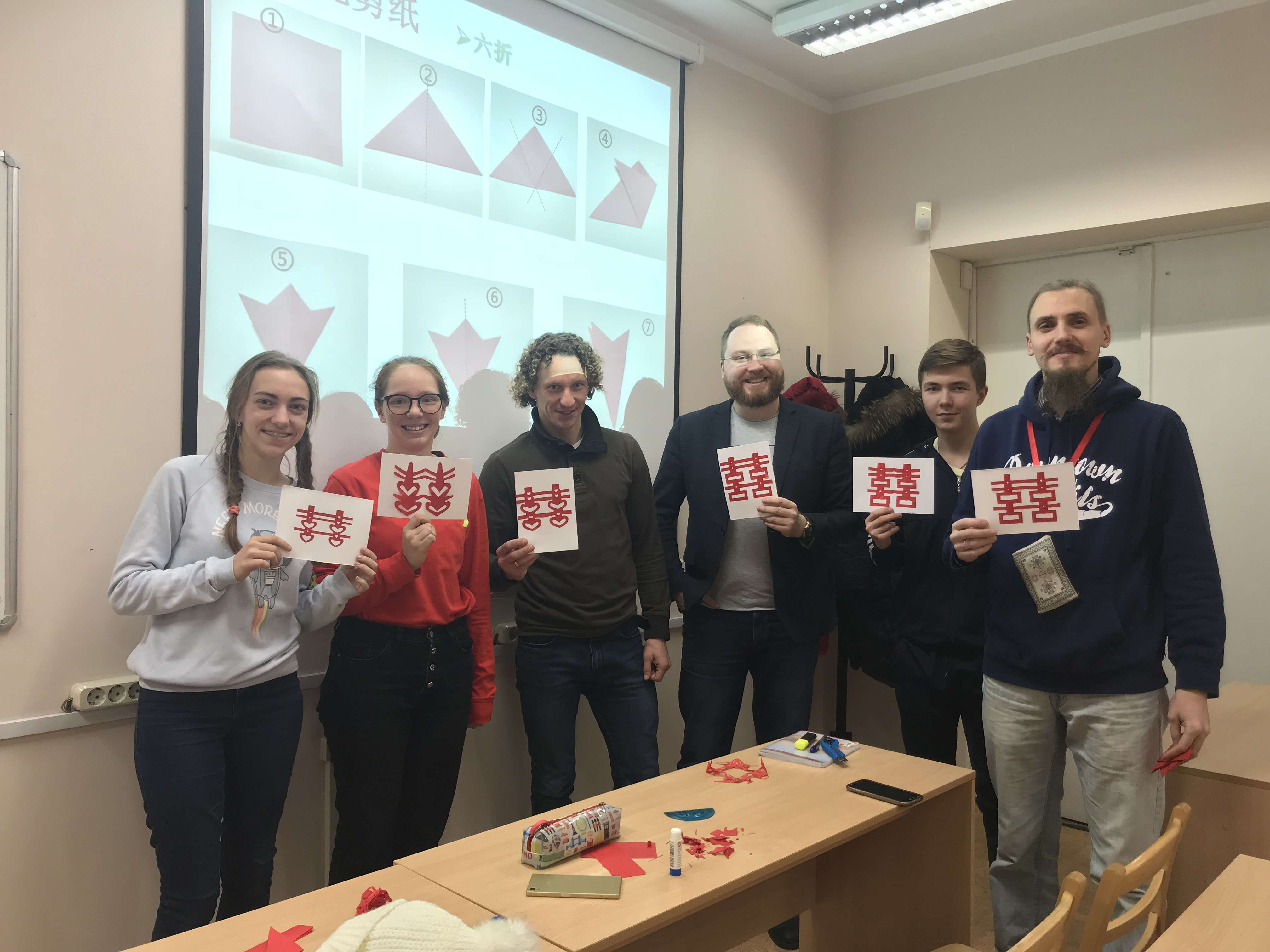当地时间2018年11月29日、12月3日,交通与电信大学的汉语志愿者教师王昕分别和两个汉语班级的学生们一起体验了中国传统文化——剪纸。