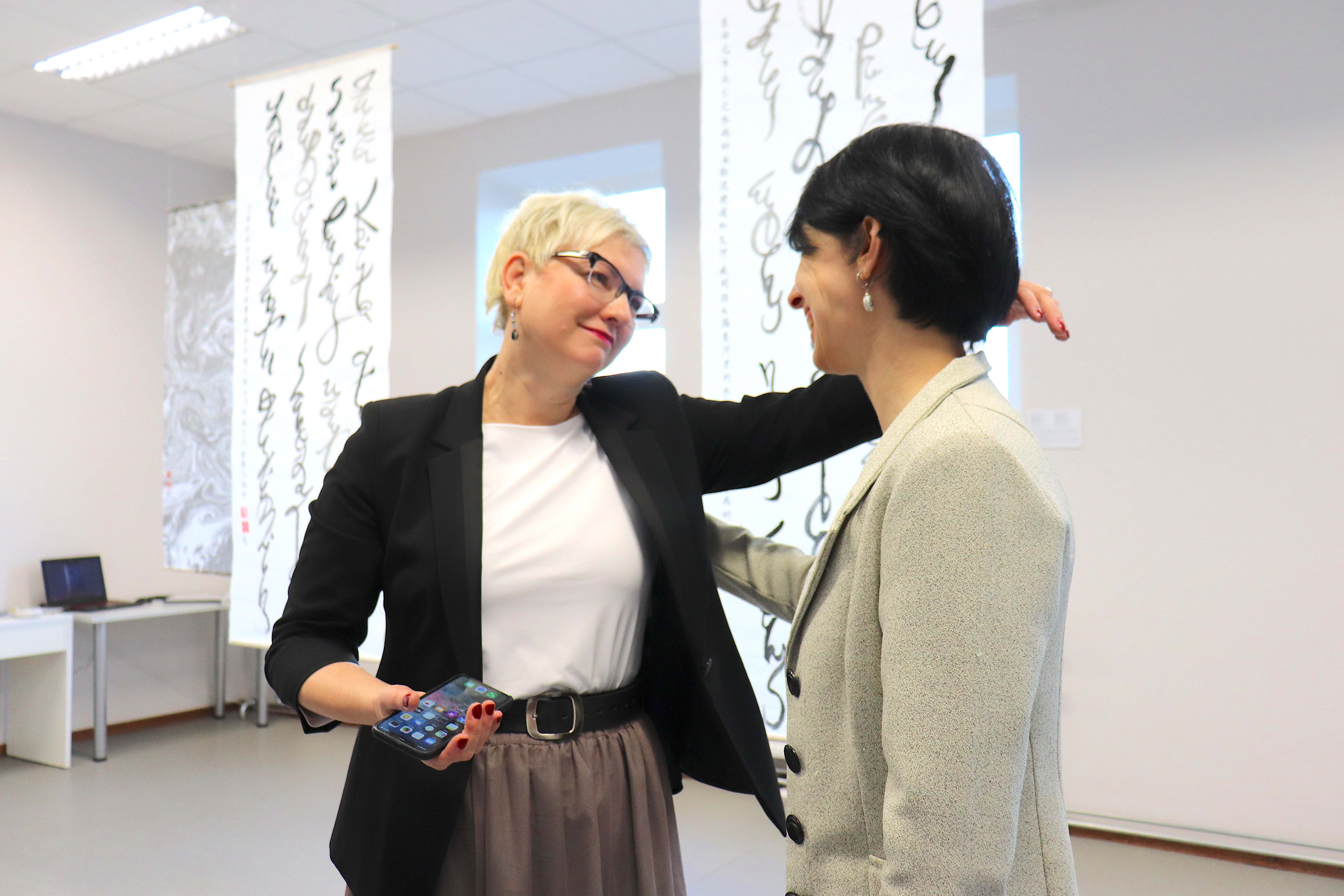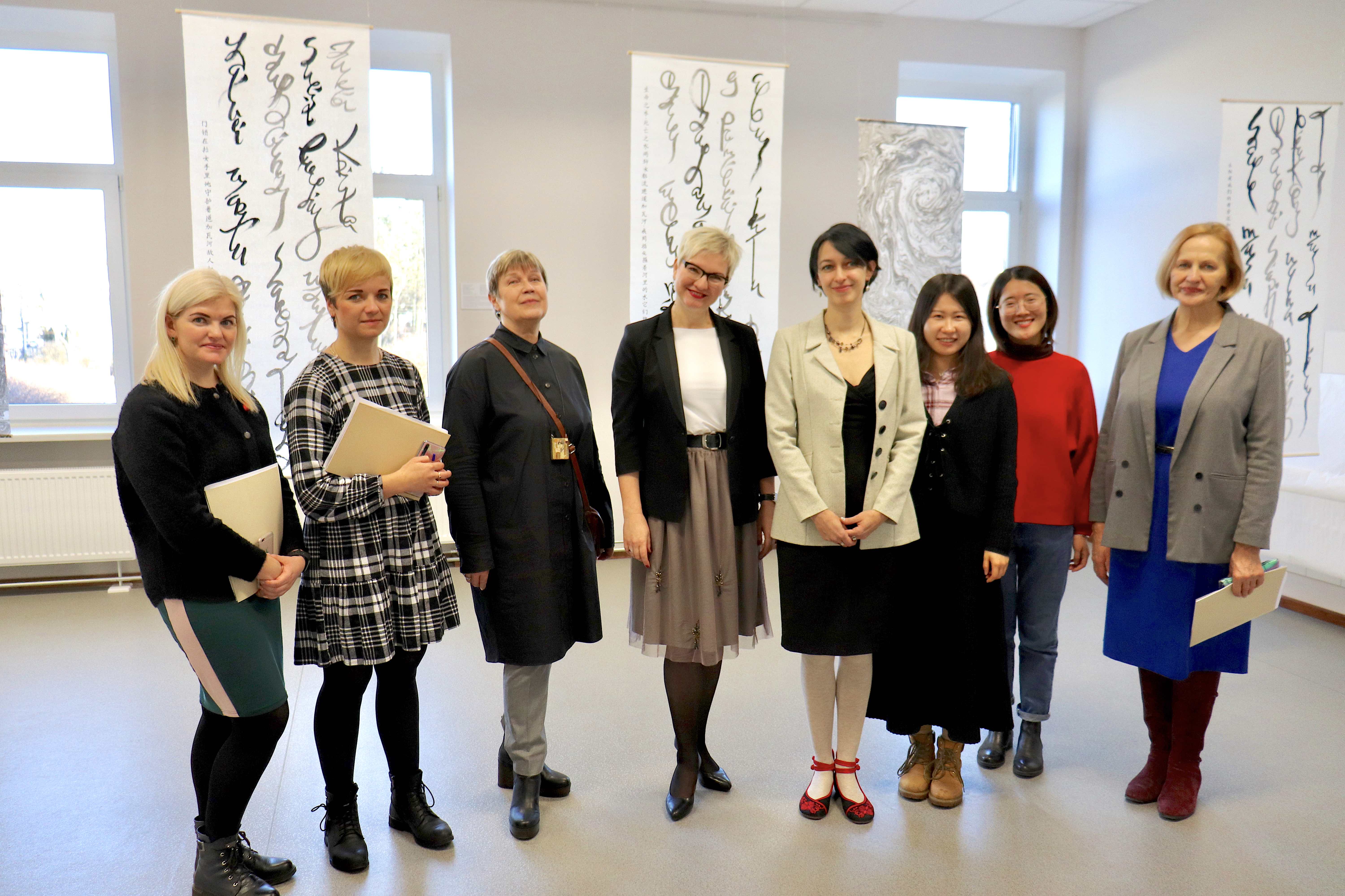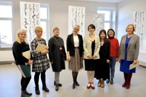 At 11 am local time on January 17th, the graduation exhibition of “The Calligraphic Abstractions of the Daugava River” by Bai Kaixia(Jekaterina Belajeva) was held at Daugavpils University. The dean from the Faculty of Music and Arts at Daugavpils University, some teachers and students, and two Chinese teachers participated in the exhibition.
