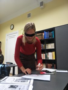 What’s more, there are game and Chinese culture experiencing activity. The game called “You are my eyes”. Students worked in pairs to write the correct pinyin on the characters of “新“年”“快”乐”. The fastest group would be the winners. At last, students learned paper cutting. They chose papers in different colors to cut Chinese character “春(spring)”.They enjoyed a lot.