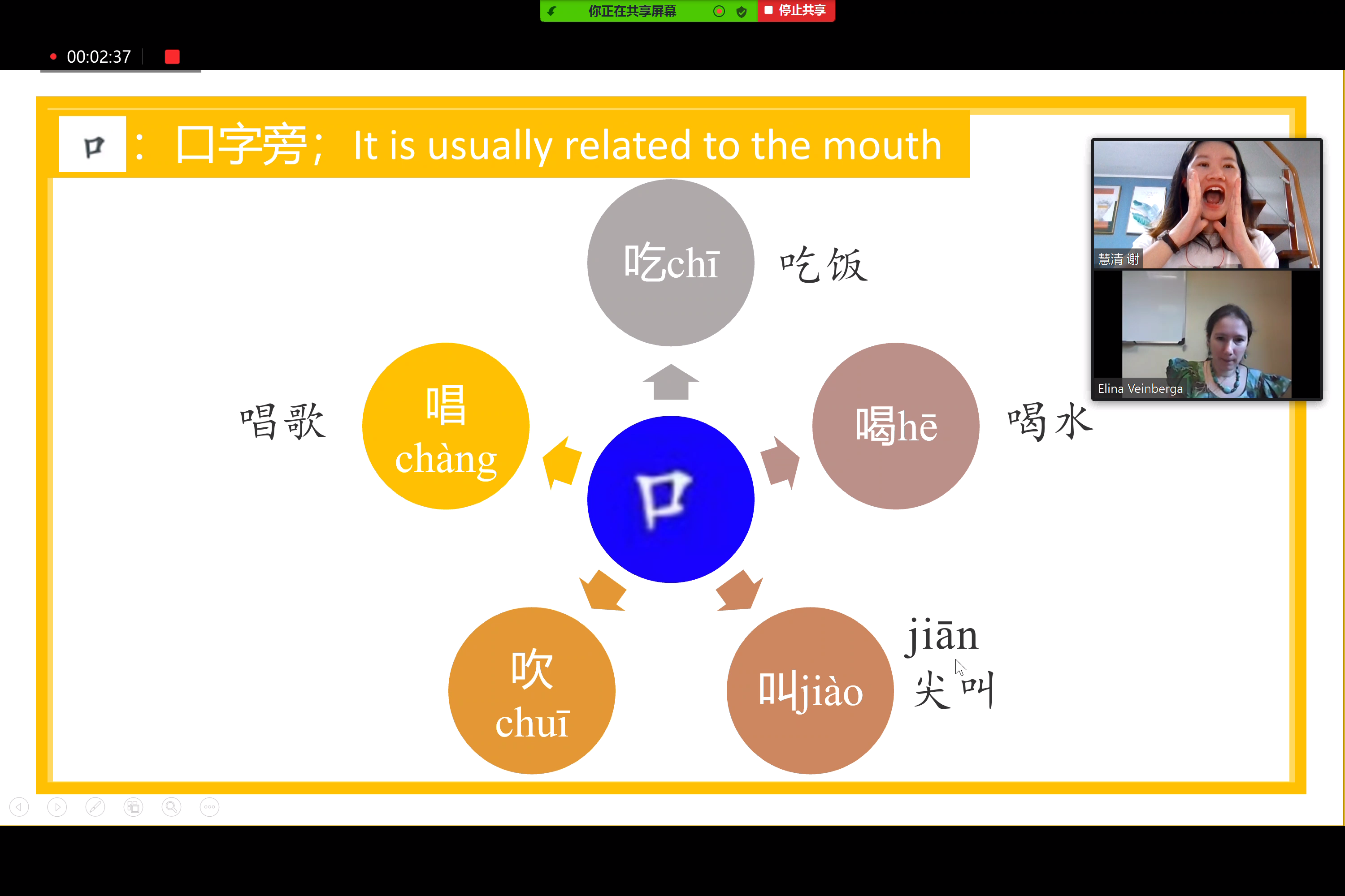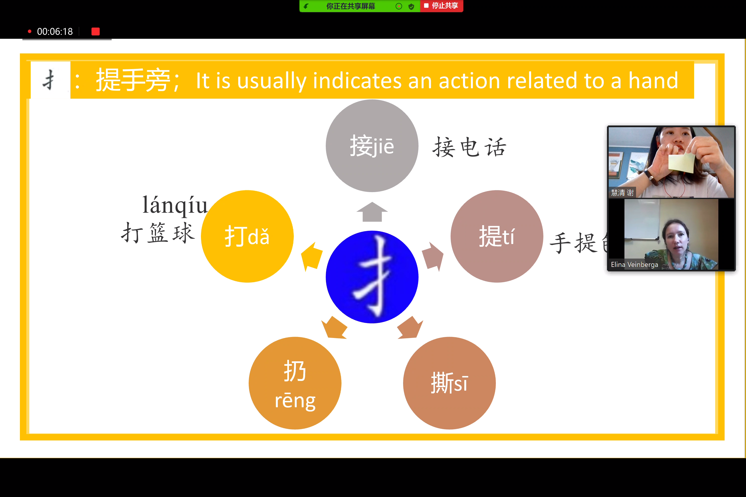 在正式开始授课之前,师生互相提问认识了解了彼此。之后,汉语教师采用游戏等方式对学生已学知识进行了简单的复习总结,其中内容包括词汇、语法、语音和汉字部分。值得一提的是,汉字部分教师采用了总结类推的方法复习和拓展学生的词汇量,这一方法受到了学生的喜爱,有学生评价它有趣又有用。