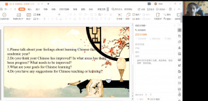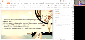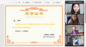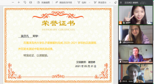 接下来,谢丽婷老师为在期末考试中取得优异成绩的同学颁发了纪念奖状,并请同学们分享了这一学年参加汉语网络课程的感受。其中,来自中级班的卡思博表示,这学年的文化课最令他印象深刻,他从中不仅了解到了更多关于中国传统节日的知识,而且也通过参加丰富的线上体验活动,增强了对中国文化的学习兴趣。优同学则表示,在这个特殊的时期,非常庆幸有这样的机会让自己能坚持学习汉语,这学年自己在汉语词汇方面进步较大,汉字书写需要进一步提升,希望将来能有更多的时间学习汉语。