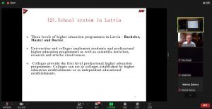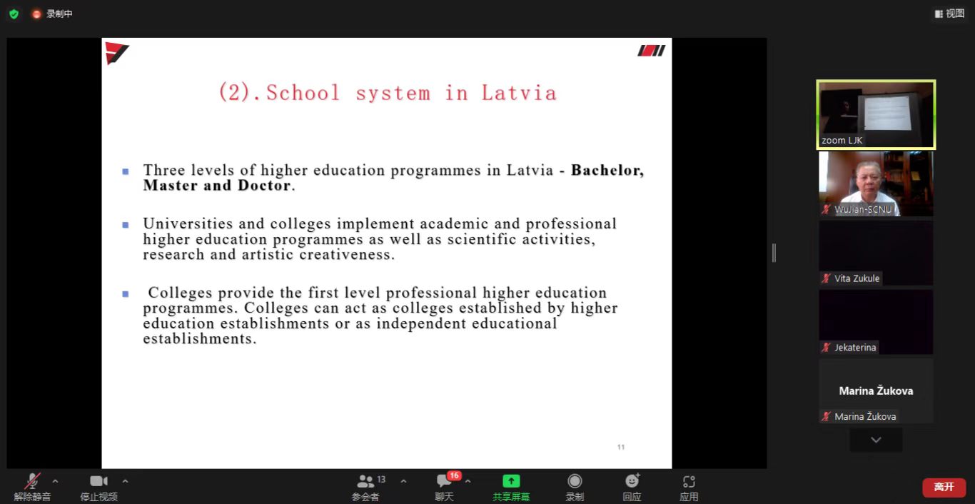 Secretary Mrs. Anastasija Galkina and Chinese volunteer teacher Tang Jing were on behalf of the Vice President of South Normal University Professor Wu Jian to make an introduction about “the Comparison of higher education in China and Latvia”, which contains a comparative analysis on Chinese and Latvian higher education from 7 aspects: management system, school system, entrance examination system, teacher education system, higher professional education, internationalization of higher education and several other important aspects. The presentation aims to deepen the understanding of the higher education systems of both countries with a view to achieving educational, cultural exchanges and international understanding.