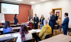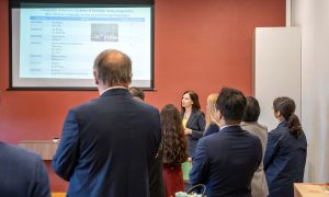 十点整唐松根大使与何东院长一行人在道加瓦皮尔斯大学主楼会面,双方进行友好的问好和交流。道加瓦皮尔斯大学国际公共关系部门主任Jeļena Tamane女士发表演讲,对道加瓦皮尔斯大学进行了介绍。随后由道加瓦皮尔斯大学校长Arvīds Barševskis. Rektor先生、国际公共关系部门主任Jeļena Tamane女士和人文社会学院和语言文学系主任Olga Mickeviča女士以及人文社会学院部门主管Ilze Kačāne女士带领唐松根大使与大使夫人与何东院长及院长夫人一行参观学校。