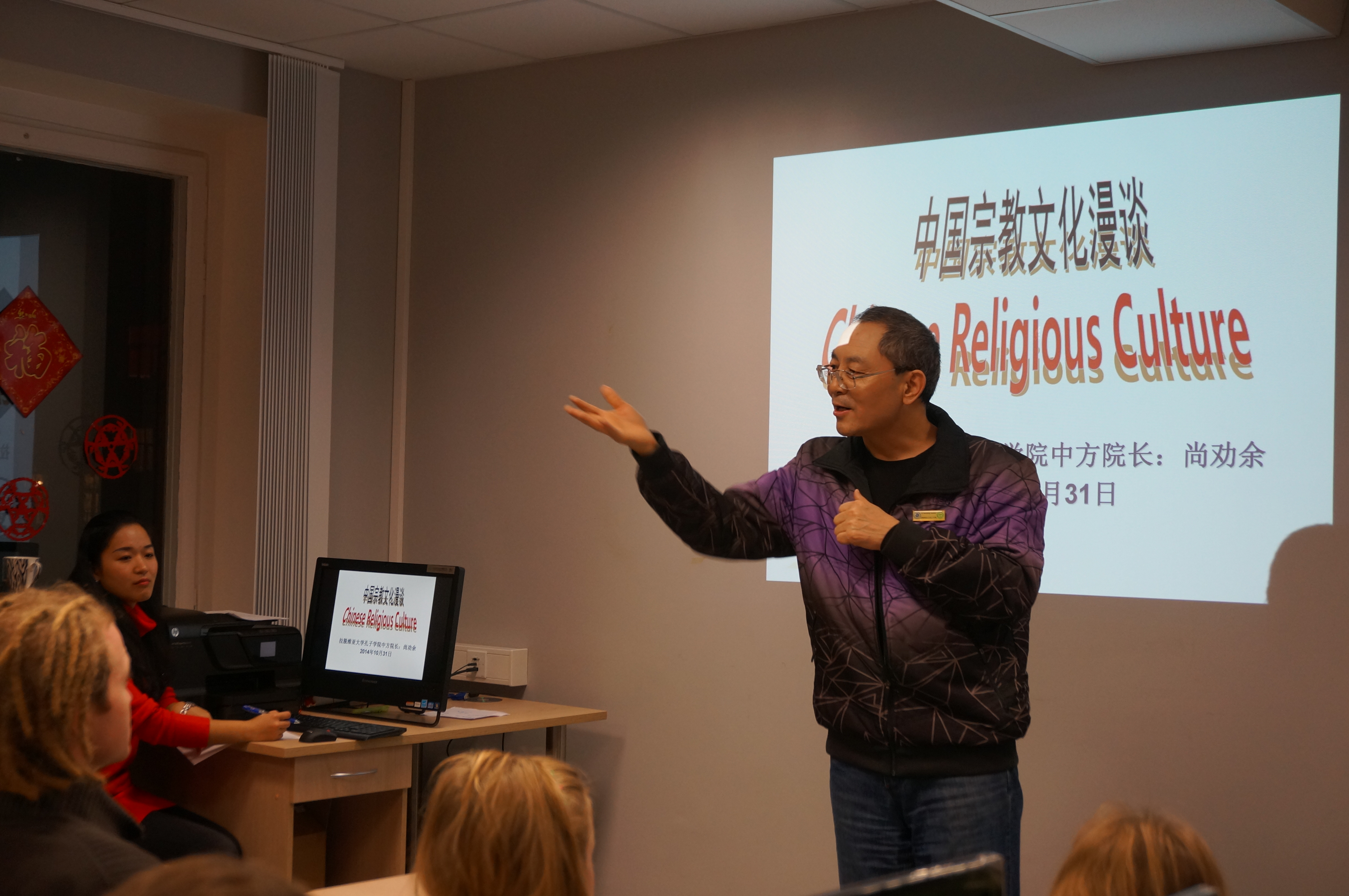 This cultural lecture was a series of lectures launched by Confucius Institute at University of Latvia, mainly about Chinese religious culture. The speaker was the Chinese director of Confucius Institute at the University of Latvia Professor Shang Quanyu. After greeting and introduction, the lecture started. Professor Shang first gave a simple introduction to the 13 kinds of religions in the world through interaction with audience. Then he showed nine themes of this Chinese Religious Culture lecture series, namely: a. The main religions ; b. Confucius study or Confucianism; c. Buddhism; d. Taoism; e. Three religions’ confluence; f. Christian; g. Islam; h. Religion and Chinese vocabulary; i. Current situation of faith and the religion challenge. During the lecture, Professor Shang specially counted these nine themes in to narrow the distance with the audience.