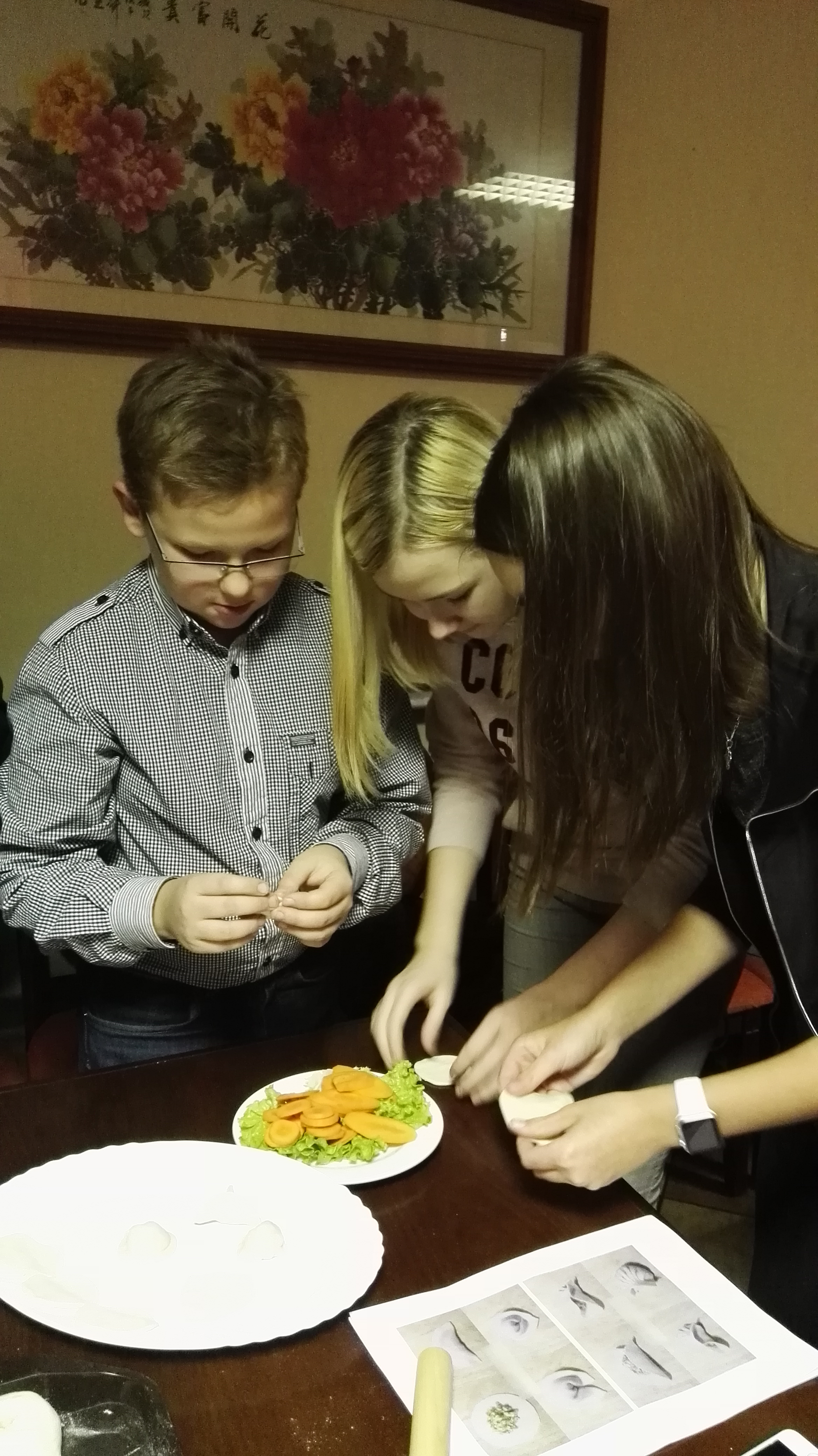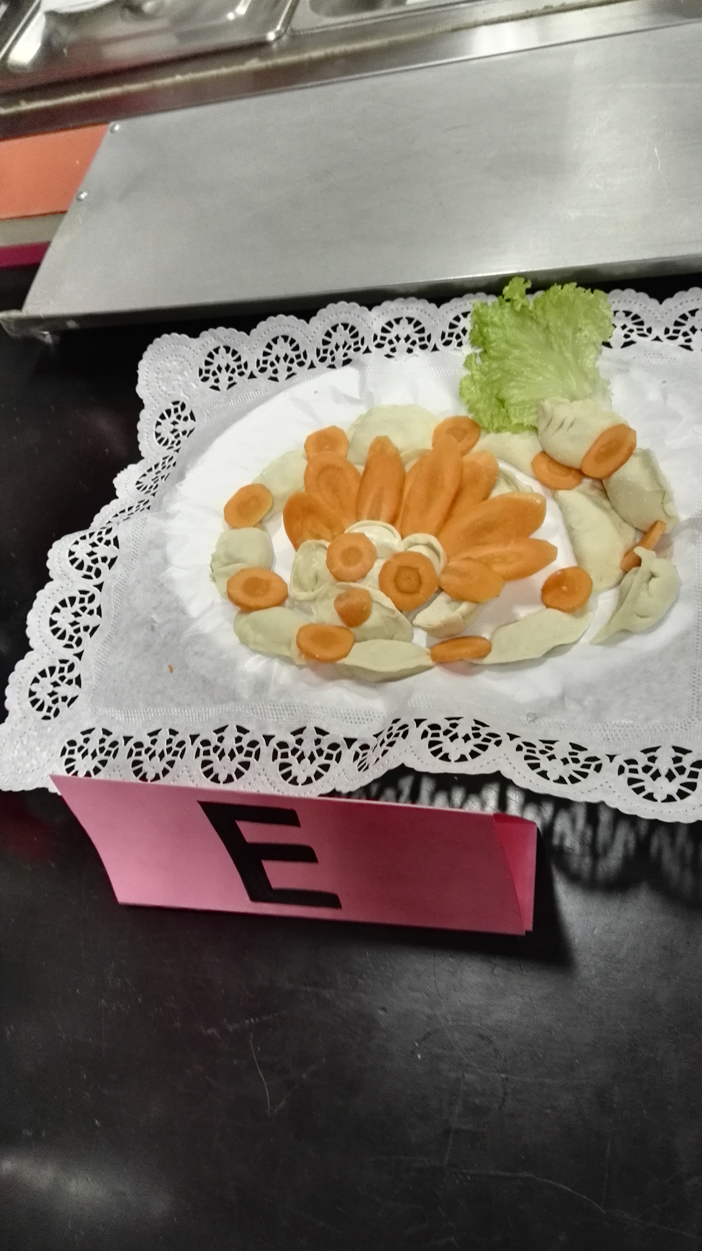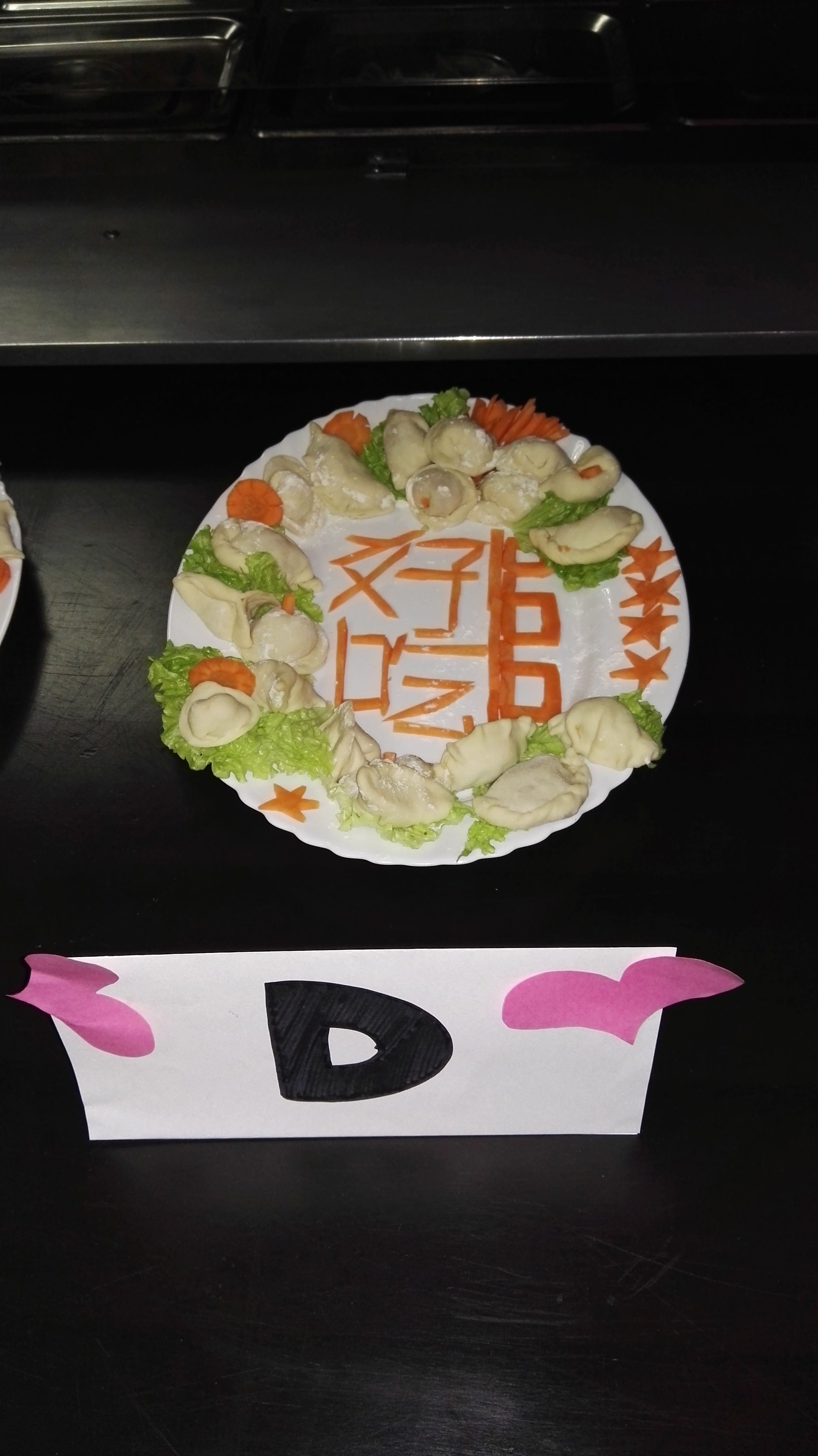 在比赛开始前,志愿者教师介绍了比赛的规则。在一番教学后,赛前分好的五个小组领取了包饺子教程和面团、擀面杖及面粉等材料,热火朝天地开始了包饺子。刚开始的时候,大家面对着眼前的材料还有些手足无措,但在志愿者教师的帮助下,大家渐渐摸到了门道。只见他们用灵巧的手把面团揉成了几根粗粗的面柱,接着小心地把面柱子等分切成了一小团一小团的面坨,压平后用擀面杖细细地擀,一张面皮失败了再接着擀另一张,皇天不负有心人,终于陆陆续续有参赛者擀出了厚薄合适,圆圆的面皮了。面皮备好了,包起来又遇到了困难,不是馅放多了撑爆了饺子的肚皮,就是总也捏不紧,馅每每探出害羞的脑袋,急得参赛者们满脸通红,抓耳挠腮。这时,负责每组的志愿者教师又不厌其烦的亲自示范,带领参赛者们一步步地捏合饺子皮,包出馅料适量,形状美观的饺子。原料备好以后,属于参赛者的竞技舞台正式开演啦,他们得用20个饺子摆出让人看了食指大动,食欲大开的饺子拼盘,不过这可难不倒心灵手巧的参赛者们。他们有的用胡萝卜切出翅膀的形状;有的把胡萝卜切成条摆出汉字的形状,有的还用生菜当成饺子的摇篮。一番热火朝天的忙活下来,五组都递出了风格各异,活灵活现的摆盘,好像一只小鸟飞翔在饺子旁,好像一张滑稽的小丑脸。欣赏了每个组的摆盘后,各组互相投票,决出了饺子包得最好和摆盘最漂亮的一组,优胜组得到了毛绒玩具作为奖品。