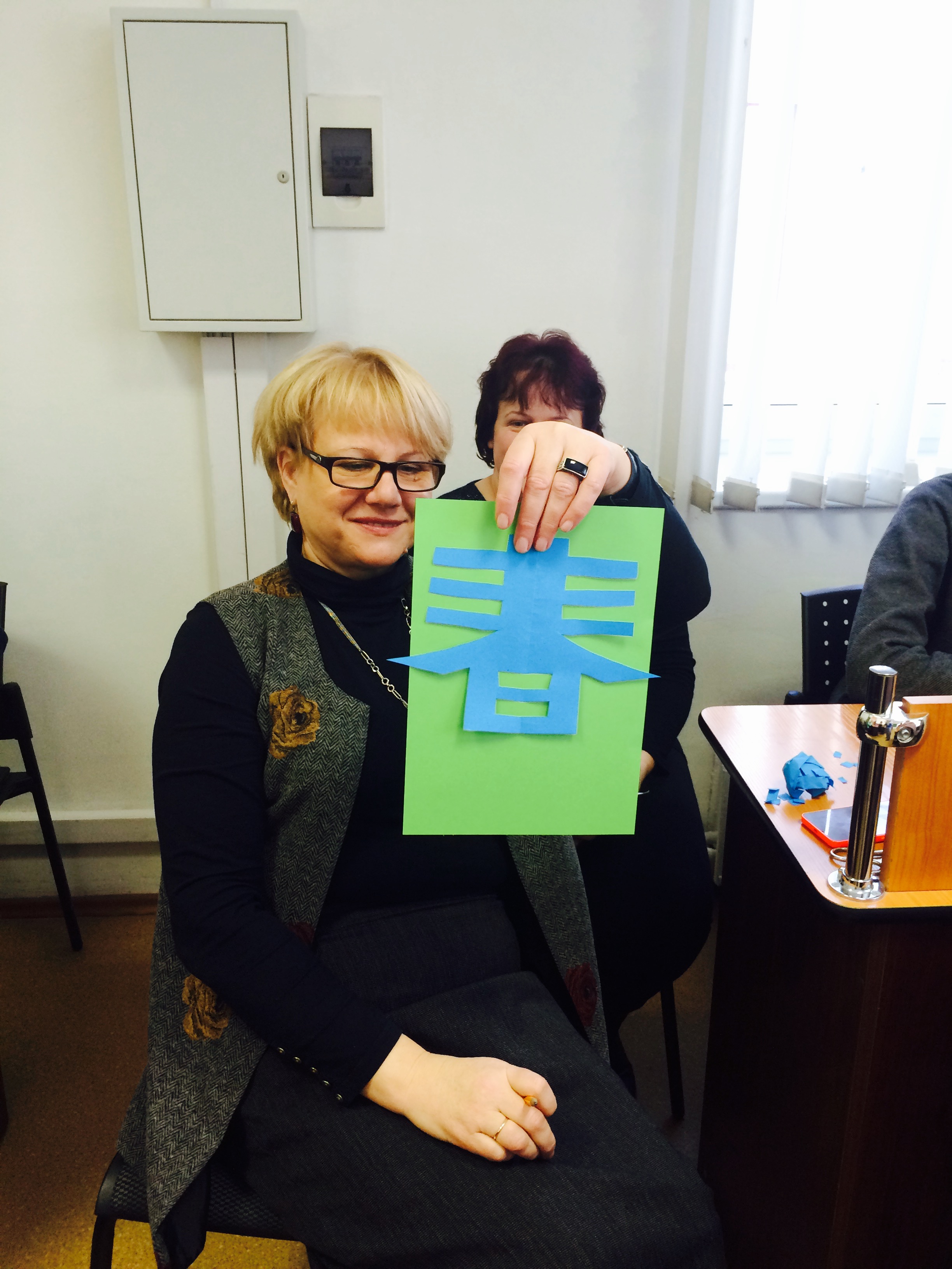 讲座的最后,她向大家讲解了中文中关于春天的一些谚语并告诉大家,中国人觉得“一年之计在于春”,春天象征着美好与希望。然后,她给大家演示了“春”字的写法,并教大家剪“春”字,最后,大家开心地拿着自己的“春”字的剪纸作品合照,希望以后能有更多的机会体验中国丰富多彩的文化。