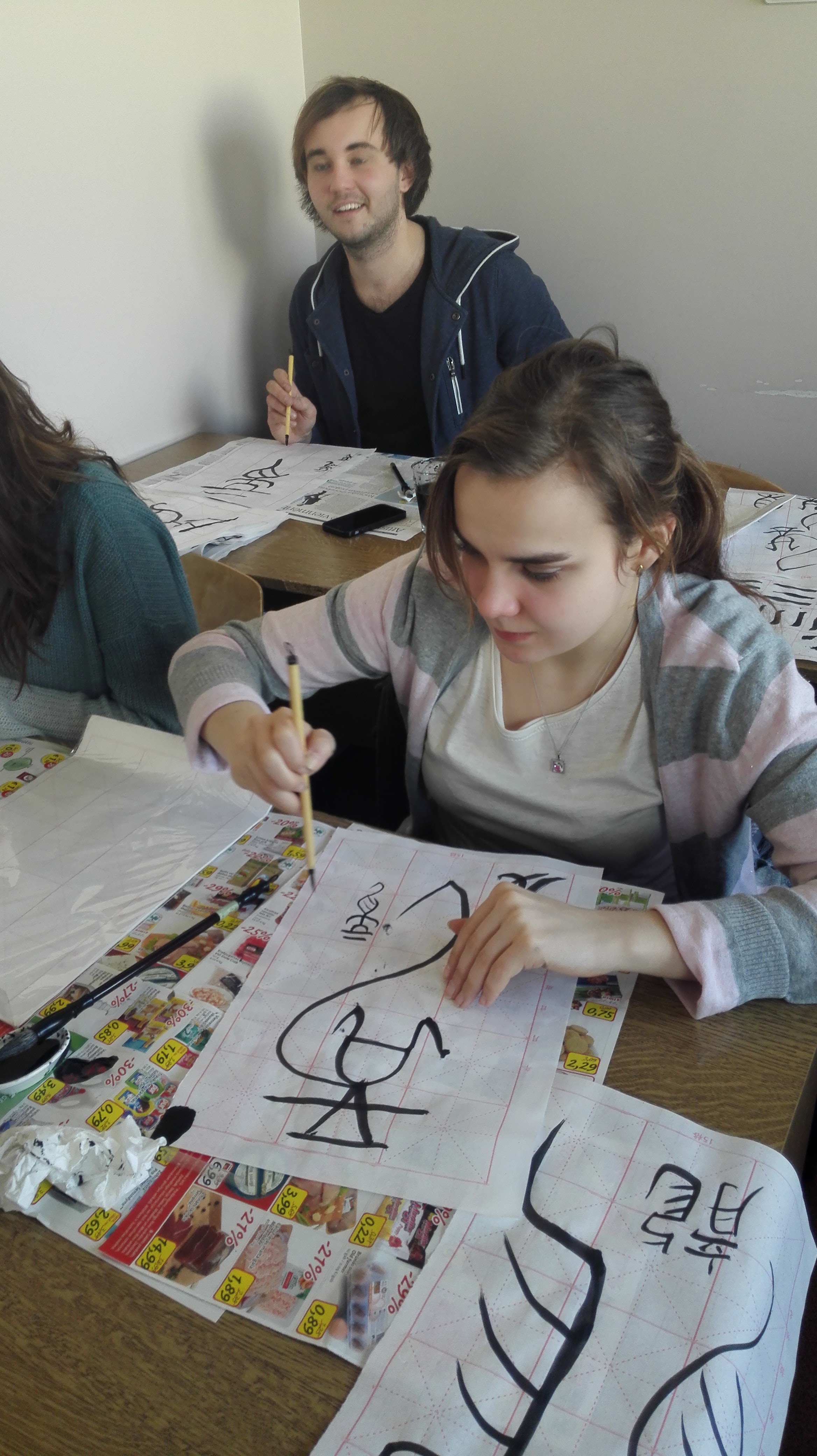 2月24日拉脱维亚电视台的记者Laura Uzule走进了拉脱维亚大学人文学院的书法课。书法是中国传统的汉字书写艺术,经过千百年的创作历史和发展,已成为一门风格独特的艺术。为了让同学们感受灿烂的书法文化,卡琳娜老师介绍了书法的历史,字体和最有名的书法家。