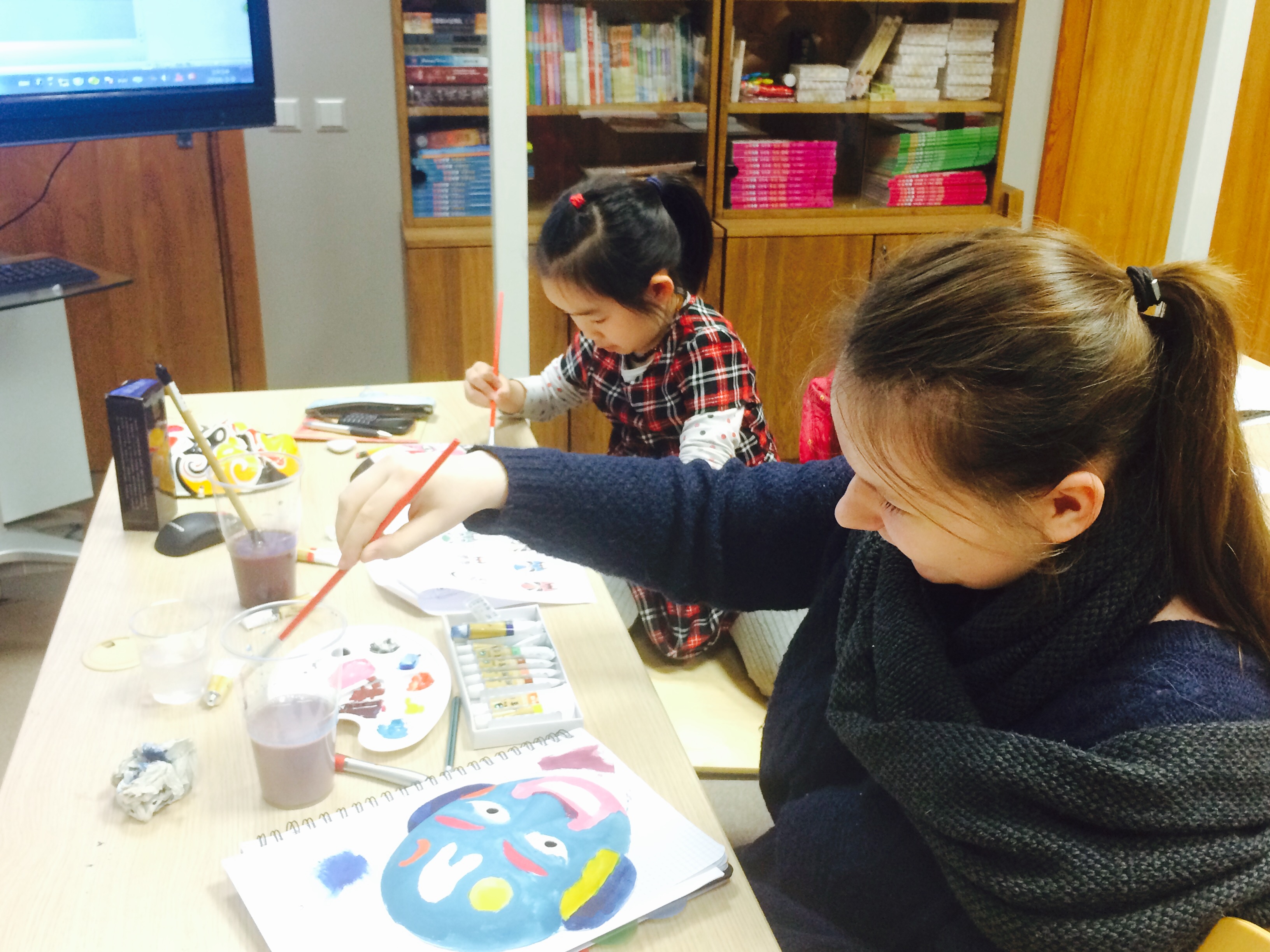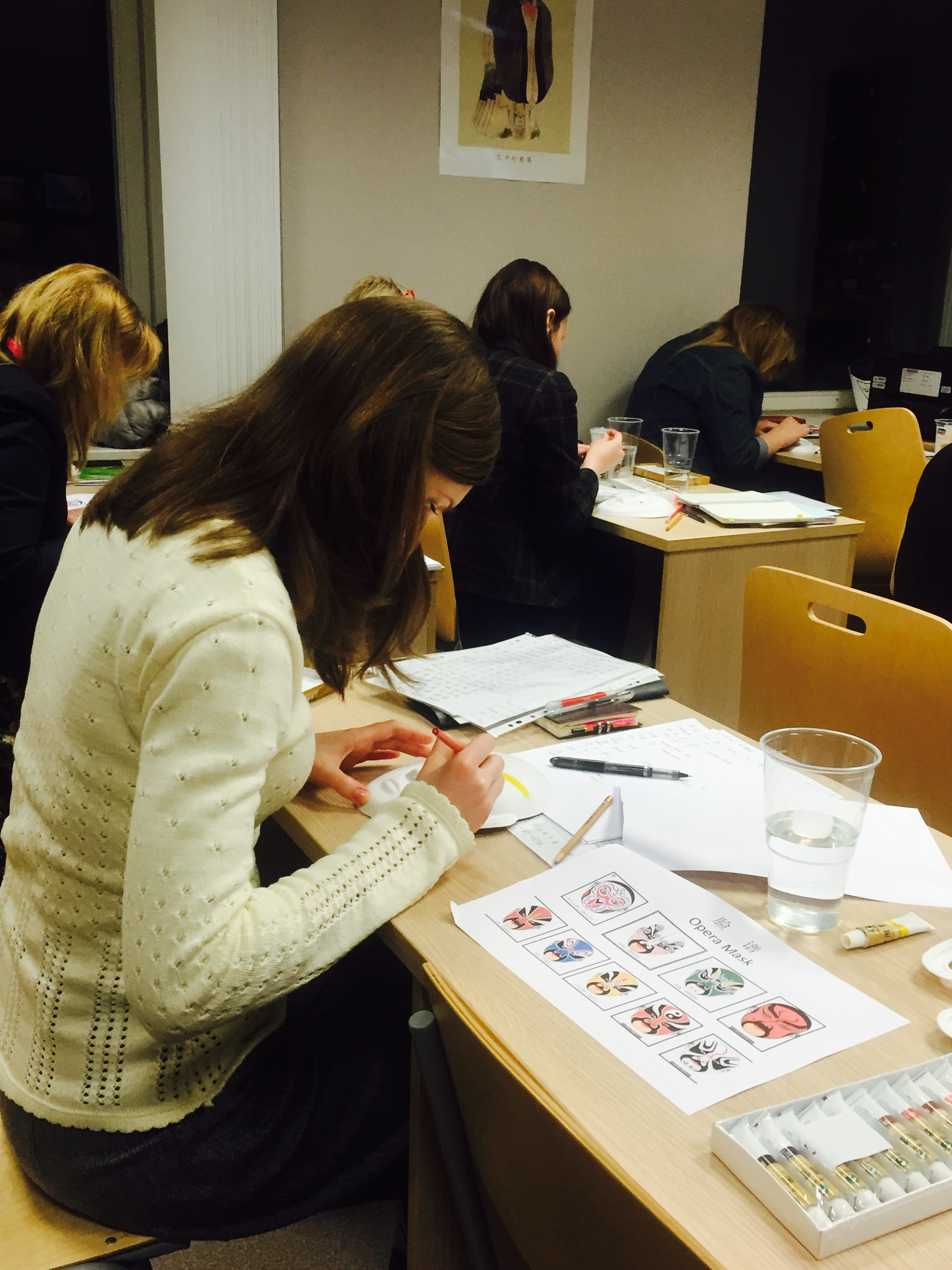 由于初级班的学生刚开始接触中国文化,所以在讲座开始前,汉语教师先给学生放映了中国戏曲的一些名家选段,让学生有了一些感性的认识。当问到学生觉得戏曲最大的特点是什么的时候,大家纷纷对演员的唱腔和妆容做了一定的评价。之后,教师对戏曲发展的历史、概况、著名表演艺术家等方面逐一做了简要的介绍。这样,大家也就不难了解为什么戏曲的唱腔那么独特,演员的妆容又是为何那么夸张了。为了让学生有进一步的体验,教师拿出了中国画的颜料、画笔和空白脸谱,让大家尝试着画出自己心目中的人物形象。