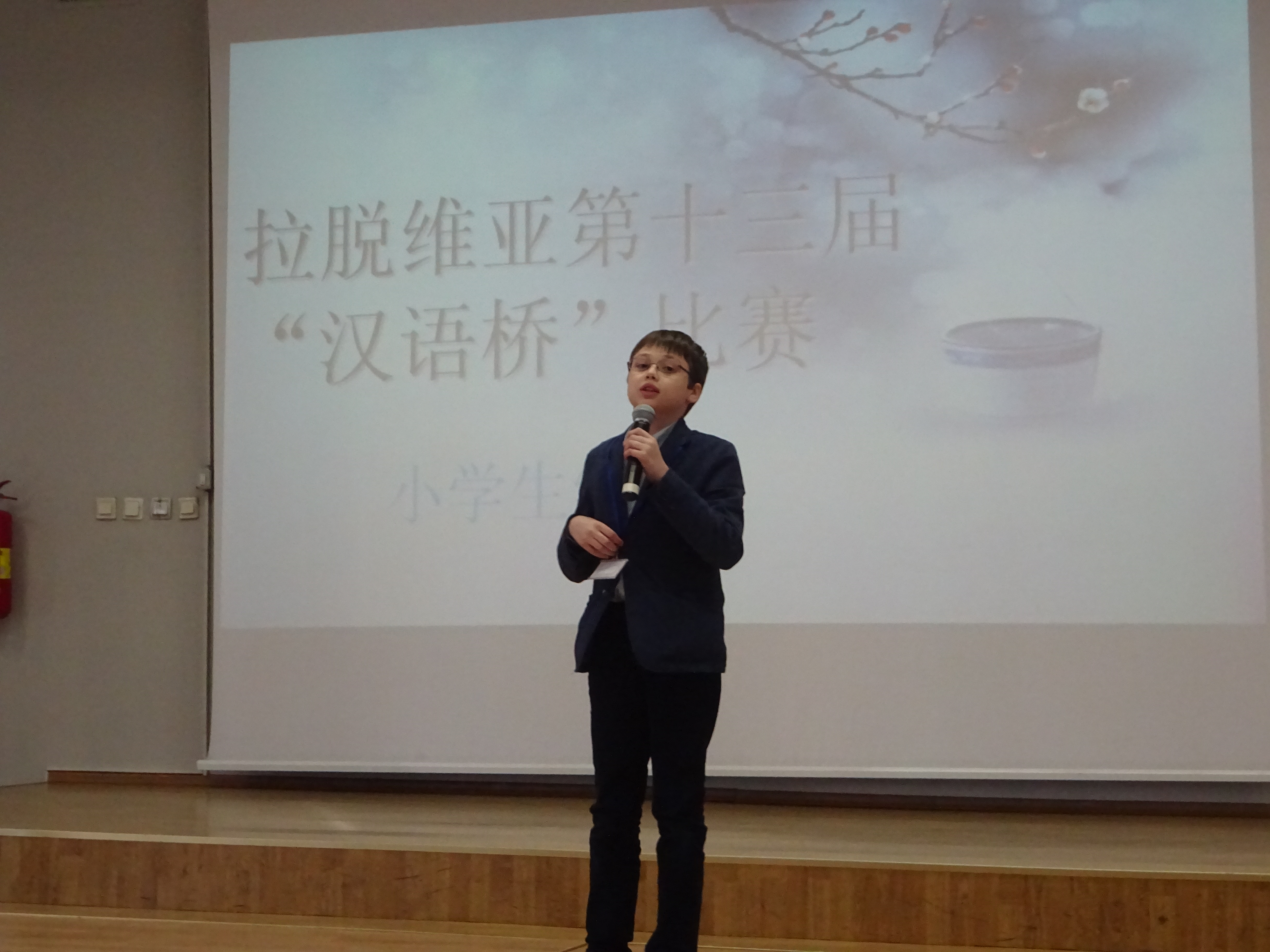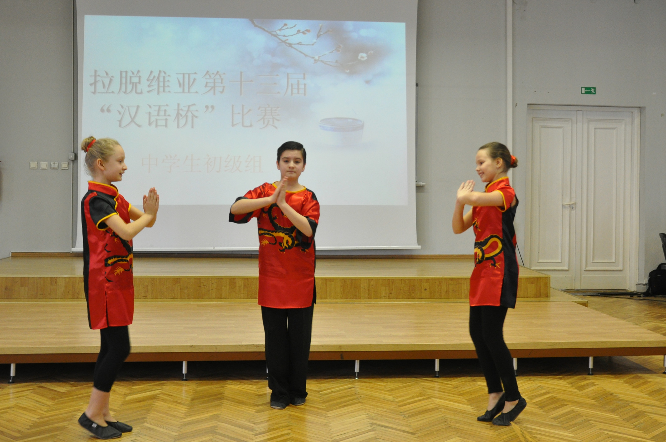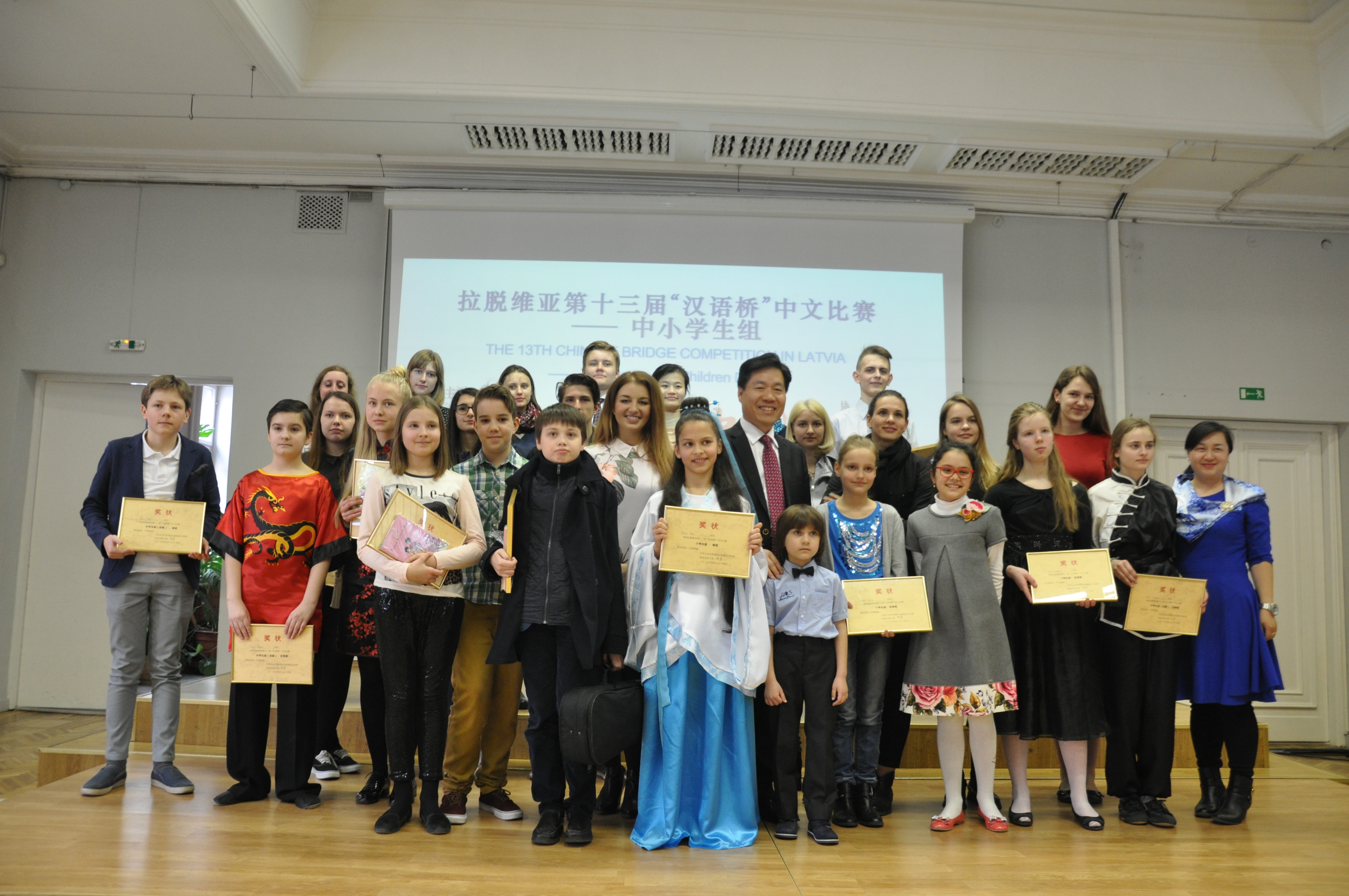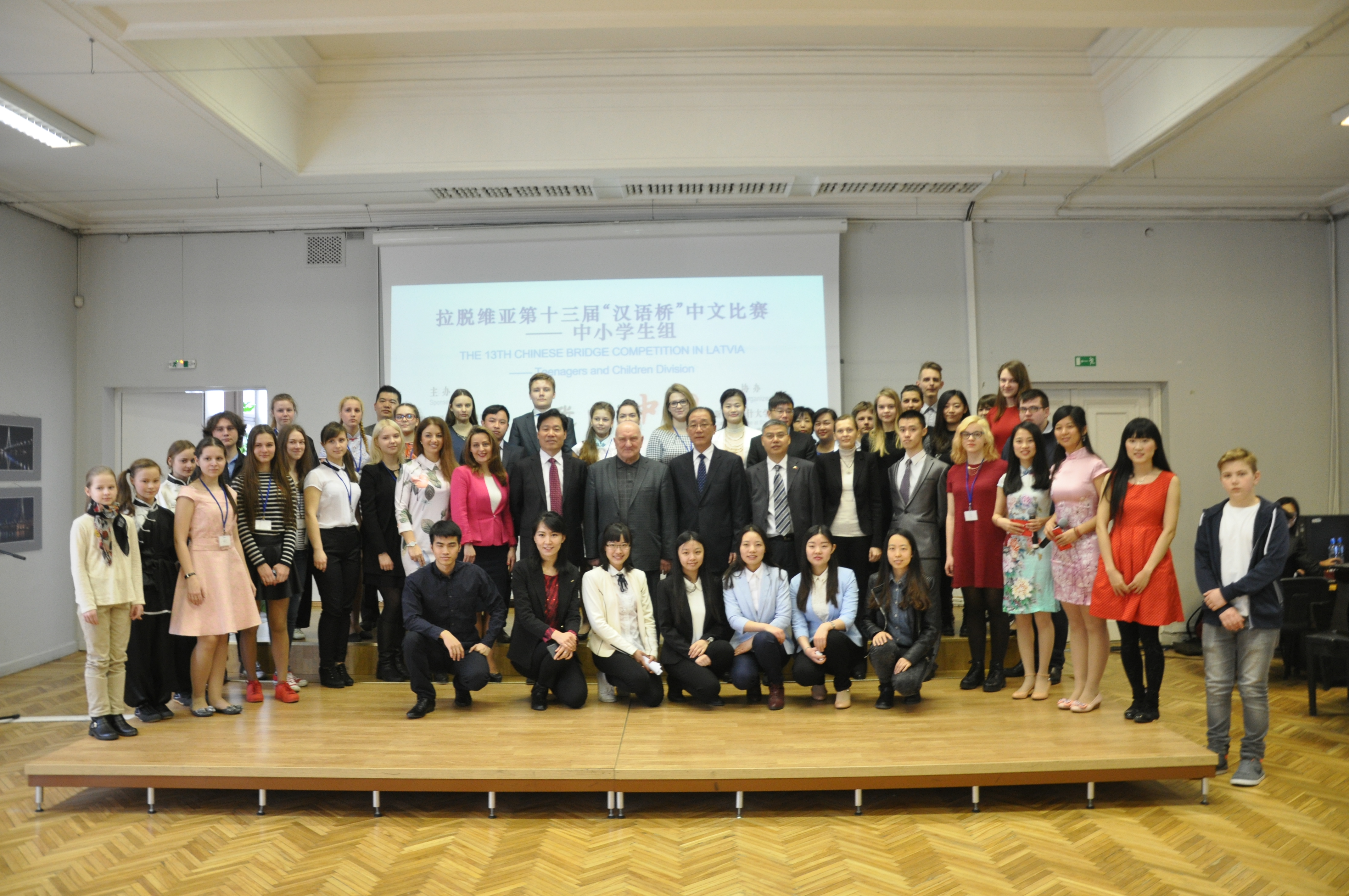 2016年4月8日,在中国国家汉办(HANBAN)所设“汉语桥”基金支持下,拉脱维亚第十三届“汉语桥”中文比赛中小学组决赛在里加理工大学举行,此次决赛由中国驻拉脱维亚大使馆主办,拉脱维亚大学孔子学院承办,斯特拉京什大学孔子中心、里加文化中学、里加第34中学和斯密尔提恩中心中学协办。拉脱维亚大学孔院外方院长、著名汉学家、汉语教师及在校大学生和其他汉语爱好者、新闻界友人等150余人参加并观摩比赛,比赛取得圆满成功。