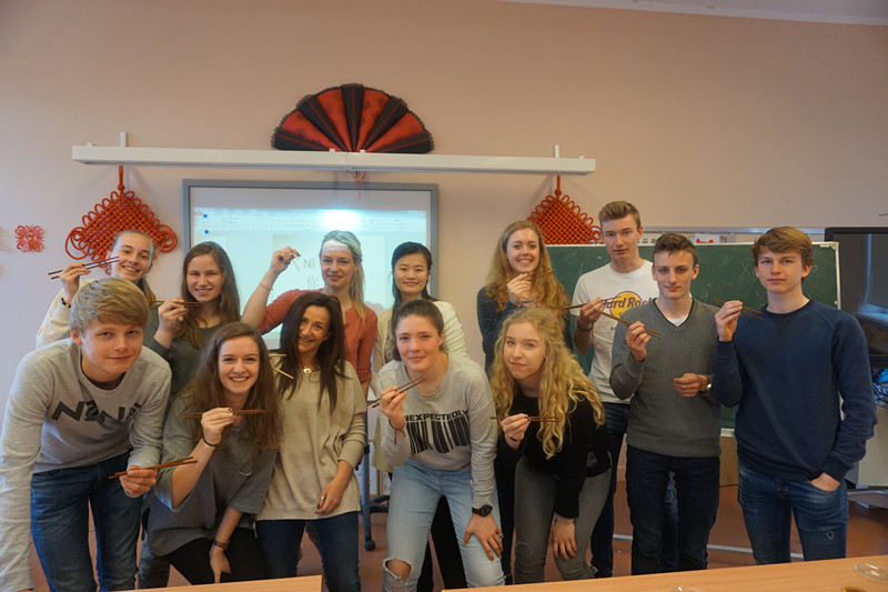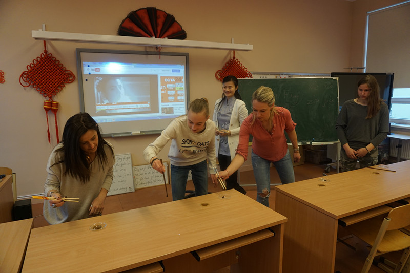 文化日由比利时师生的筷子文化课拉开序幕。一年一度的比利时师生交换访问团再一次来到里加文化中学,这也是比利时师生第三次造访孔子课堂了,由于之前两次受到访问师生的广泛好评,孔子课堂的汉语课已成为里加文化中学接待外国访问团的名片课程。这一次体验课由汉语的基本会话开始,不一会儿,在孔子课堂老师的引导下,十二名汉语零基础的比利时师生就会说“你好”、“谢谢”和“再见”了;之后,老师由一条谜语引出筷子的文化专题,用一道道生动活泼的问题将学生带入筷子的奇妙世界。在学生基本了解了筷子的文化背景和使用方法后,十二名师生分成三组开始了筷子夹瓜子的接力比赛,师生们在争分夺秒的游戏中结束了这堂中国文化体验课。值得一提的是,当日在课下与汉语老师相遇的学生们已经会用标准的“你好”打招呼了,这也可谓是孔子课堂为他们埋下了解中国了解汉语的种子。