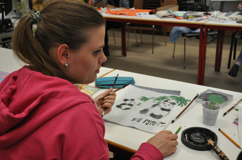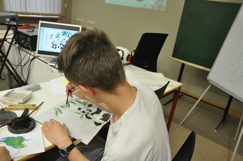 接下来,汉语教师就分别教大家学习熊猫剪纸和中国画熊猫,大家都十分认真地剪纸和画画。经过这次文化活动,大家对这个可爱的中国国宝所代表蕴含的文化意义的理解更深刻。