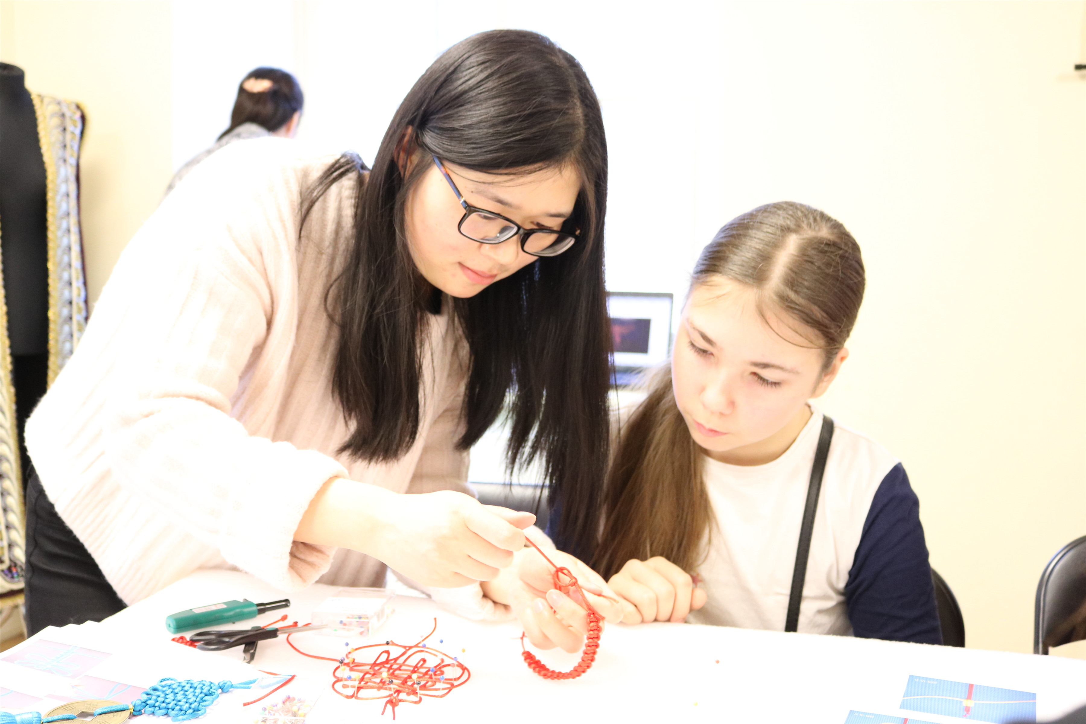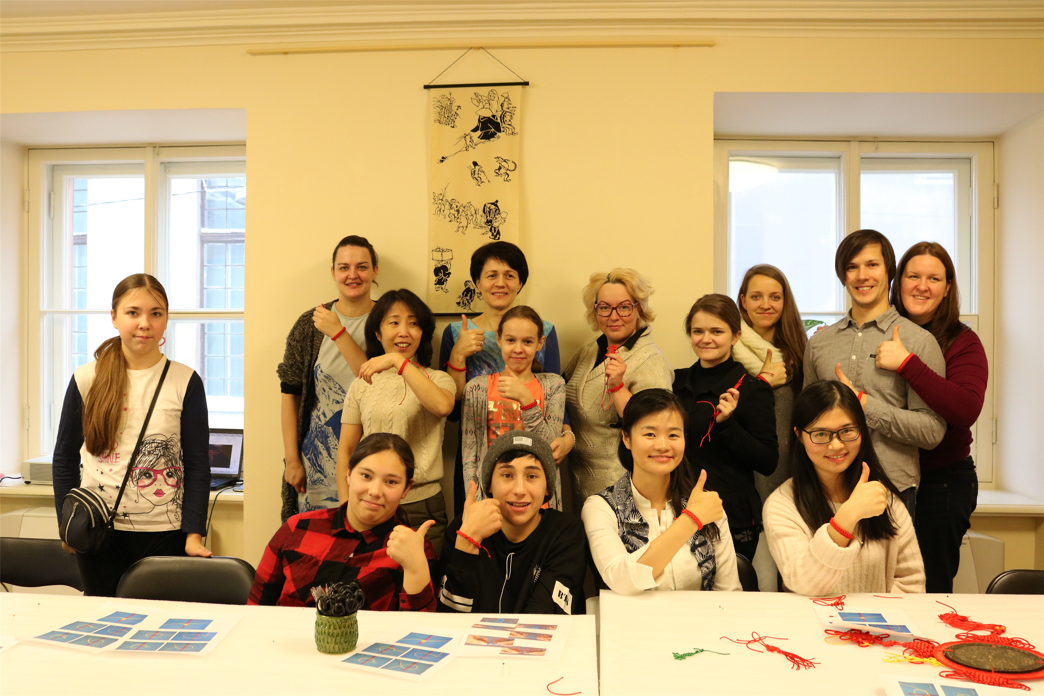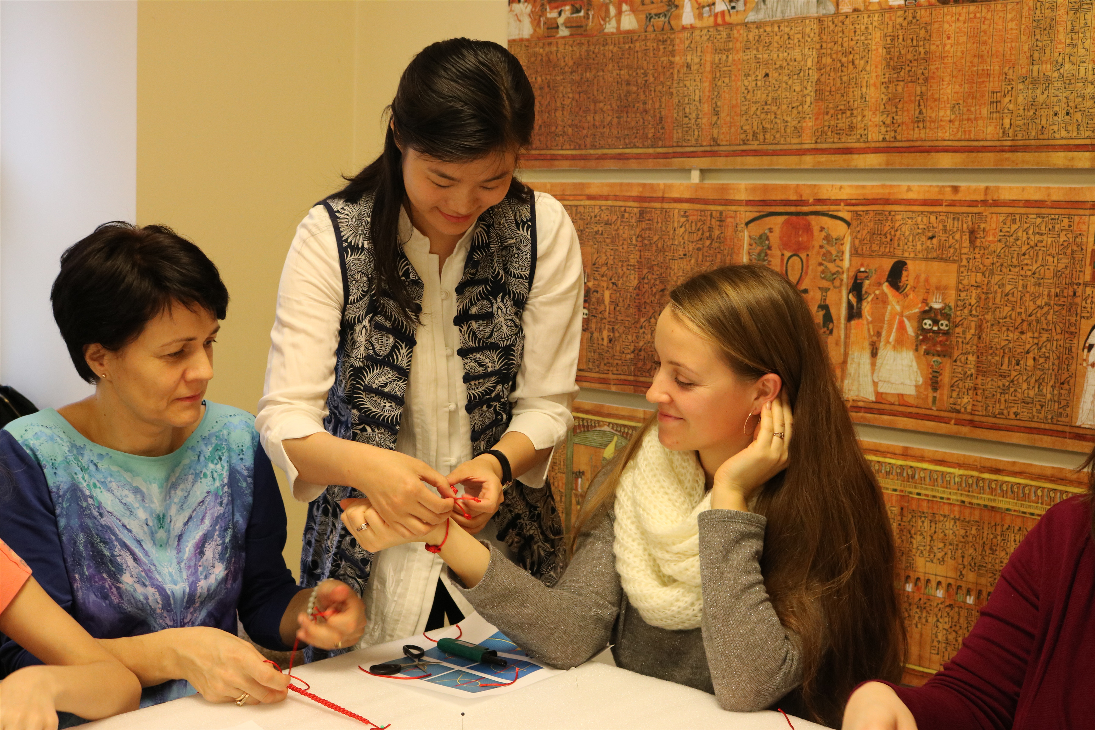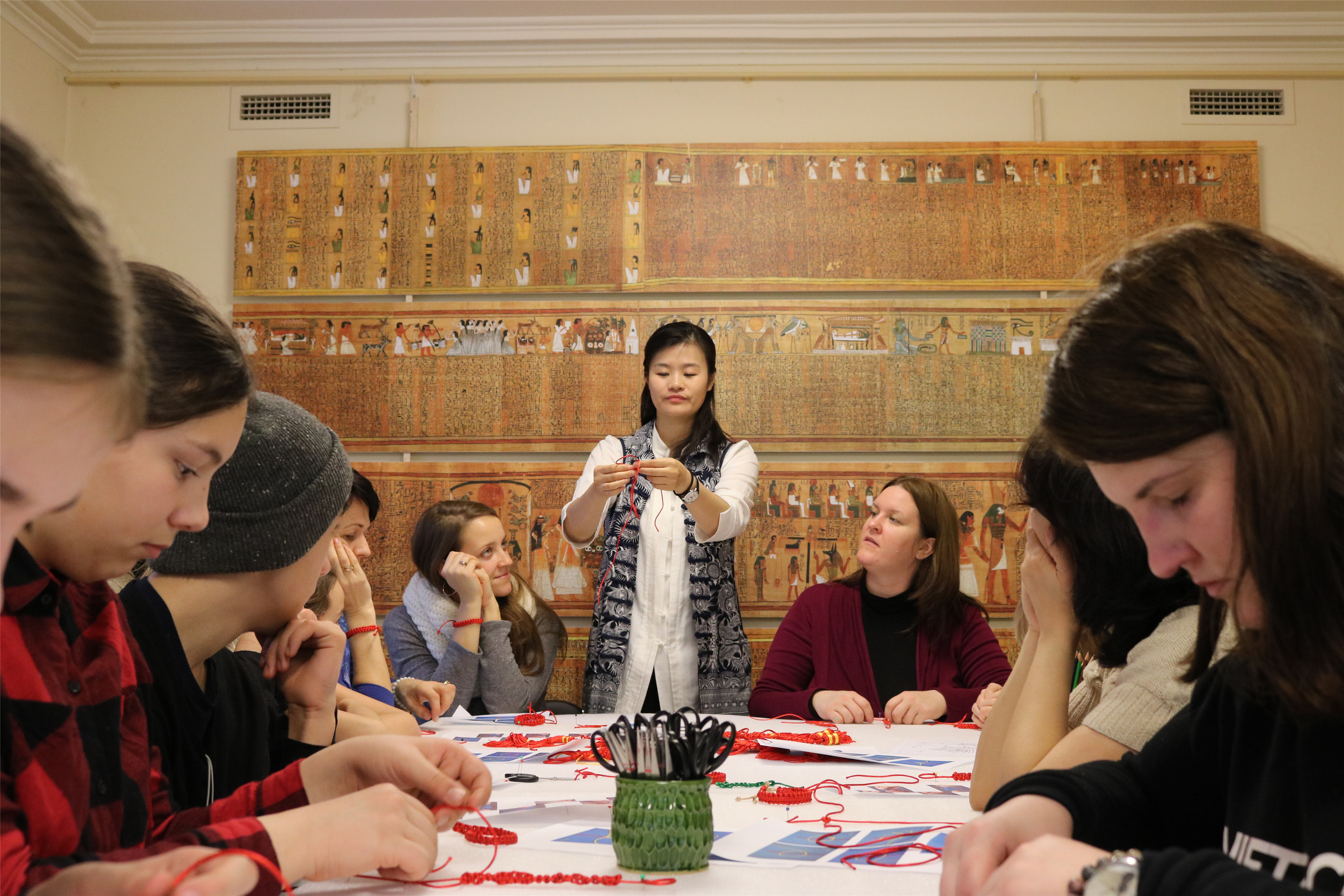 在编制中国结工坊,主持人介绍了中国结的发展历程、结构特点和象征意义,进而详细讲解了平结和蜻蜓结两种基本结法。两位汉语教师特别讲到,中国结代表团圆、幸福和平安,深受大众的喜爱,特别是在春节的时候,家家户户都会将大大小小的中国结悬挂出来,增添喜庆气氛。随后,学员们在泡沫纸板与图钉的协助下,根据主持人的指导,一步一步地编织起来。不一会儿功夫,部分动手能力较强的学员就将中国结及中国结手链呈现在大家面前。