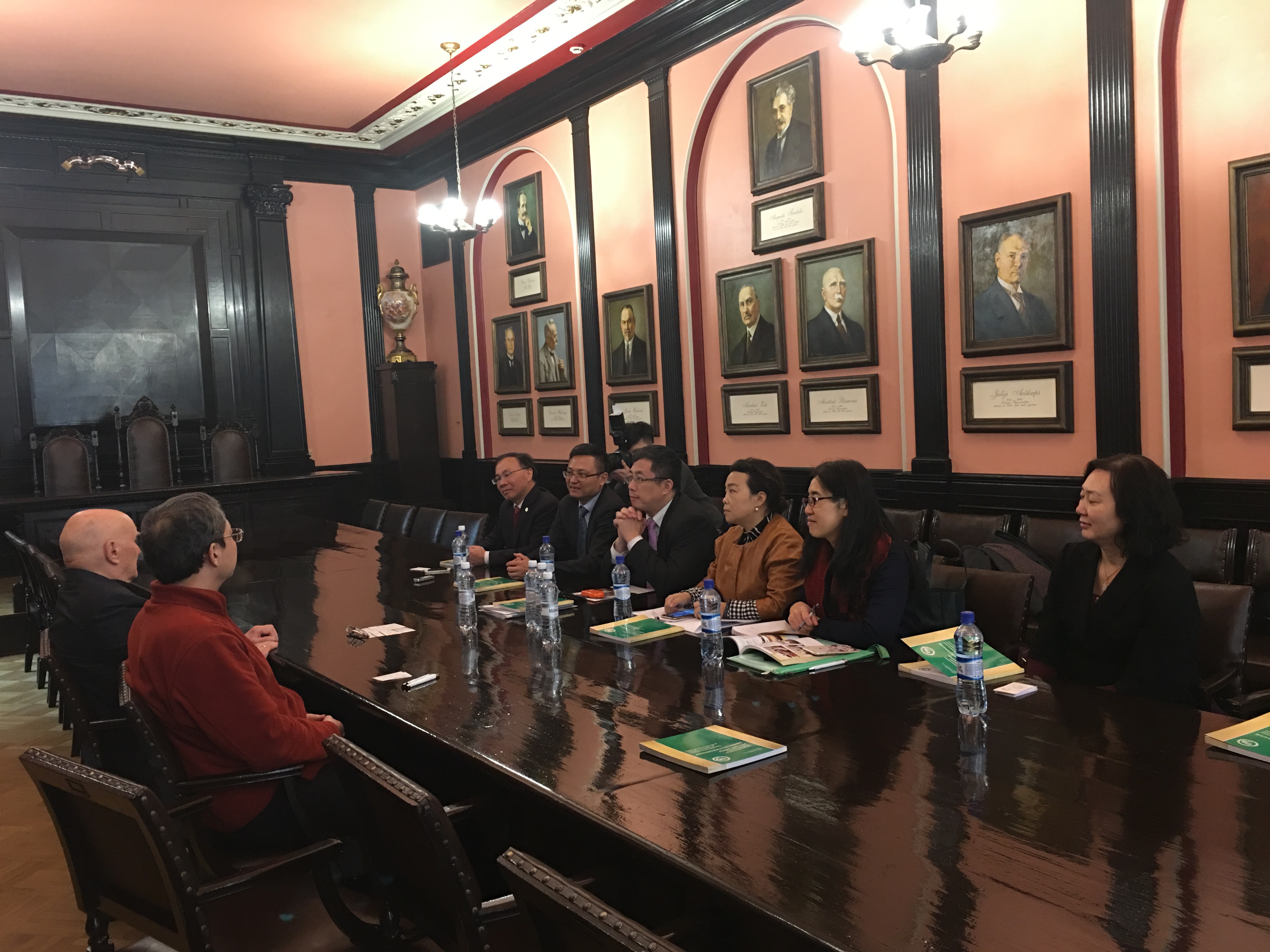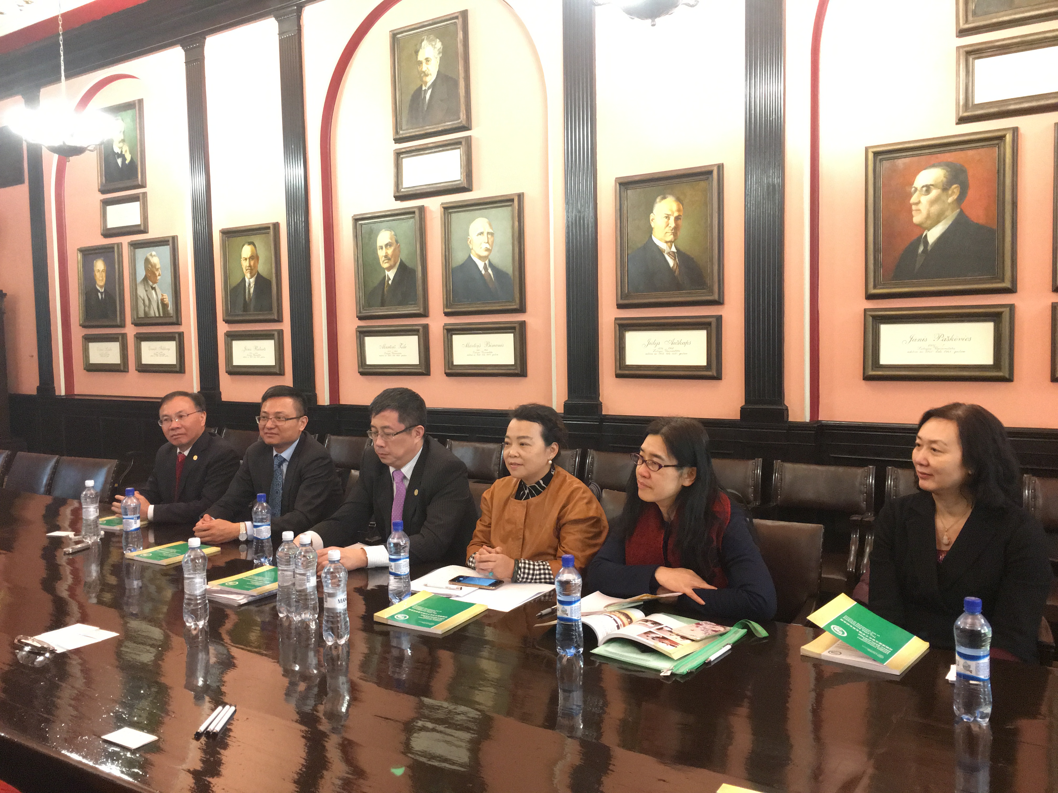 代表团拜访了拉脱维亚大学孔子学院办公室,双方互赠礼物。随后,双方在拉脱维亚大学参事厅举行了座谈。尚劝余院长向代表团介绍了拉脱维亚汉语教学的历史、拉脱维亚大学孔子学院各个教学点情况以及未来发展规划,贝德高教授向代表团介绍了拉脱维亚的历史文化特点、拉脱维亚大学孔子学院在汉语教学工具书编撰方面的成就以及举办中东欧十六国汉学研究与汉语教学研讨会的情况。