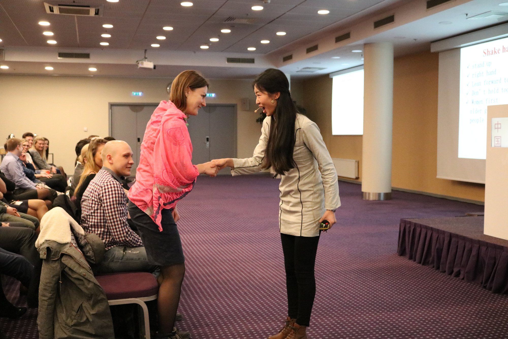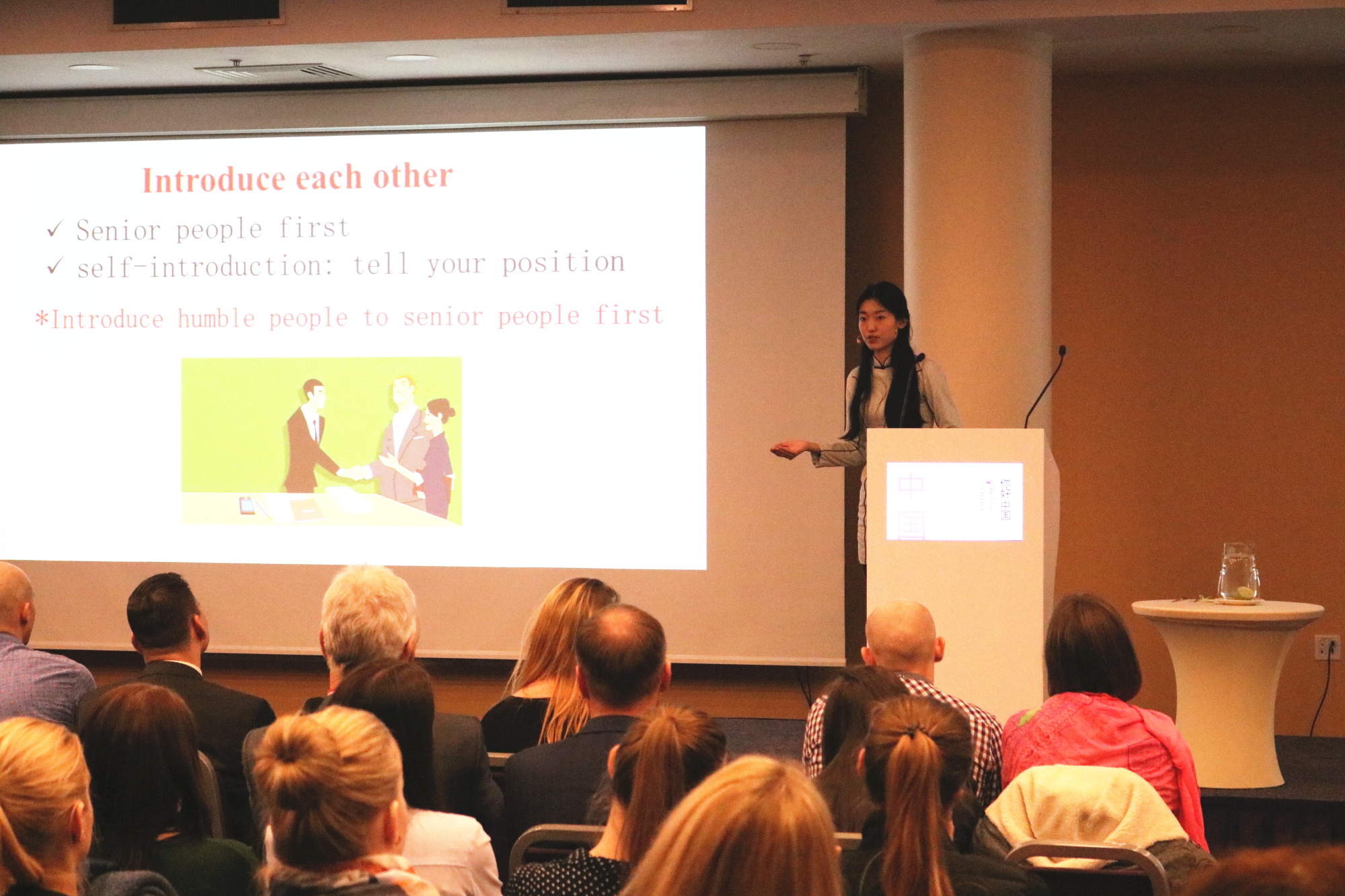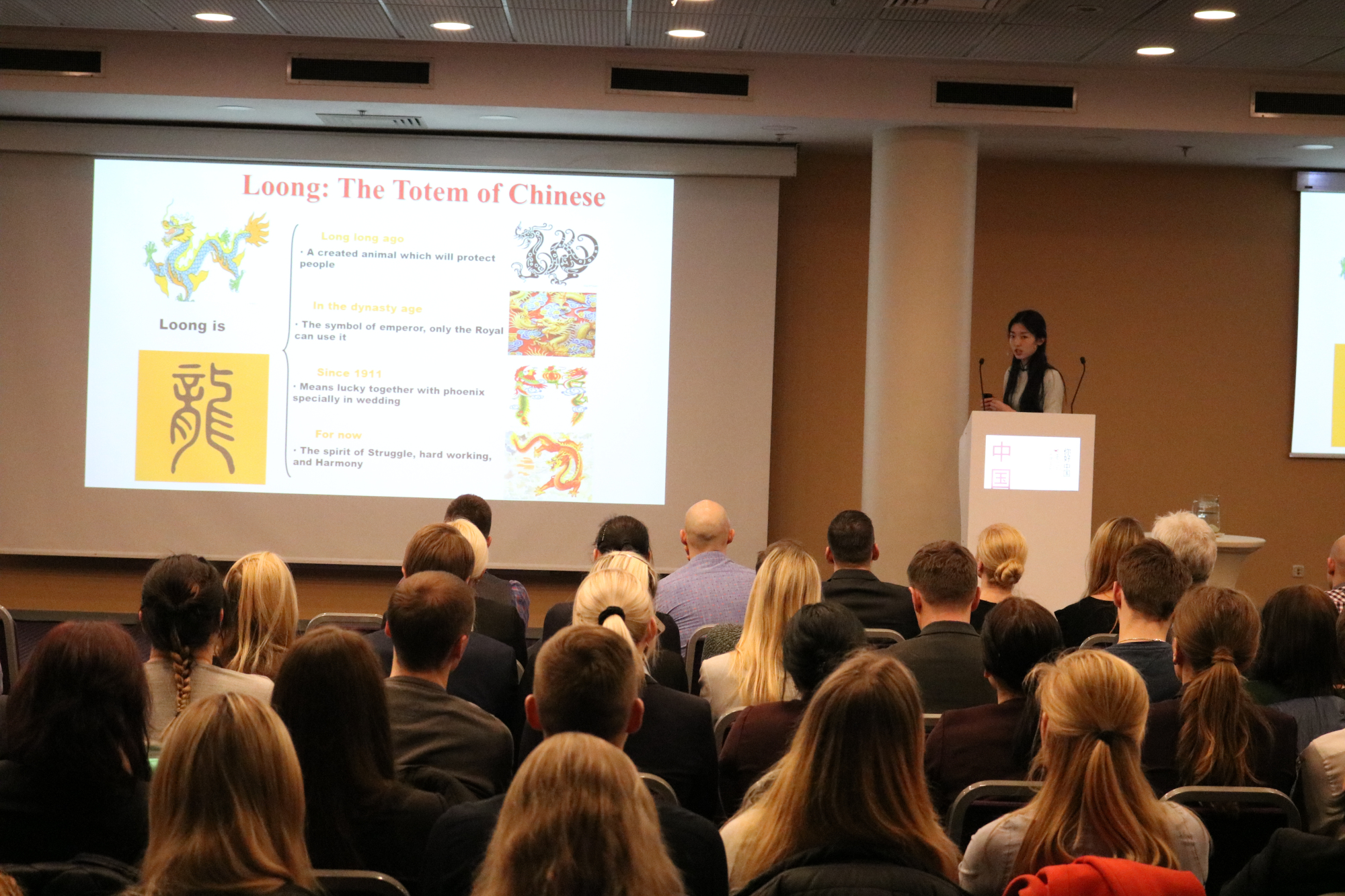 本次文化讲座分为四大版块,包括国情概况,中国文化,中国语言及商务礼仪,涉及中国传统和当代的方方面面。从历史地理人口到现代中国的发展,从中国人的饮食习惯到美食文化,从国宝熊猫到中国龙,从多元的方言文化到标准的普通话,从中西差异到实用的礼仪。在场观众无不惊叹中国日新月异的发展以及文化的丰富多元,同时也因更深入地了解到了如何与中国人打交道等方面的知识而表示受益匪浅,收获良多。