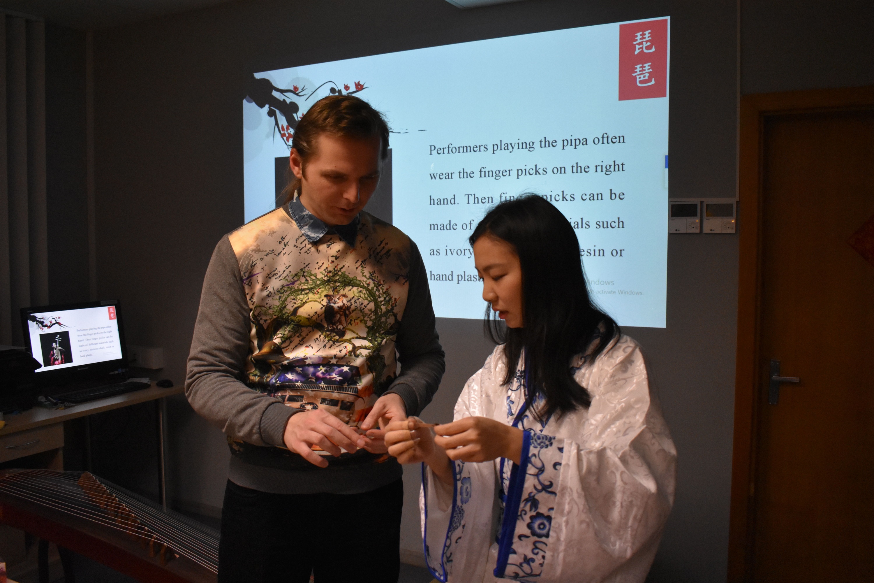 接着,志愿者教师刘梦珂、朱玥先后就古筝、琵琶等具有代表性的中国传统乐器的历史及乐理知识进行了介绍,分别演奏各乐器的代表曲目《渔舟唱晚》和《春江花月夜》。随着乐曲流泻而出的刹那,外籍学生们在起落悠扬的音符中,感受到中华文化深藏的韵味。在随后的现场教学中,外籍友人在朱玥老师的指导下,带着拨片,练习演奏了简单且独具特色的曲调。