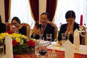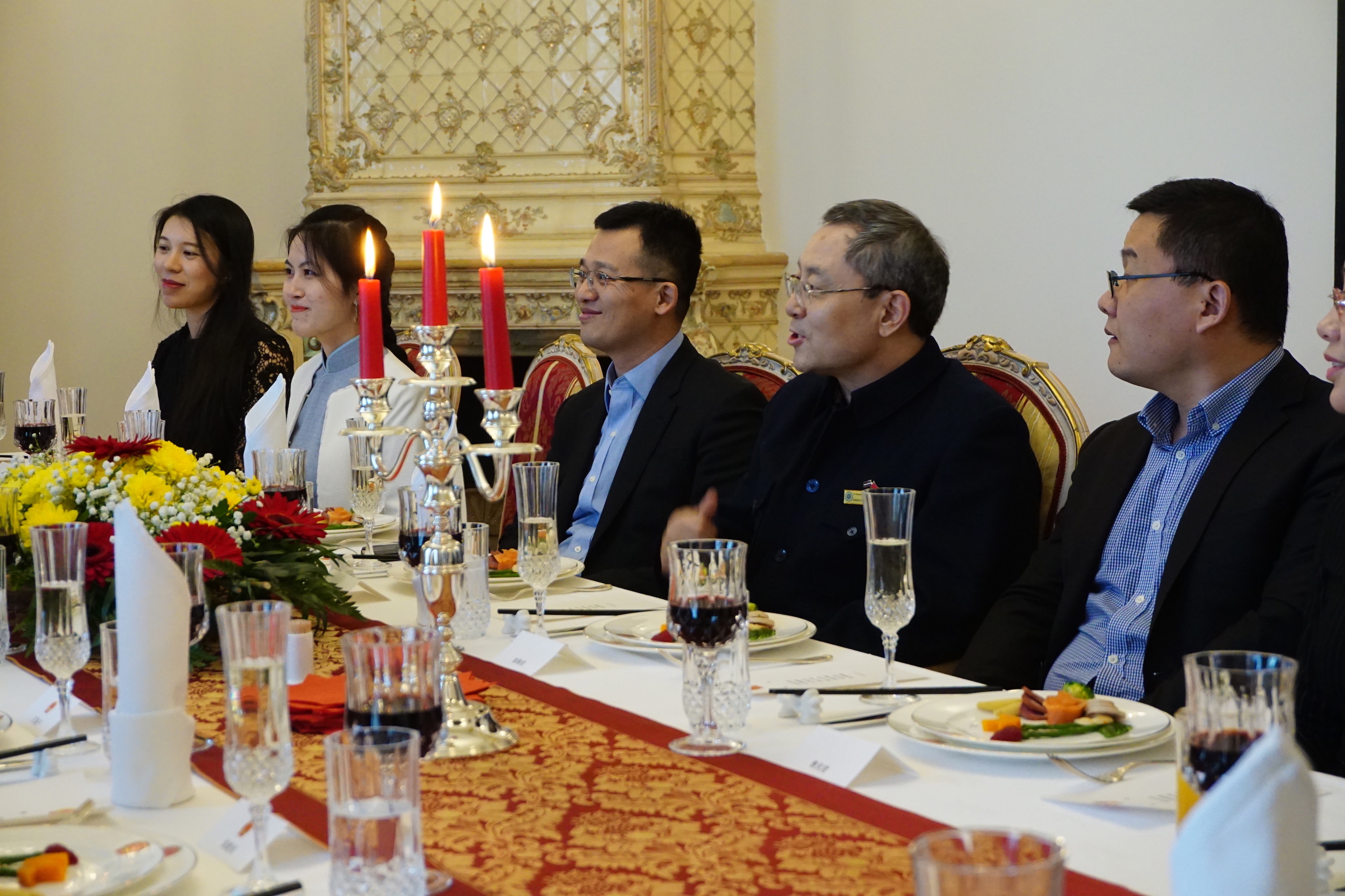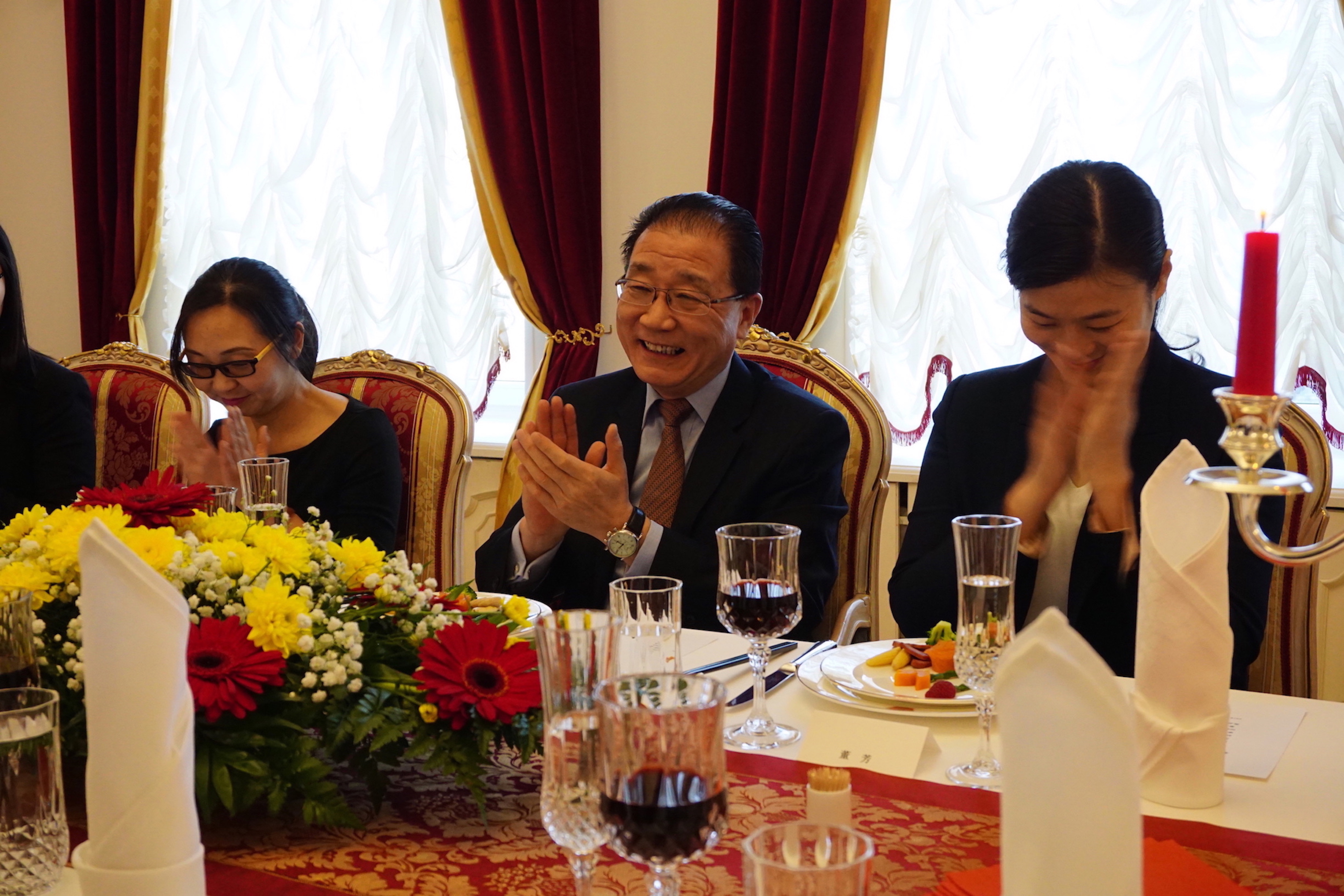 In the beginning of the reception,Mr. Huang Yong, Ambassador of the Chinese Embassy in Latvia made a speech to express thanks for the whole LUCI Chinese teachers and volunteer Chinese teachers.Next, Prof. Shang Quanyu, Chinese-side Director of LUCI made a report to introduce LUCI.Then, Mr. Huang Yong, Ambassador of the Chinese Embassy in Latvia, Mr. Sun Yinglai, Counselor and Mr. Guo Haibo, Director ate lunch with the whole LUCI Chinese teachers and volunteer Chinese teachers.