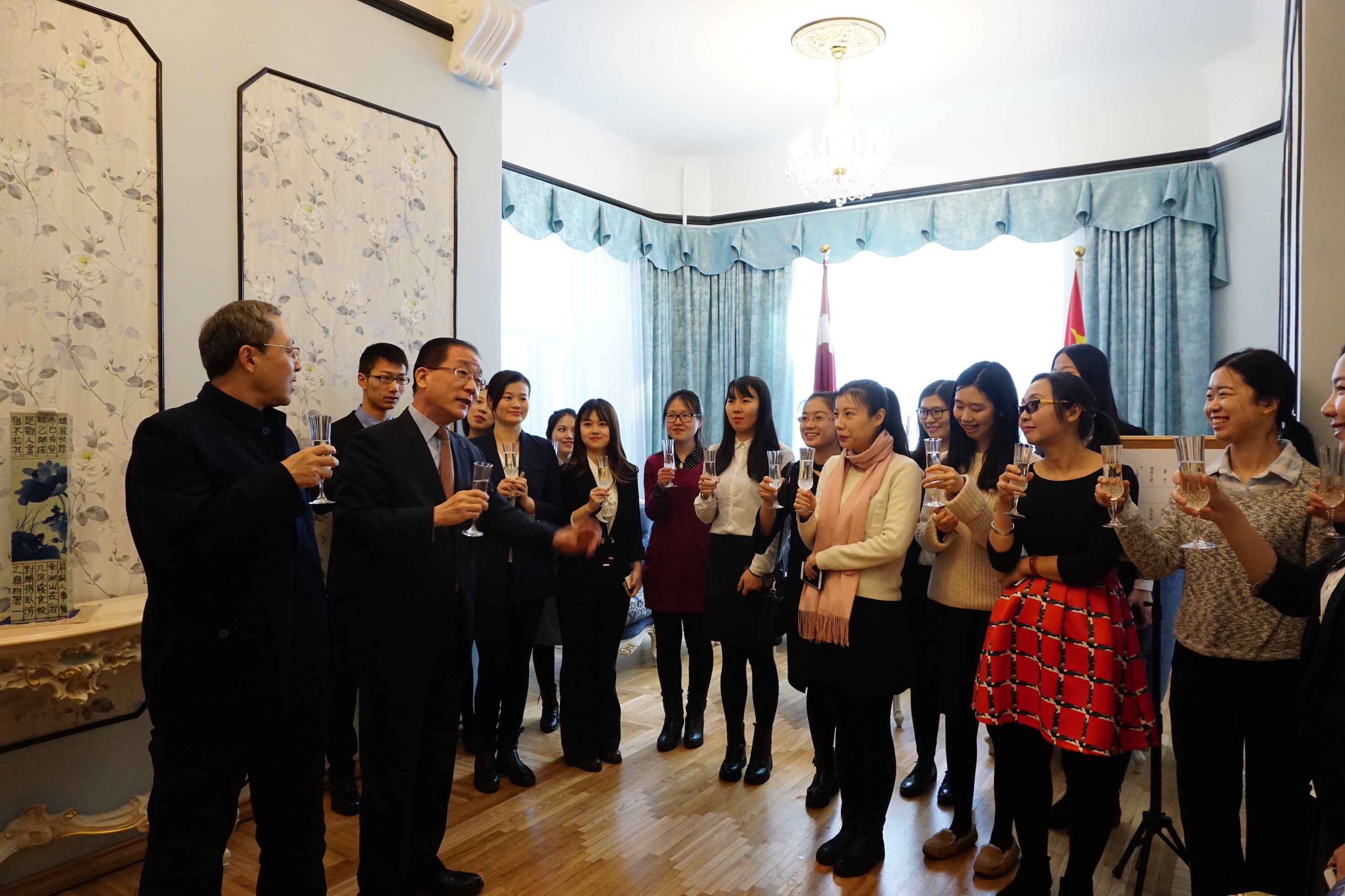On February 24th 2018, The whole LUCI Chinese teachers and volunteer Chinese teachers went to Chinese Embassy in Latvia to attend the reception and preparation’s meeting for the 15th ‘Chinese Bridge’ Chinese Competition.Mr. Huang Yong, Ambassador of the Chinese Embassy in Latvia, Mr. Sun Yinglai, Counselor, Mr. Guo Haibo, Director, Prof. Shang Quanyu, Chinese-side Director of LUCI and the whole LUCI Chinese teachers and volunteer Chinese teachers attended this activity.