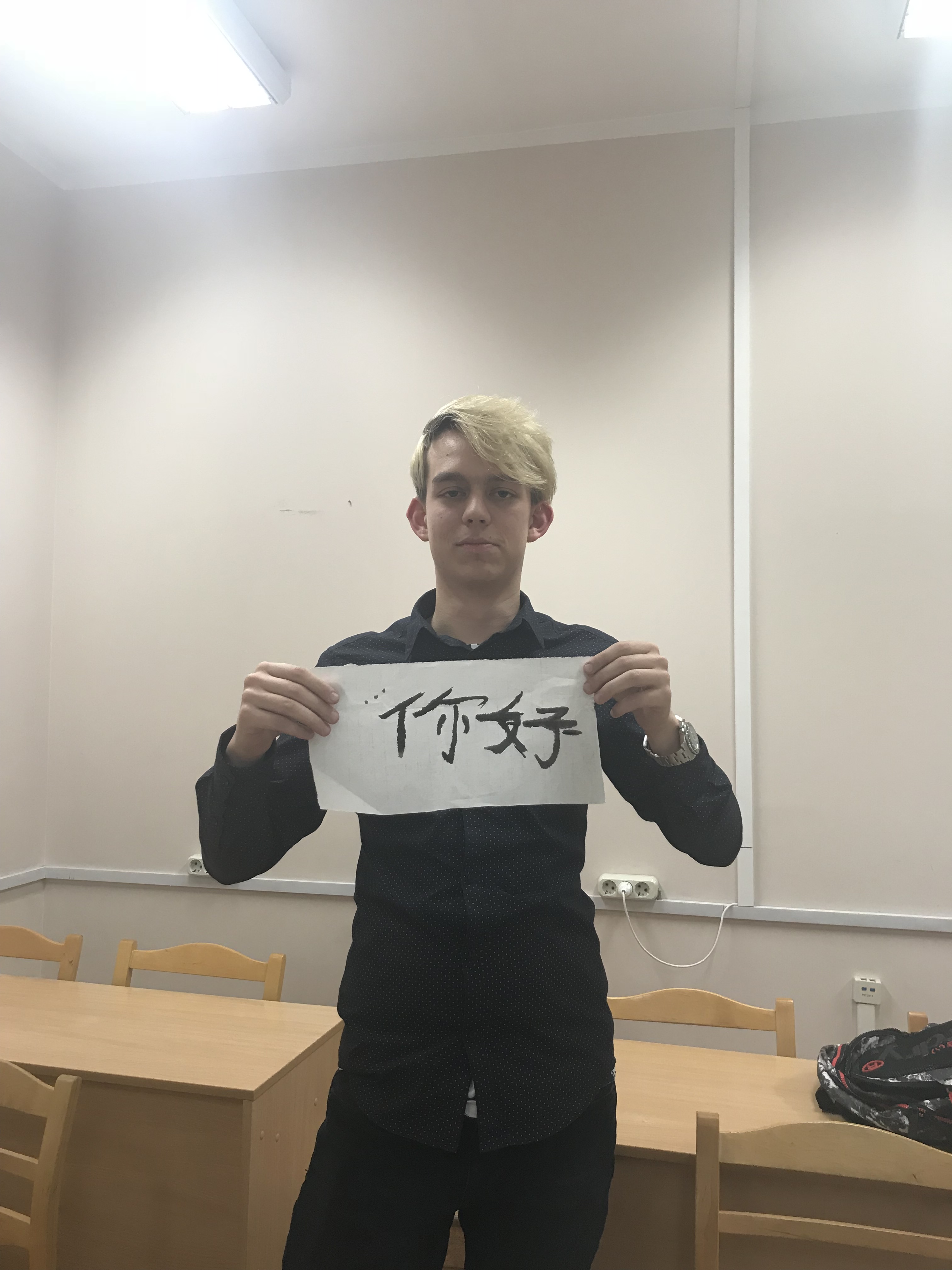 在学生们书写过程中,老师也在不断演示汉字中五个基本笔画“横、竖、撇、点、捺”的写法,并教学生们学写楷体汉字“你好”。