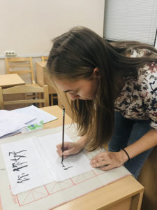 Before the official start of writing, teacher corrected students’ posture of holding pen and posture of sitting. If the posture is wrong, it will not only affect the artistic effect of calligraphy, but also be detrimental to the body. After that, the students couldn’t wait to write the strokes and Chinese characters what the teacher had taught.