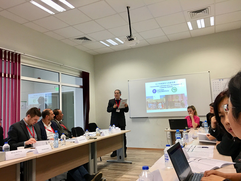 Professor Shang Quanyu, the Chinese Director of the Confucius Institute at the University of Latvia, attended the meeting and gave a speech on the characteristics and innovation development of the Confucius Institute at the University of Latvia and the Preparatory Institution and internship in enterprises. About Characteristics and innovative edevelopment of Confucius Institutes,he pointed out: First, Holding High-Level Cultural Exchange Activities in Conformity With The Belt and Road Initiative; Second, Building a Chinese Language Talent Reservoir Together with Sinology Program of University of Latvia; Third, Implementing Confucius China Studies Program and Upgrading Sinology Research & Chinese Language Teaching; Fourth,Compiling & Publishing Electronic Dictionary in Keeping Pace with the Times. Regarding the problems of the Preparatory Institution and internship in enterprises, he pointed out: First, It is quite necessary and natural for Confucius Institutes to grow to be a pre-university institution (institution for Chinese language and culture as well as HSK training) that provides language training to foreign students before they come to study in China;Second, According to our preliminary investigation, we’ve found that there exists certain kind of feasibility but not so much, not so promising..