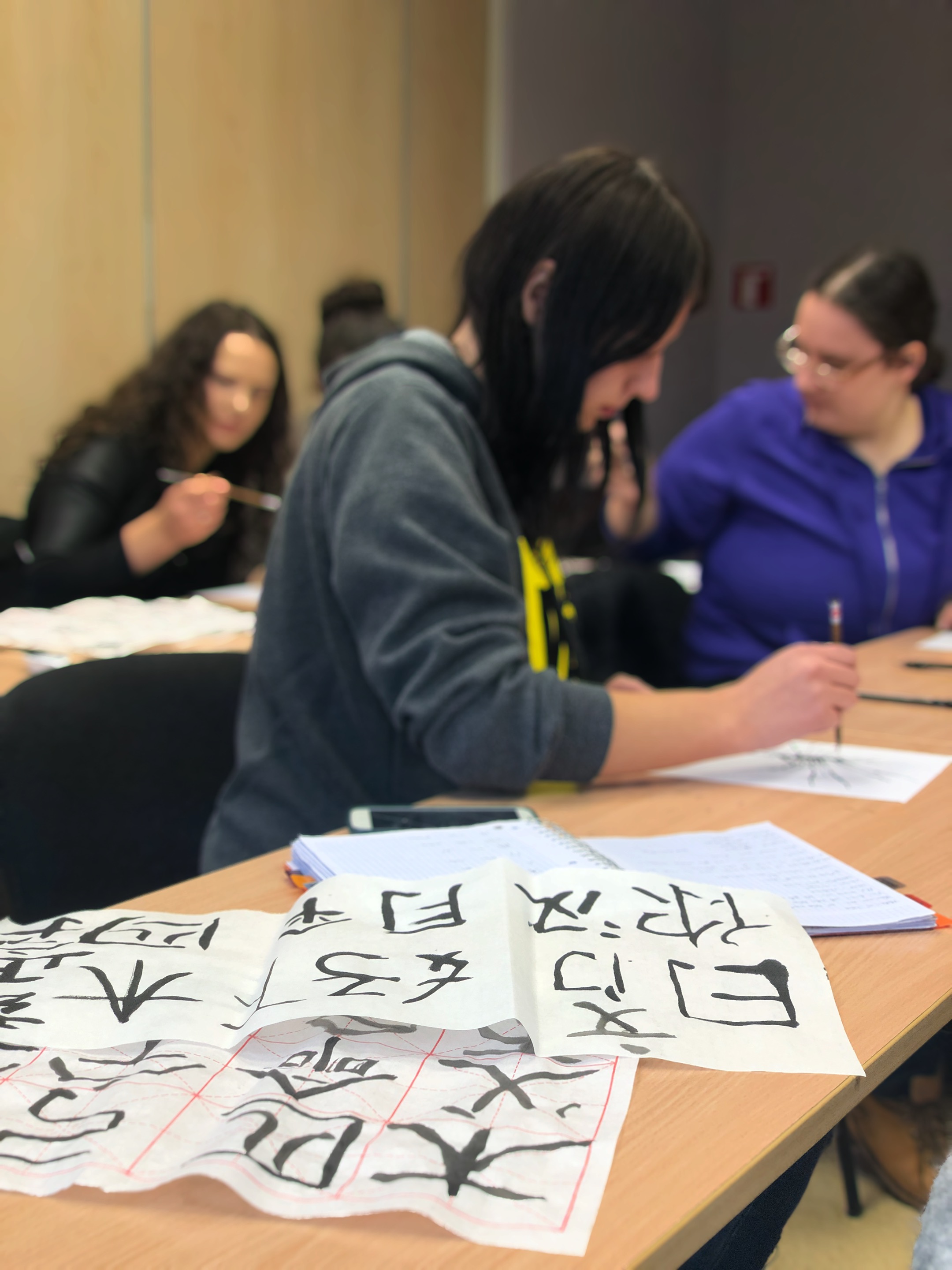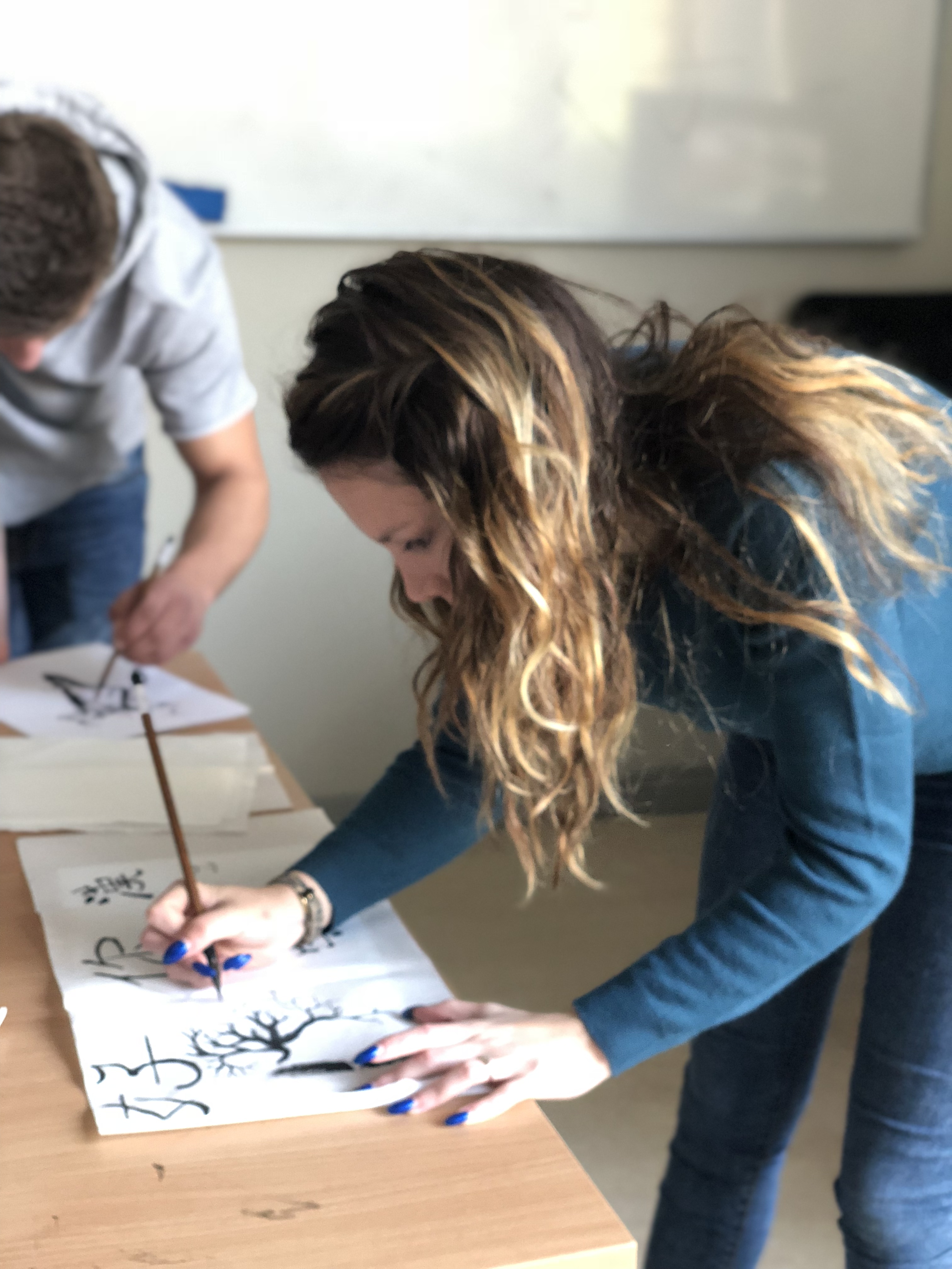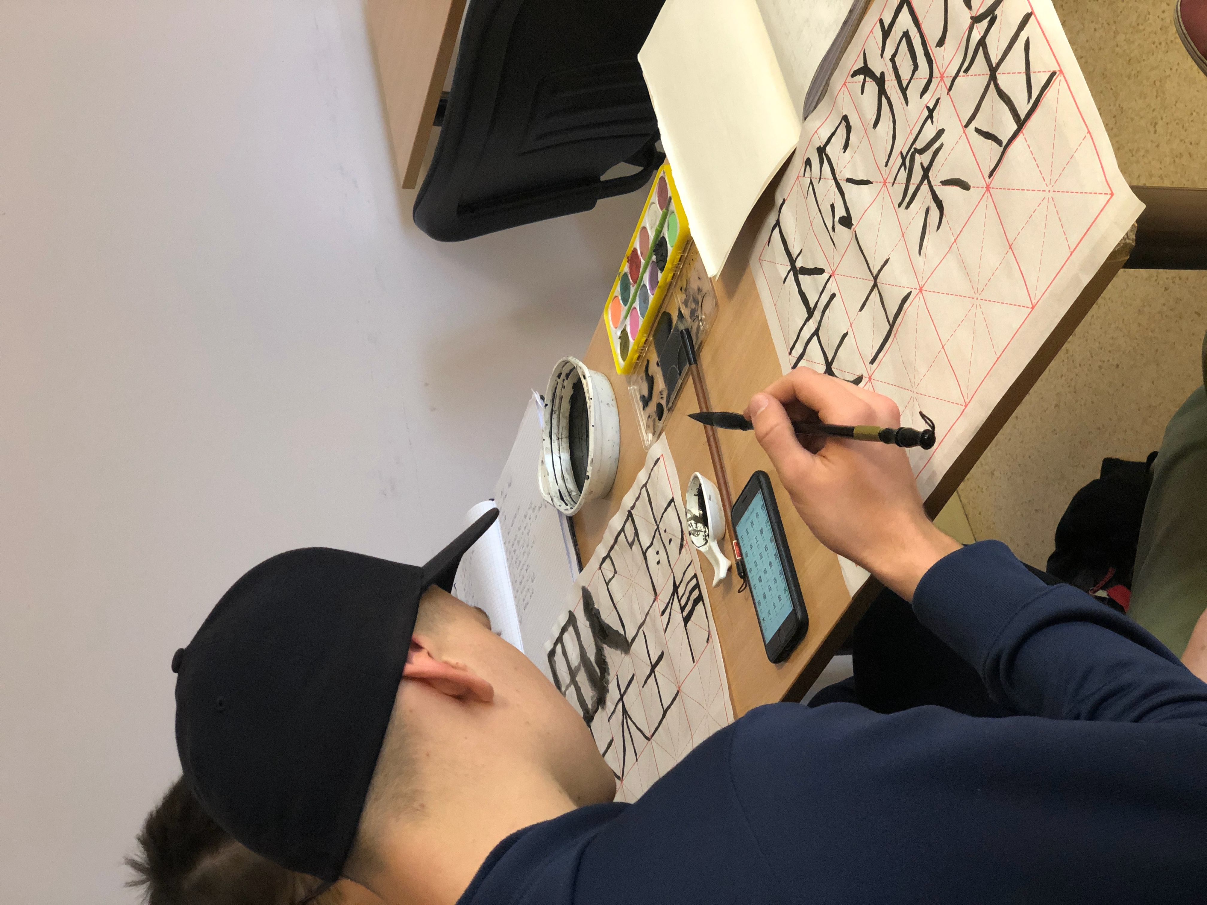 在学生们书写过程中,毛笔的拿法,坐姿等问题都都得到及时纠正, 并在学习了如何书写汉字的基本笔画后,同学们都迫不及待的去体验中国书法。