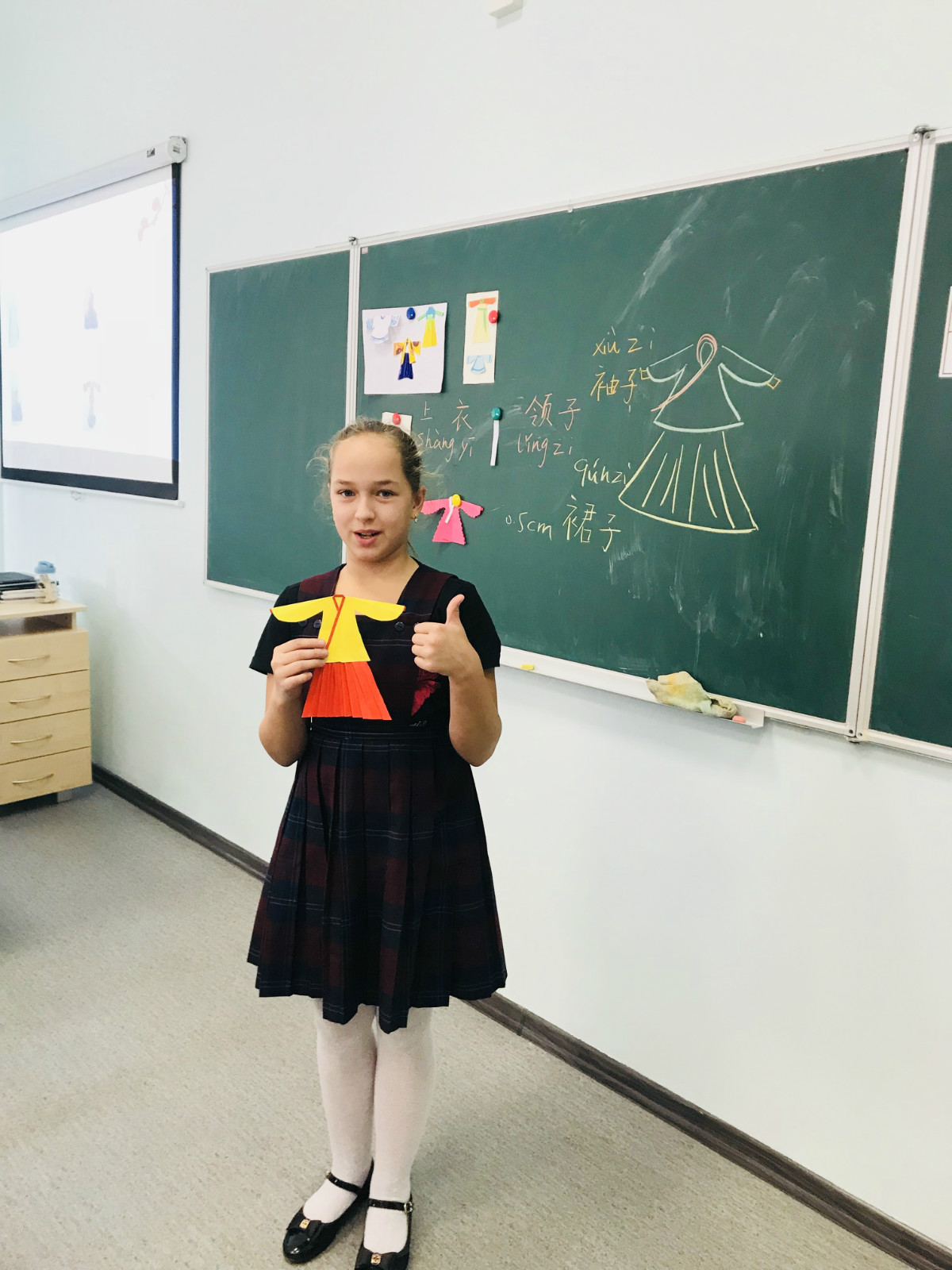 At the beginning of the activity, the teacher played the video of Hanfu for the students. Then the teacher showed the students the common men’s and women’s clothing in ancient China, such as “ǎoqún” and “shēnyī”, and introduced the common patterns of Chinese clothing: dragon, phoenix and crane, plum, orchid and bamboo. Under the teacher’s step-by-step explanation and one by one guidance, the students made tops, skirts, collars, and sleeves in turn. After the assembly, a delicate Hanfu was finished. The students have a sense of accomplishment and raised their own Hanfu to introduced it in Chinese.