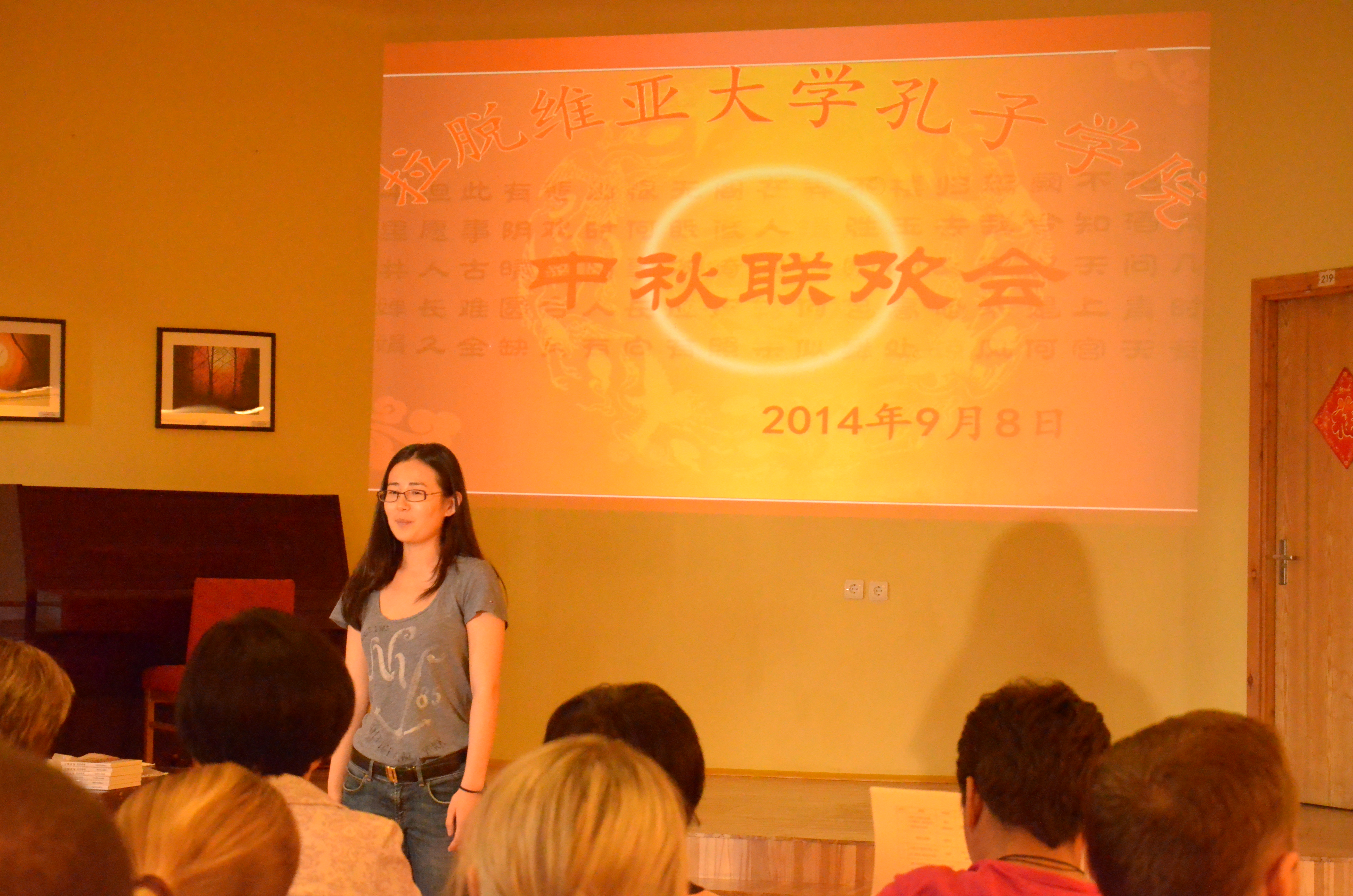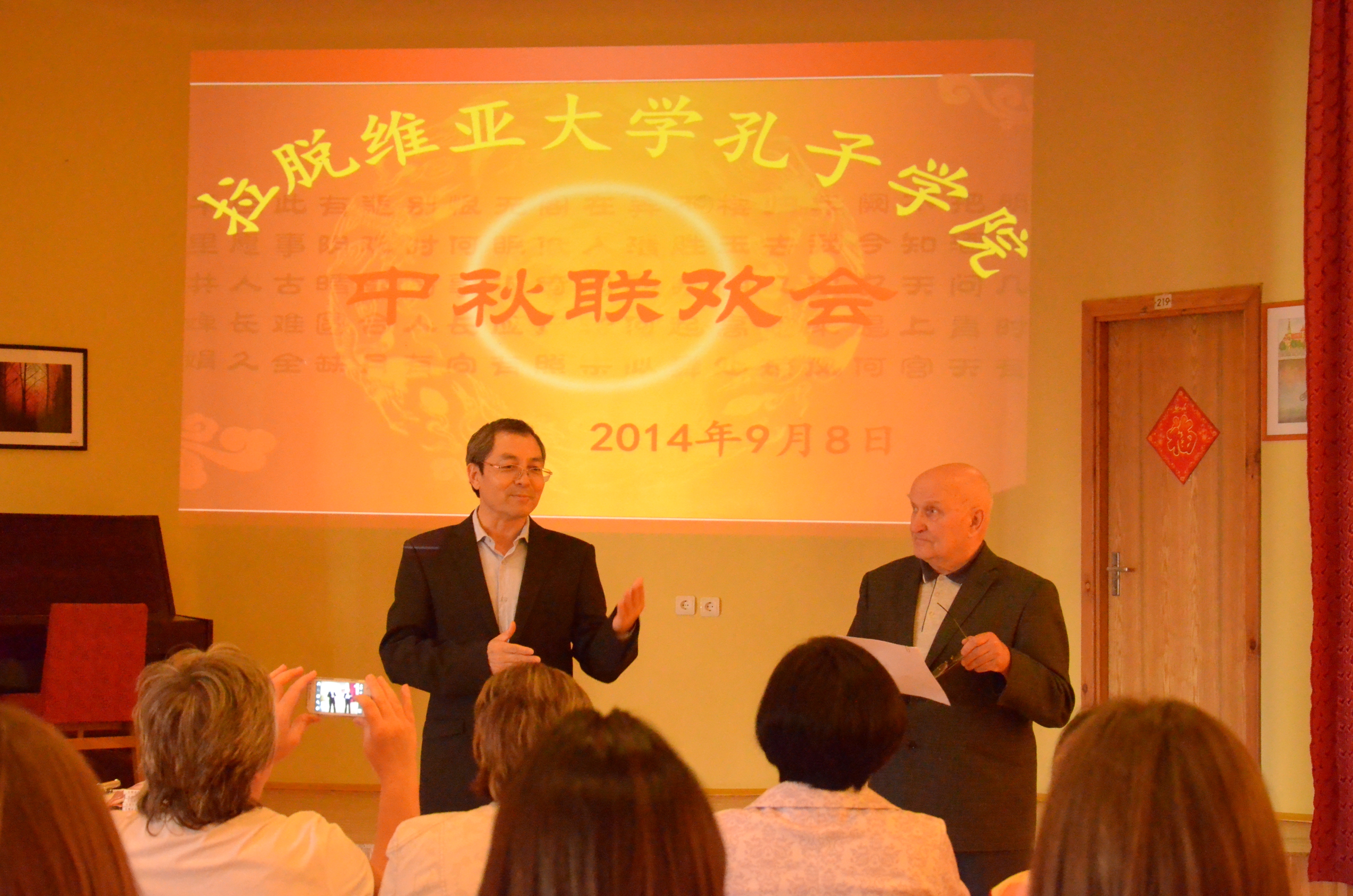 联欢会由新任汉语教师志愿者方思琪主持,在热情洋溢的开场白后,孔院外方院长贝德高教授首先致辞,贝教授用拉中双语与在座嘉宾分享了自己与中秋节的渊源故事,把大家带入了浓浓的中秋氛围;之后中方院长尚劝余教授发表了诗情画意又幽默风趣的演讲,不仅告诉大家许多有关秋的成语,也简要讲述了三个有关中秋的神话传说。