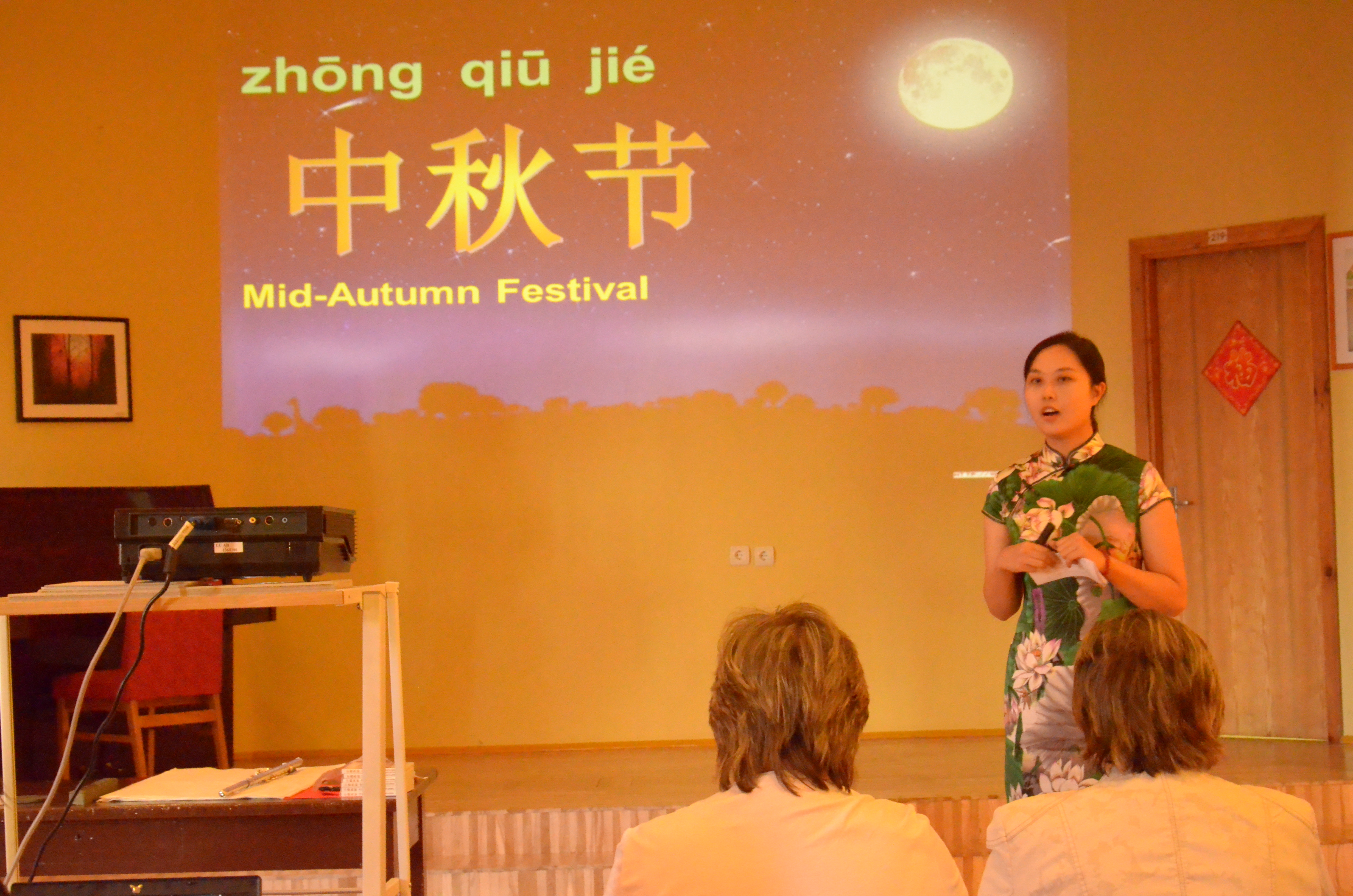 为了让在座的学生和外方嘉宾们进一步了解中国传统佳节中秋节,新任汉语教师志愿者程雪用生动的语言和图片为大家介绍了中秋节的来历和中秋节的习俗,也向在座的嘉宾提出几个有关中秋节的小问题,加深外方友人对中秋节的理解。