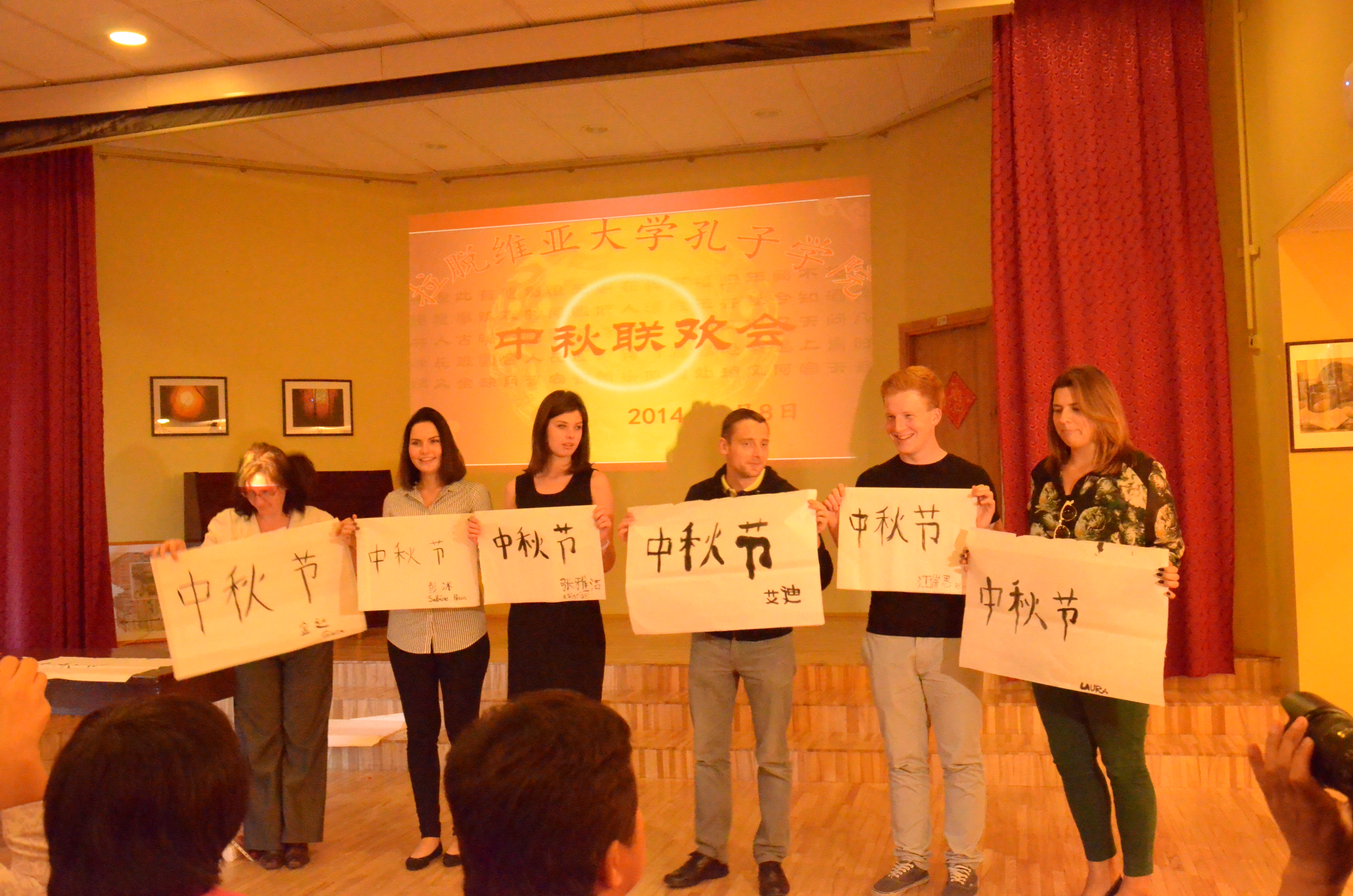 中秋联欢会的表演环节开始,三位新任志愿者教师先进行了才艺合演,在《月亮代表我的心》的悠扬笛声中,“花好月圆”的书法展示与“红双喜”的剪纸表演同时进行,引得现场嘉宾称赞;接着,拉大汉语教师王琼子的先生何清用一曲中国摇滚《假行僧》引爆了现场气氛;中国留学生代表甄诚也现场献唱;之后,志愿者教师现场示范毛笔书法“中秋节”三字并请拉大孔院学生尝试,学生们踊跃参加,留下了一幅幅墨宝;联欢会的最后,贝德高院长致结束词,将整个活动推向高潮。