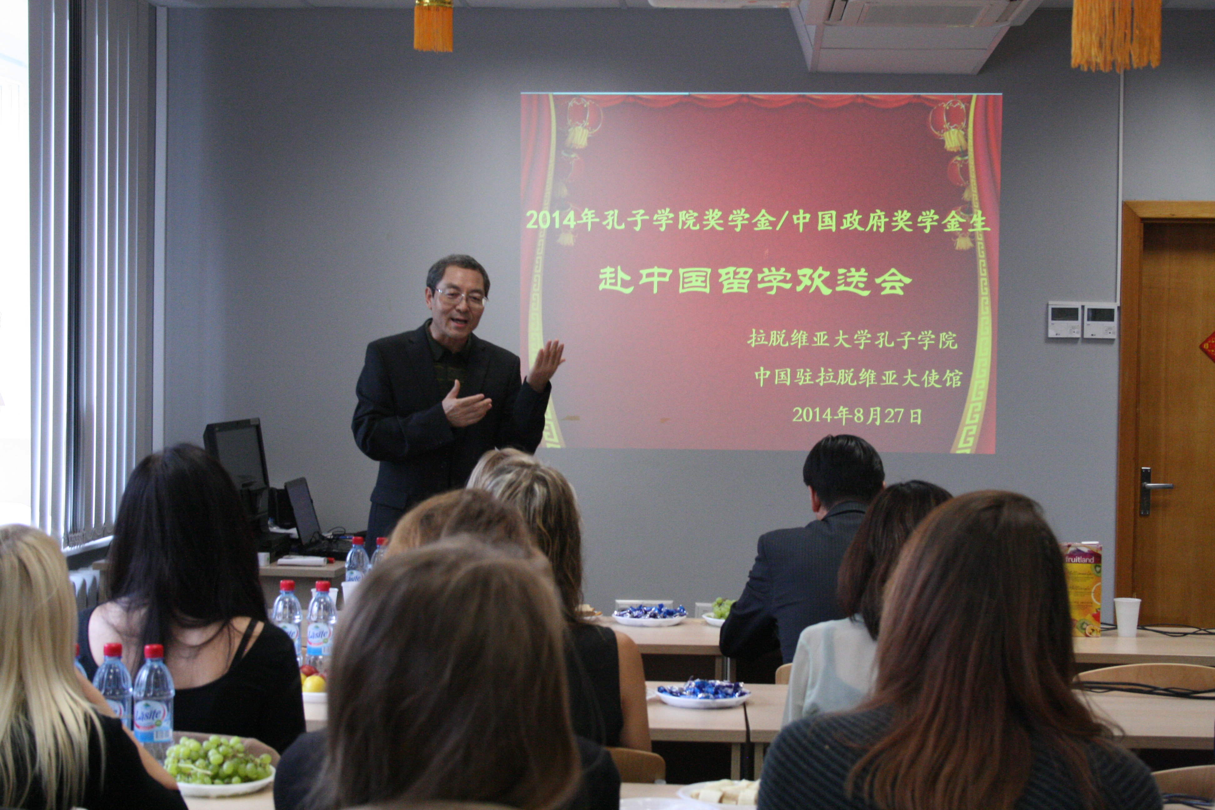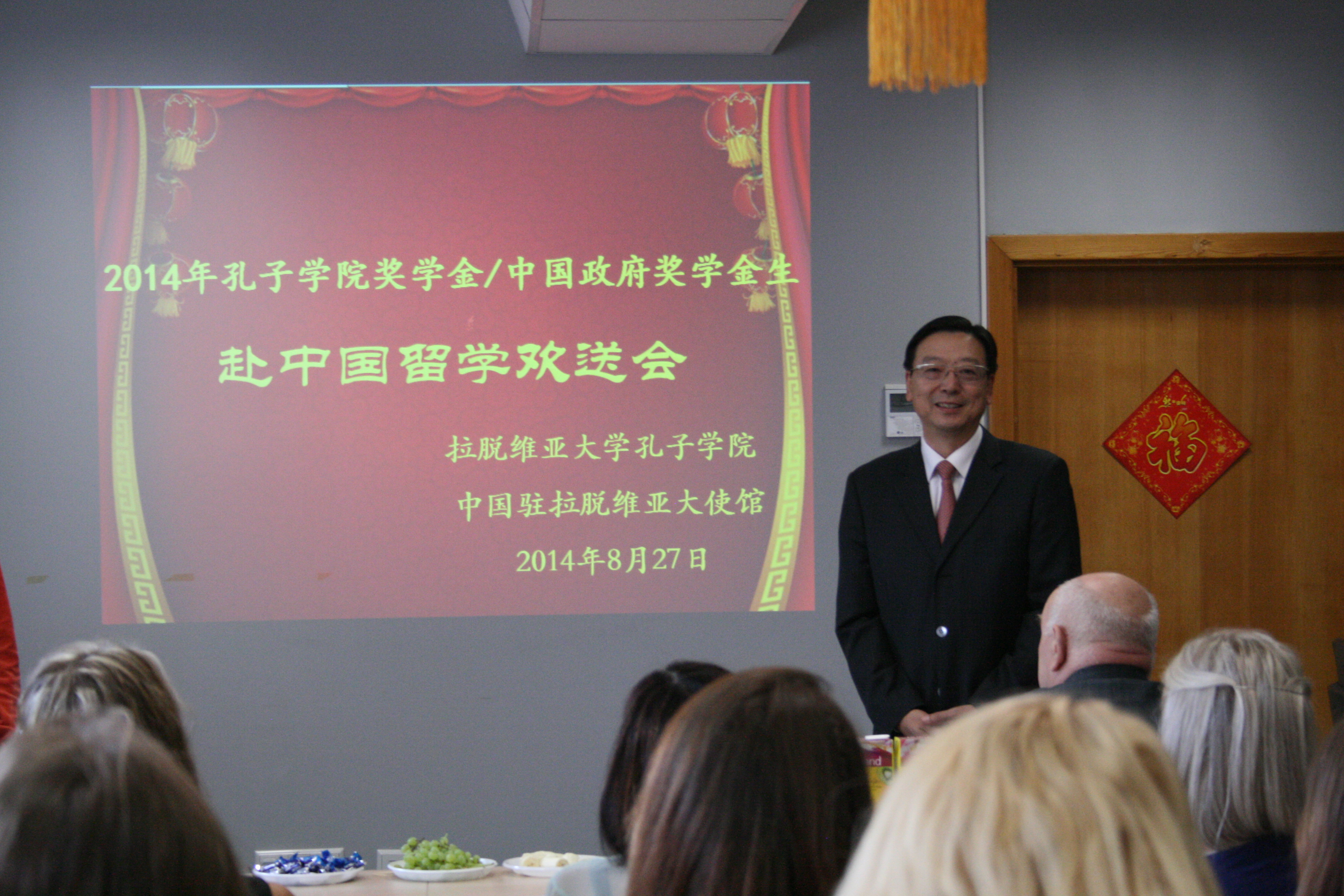 2014年8月27日,拉脱维亚大学孔子学院召开孔子学院及中国政府奖学金生赴中国留学欢送会。中国驻拉脱维亚大使杨国强、拉脱维亚大学孔子学院中方院长尚劝余、外方院长贝德高及汉语教师和学生家长等共同参加活动,与学生们欢聚一堂并为他们践行。