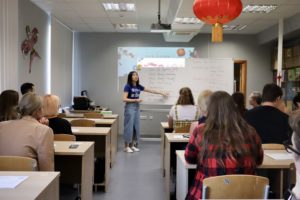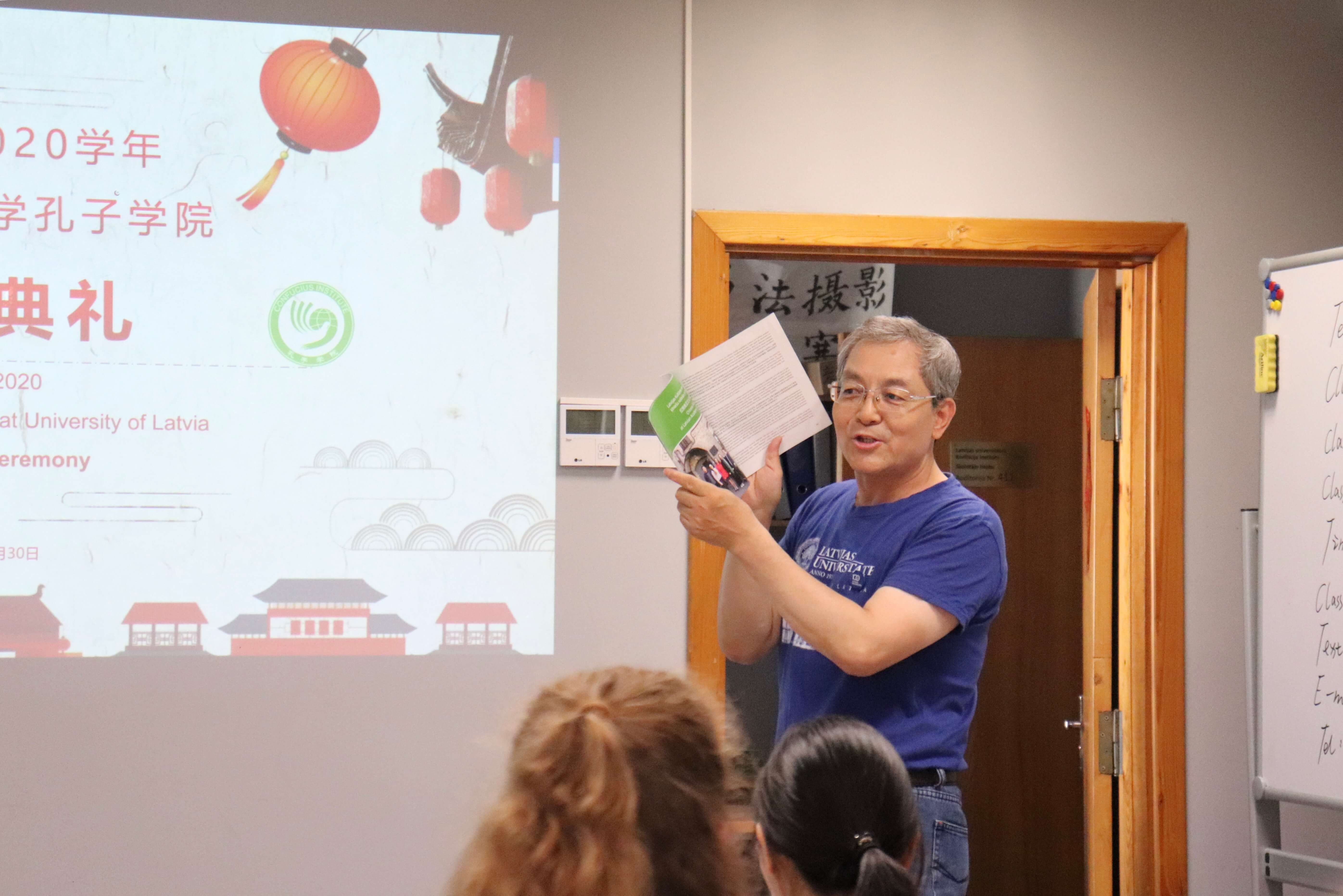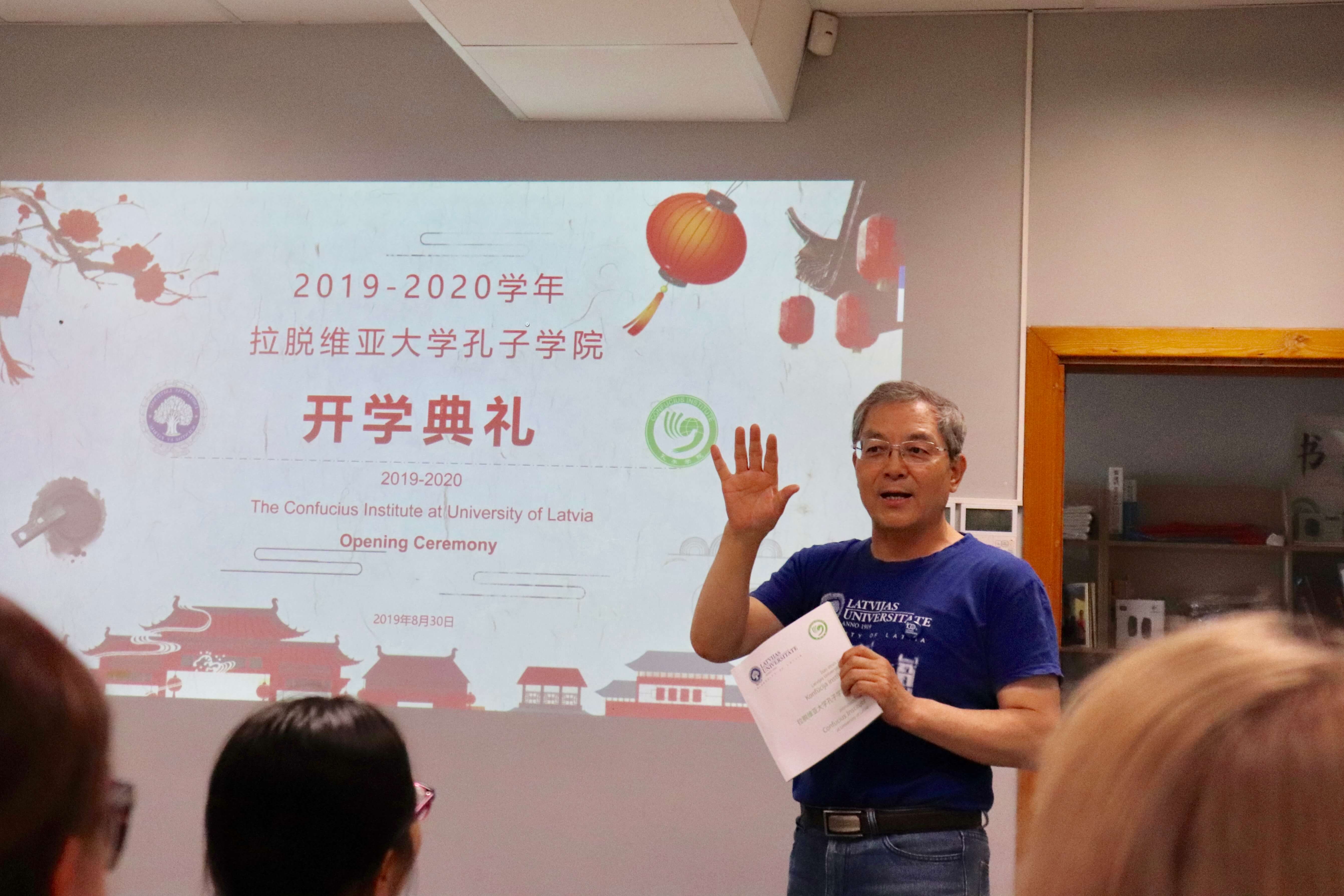 拉大孔院中方院长尚劝余教授向参加典礼的学生介绍了拉脱维亚大学孔子学院概况,包括孔院建设、教学点概况、师资计划、中文比赛活动举办、夏令营安排、奖学金申请等情况。尚劝余院长表达了愿意帮助每一位喜爱汉语及中国文化的同学实现他们的梦想,并对同学们提出了殷切的期望,祝愿同学们在新学期学习取得进步。