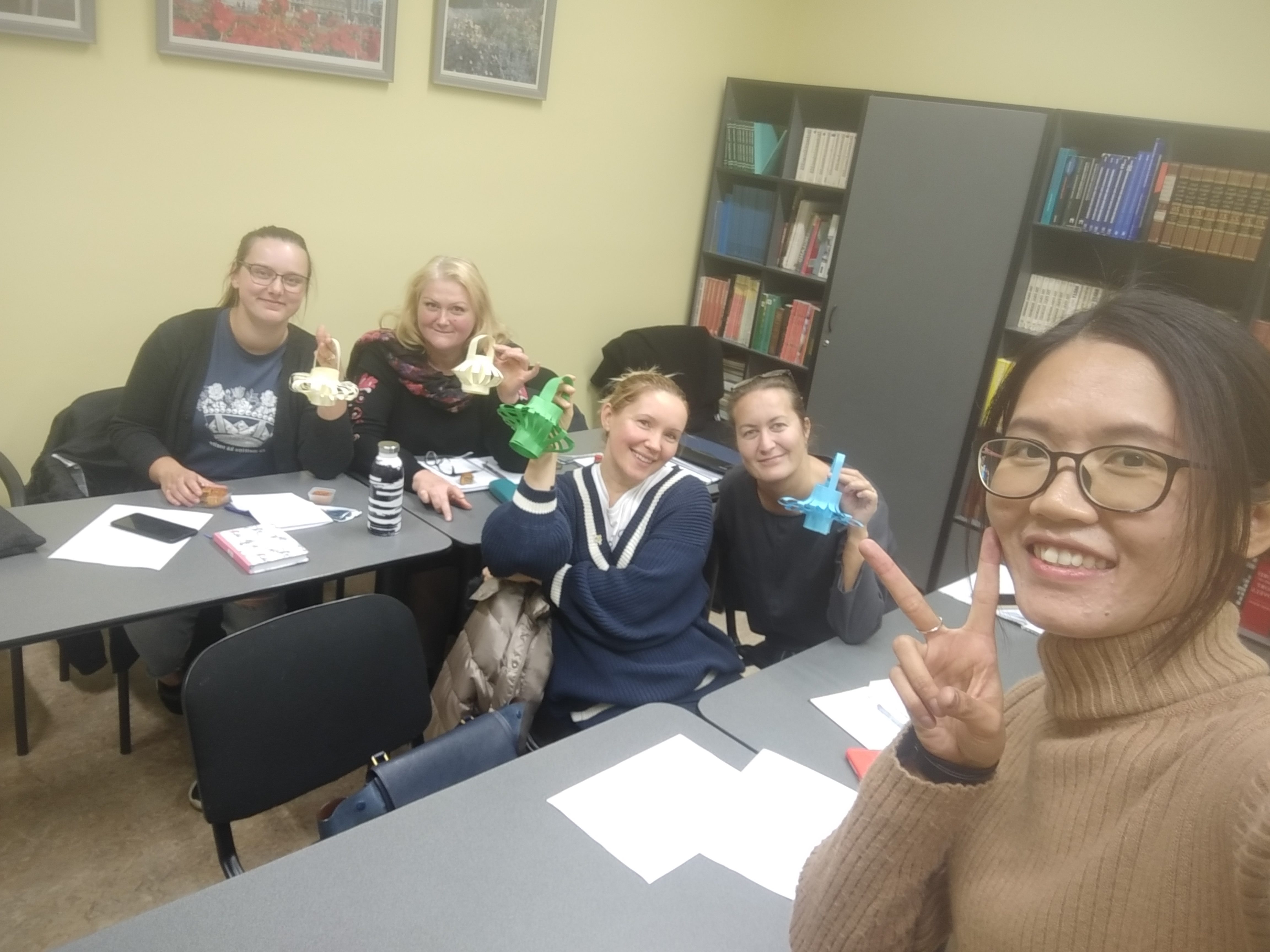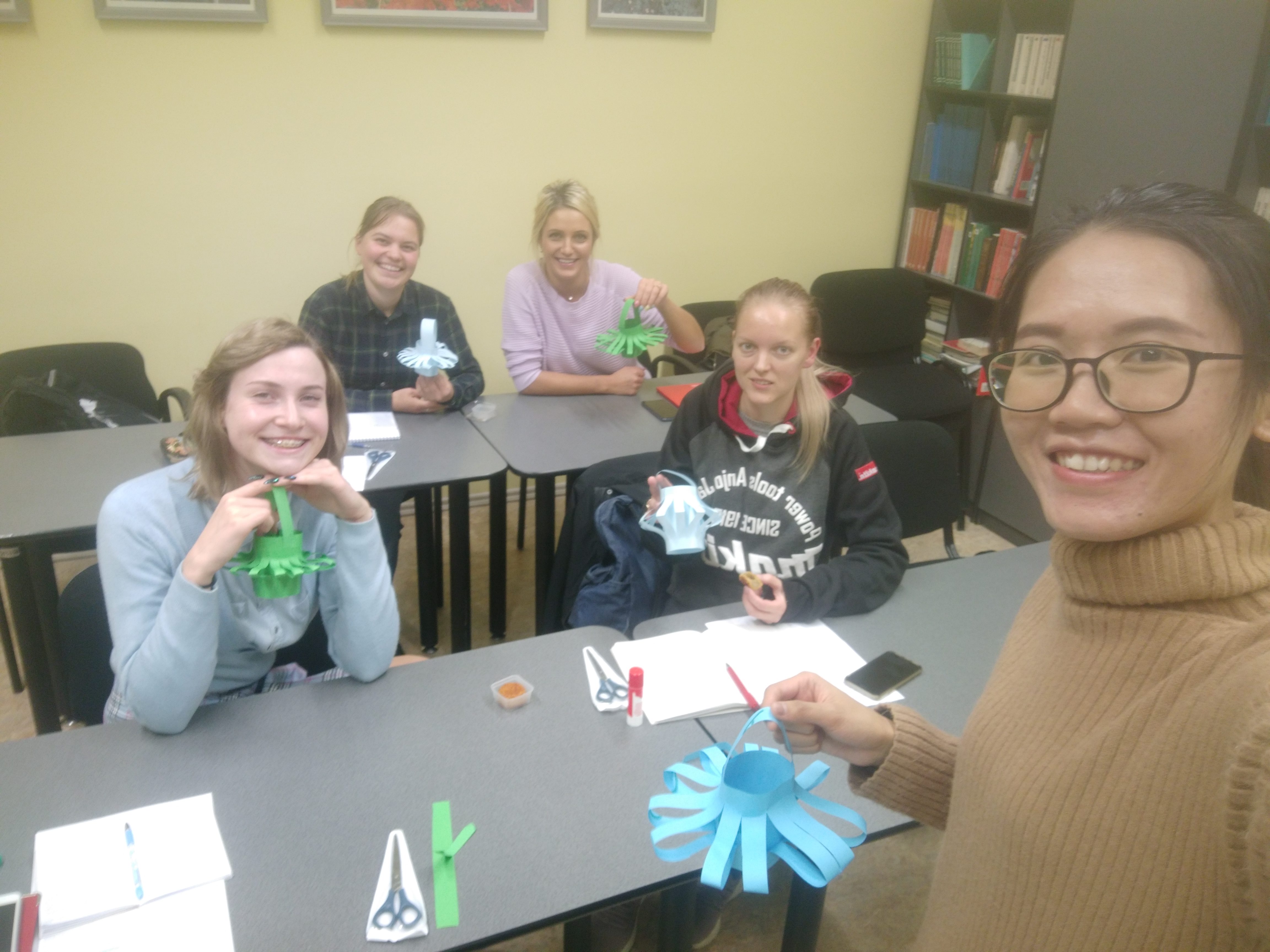 The activity started after everyone’s self-introduction and warm welcome. First of all, Chinese teacher began the activity from the meaning of moon, which made students realize that moon represents reunion and happiness to Chinese. All students are interested for that. Then, the teacher show some fairy tales such as Houyi Shots the Suns and Chang’e goes to the Moon by texts and cartoons, so as to know the origin and custom of Mid-Autumn Festival. Meanwhile, the teacher emphasized the activities and food, especially the mooncake. Besides, students learned to sing a Chinese song The Moon Represents My Heart and made Chinese lanterns to celebrate this festival. At last, the teacher provided some mooncakes for students to taste which made them surprised. After class, students took a video to wish everyone happy mid-autumn festival with the mooncake and lanterns. They feel so proud of themselves. This is the first Chinese class in Liepaja University, with happiness and much fun.