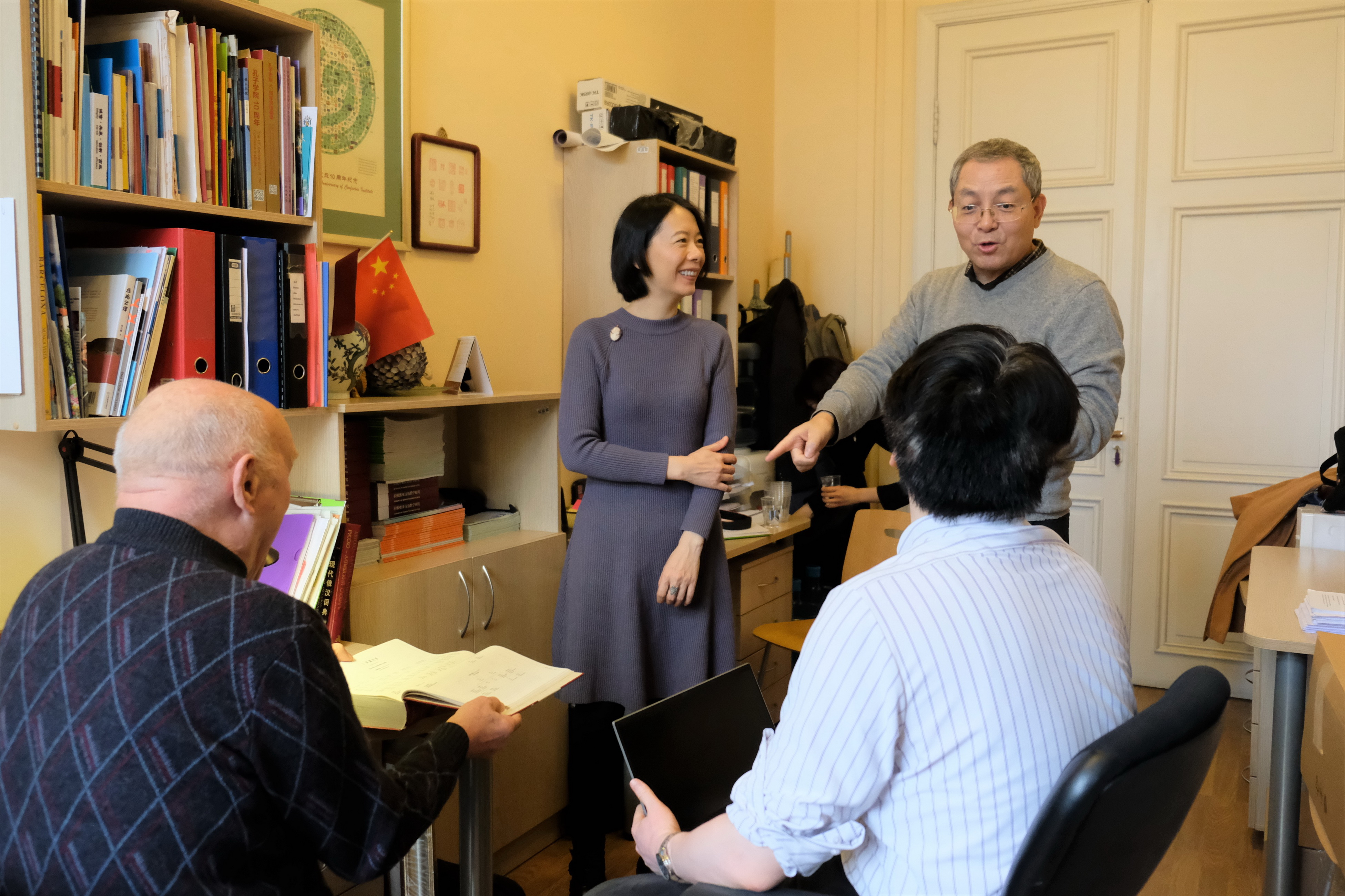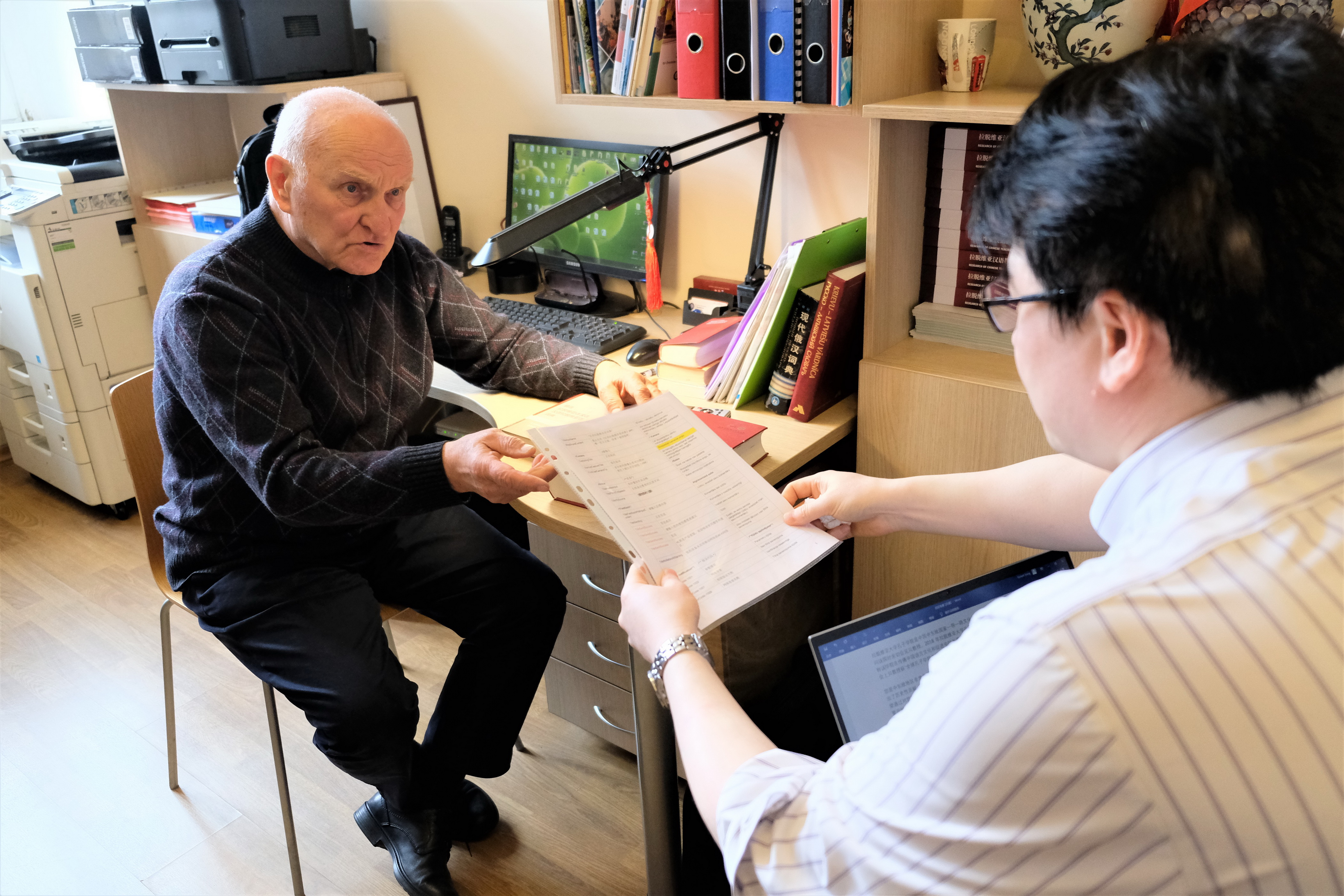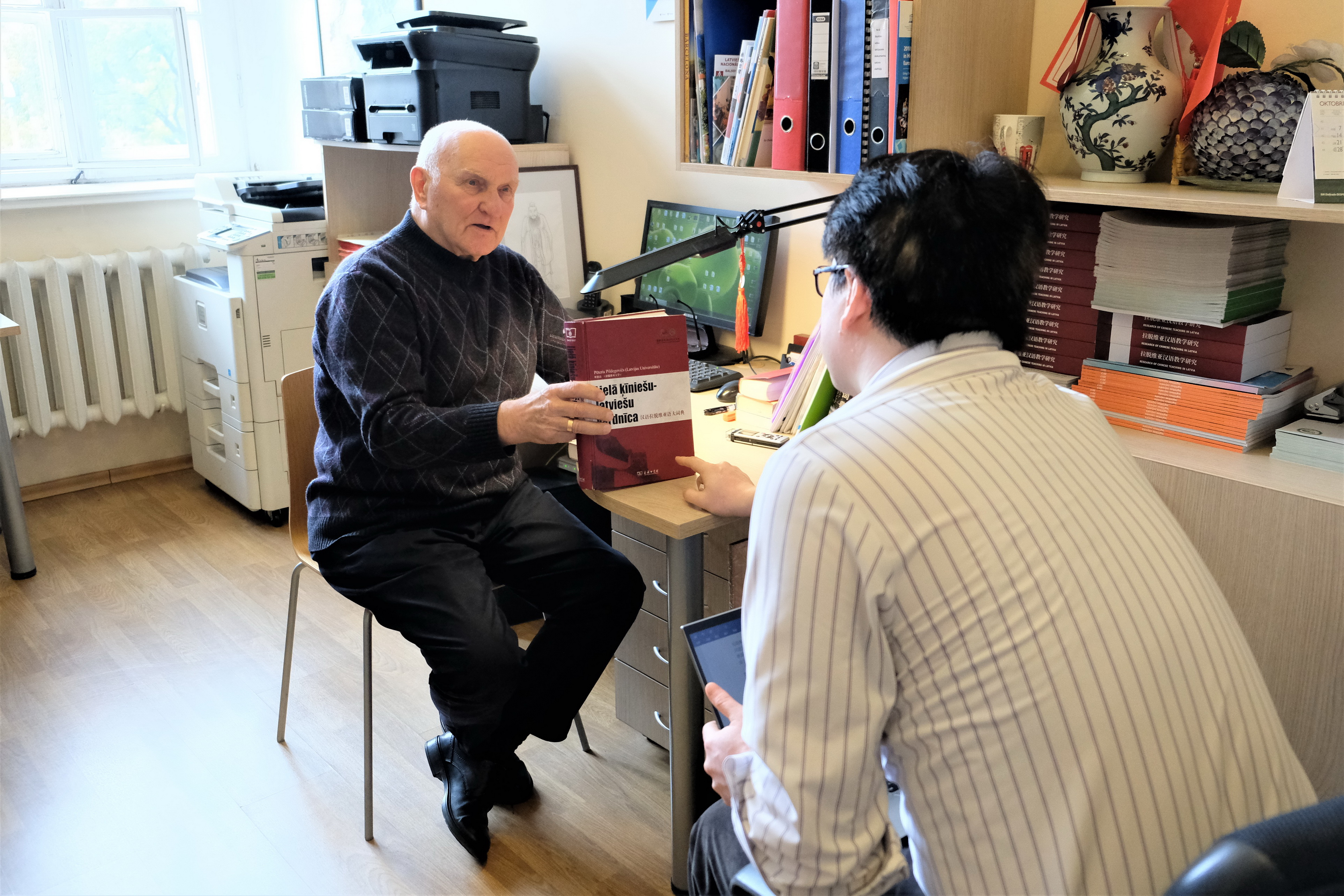 采访最后,贝教授向记者展示了其历时八年编纂成的《汉语—拉脱维亚语大词典》和历时6年编纂成的《精选拉脱维亚语汉语-汉语拉脱维亚语词典》以及即将出版发行的《我的中国故事》手稿。贝教授所展现出的对中国的热情和对汉语的热爱,以及为汉学研究的推广和中拉友谊的建设做出的贡献令二位记者十分钦佩和感动。此次采访圆满结束。