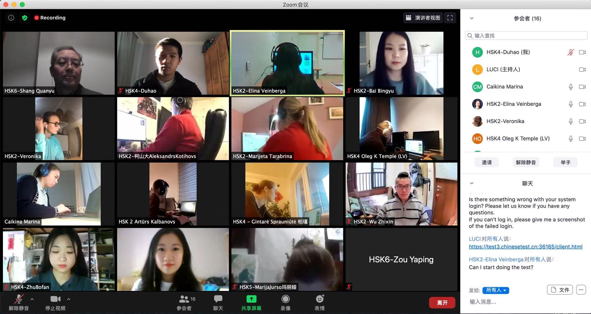 感受到大家的热情,拉脱维亚大学孔子学院中方院长尚劝余教授积极组织拉脱维亚汉语教师志愿者进行了考前培训与考试安排。这是拉脱维亚史上第一次线上汉语水平测试,中方与拉方都十分重视。含尚院长在内的十二名监考官按HSK等级分为六组,每组两人,按HSK考试要求分为主监考官与副监考官。于北京时间2020年12月9日晚十点使用ZOOM会议软件与HSK考试软件开展了模拟考试,让考生与考官熟悉线上考试的流程与考试系统。