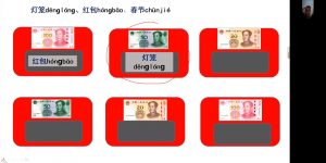 而课堂上气氛最热烈的要数“抢红包”活动了。谢丽婷老师在课前准备了春节红包,让同学们通过“石头剪刀布”的方式决定抽红包的顺序,并猜测红包金额,或通过猜词赢红包的形式展开游戏。两人一组,猜对者赢得红包,未猜对者不得红包,甚至还面临把自己已得的红包全部输给对手的风险。这刺激的游戏规则和丰厚的奖品极大地激起了同学们的兴趣,大家都积极地投入到“抢红包大战”中。最终游戏在同学们的欢声笑语中结束了。大家表示这个游戏非常酷、非常有意思,不仅让大家记住了“红包、灯笼、对联”等与春节相关的词语,而且也从中感受到了浓浓的春节气氛。