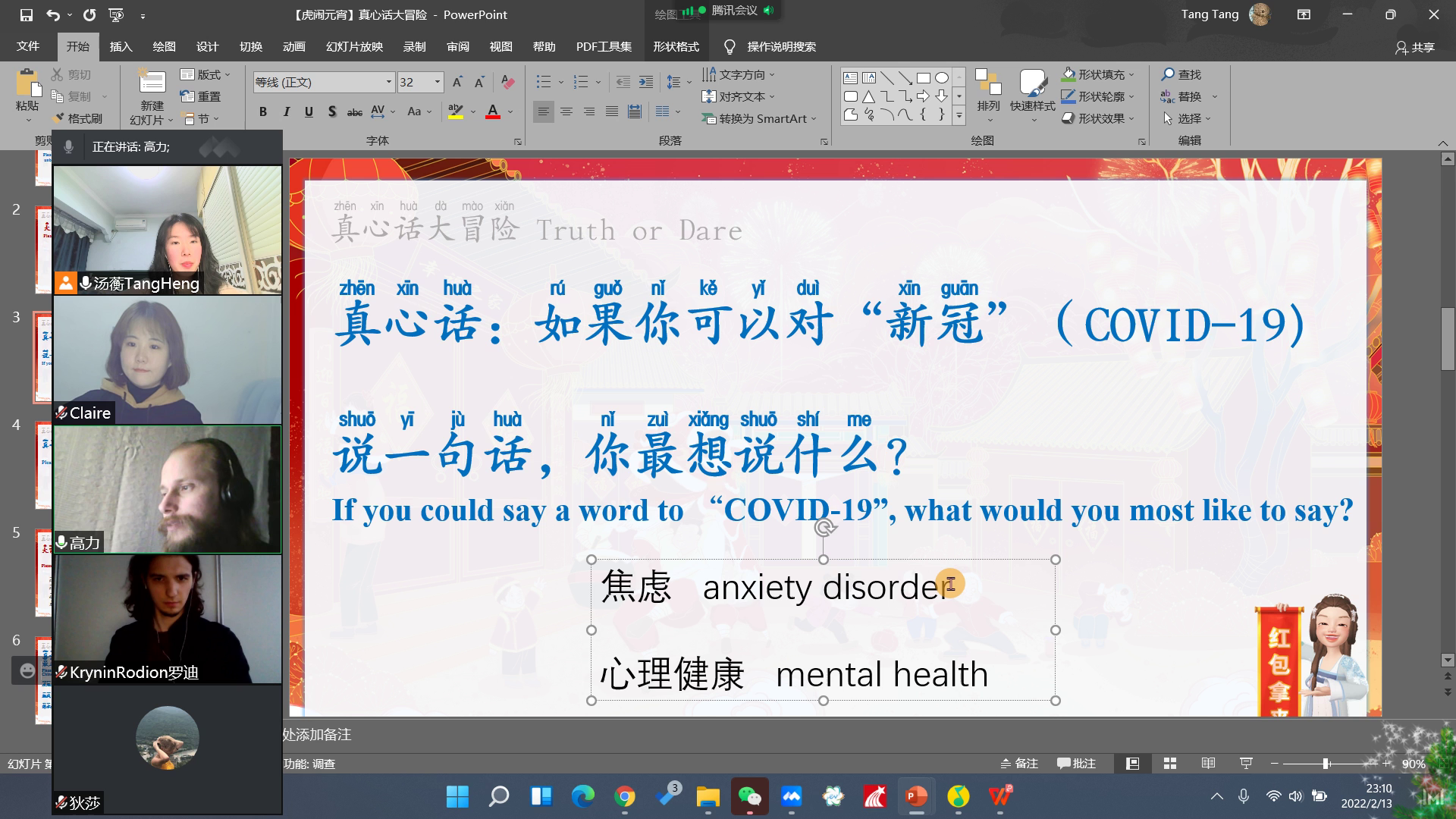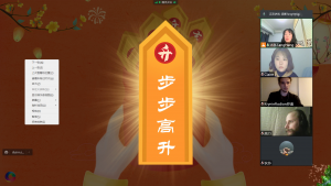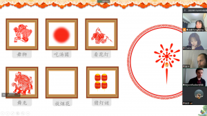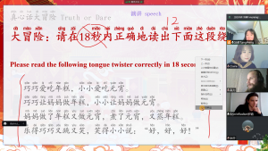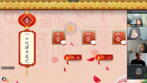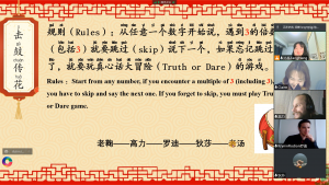 活动分为“热身”、“知识”、“互动”这三大部分。一开始,正逢春节假期,师生们在见面时作揖拜年、互相认识。知识环节,汤老师跟大家交流了元宵节的习俗,并介绍了汉字“元”、“宵”的含义,加深学生们对这一节日来源的了解。接着是备受期待的“猜灯谜”环节,学生们慢慢掌握了技巧后,纷纷与大家分享自己的答案和想法。趁着学生们热情高涨之时,汤老师围绕“中国南方和北方的节日习俗有何不同?”、“在拉脱维亚,有没有跟中国春节/元宵节相似的节日?”等话题与学生展开讨论,汤老师和老鞠也分享了各自家乡广西、山东的过节习俗。除此之外,本次活动在互动环节设置了生动有趣的小游戏——“击鼓传花”:从任意一个数字开始说,遇到3的倍数(包括3)就要跳过说下一个;否则,就要玩真心话大冒险(Truth or Dare)的游戏。学生们摩拳擦掌,开展了紧张激烈的“角逐”。“真心话大冒险”环节,老师和学生们争相地挑战元宵主题的绕口令、交流疫情下的生活百态、聊聊学习中文的初衷和感想、分享中国方言的趣事等等,场面好不热闹!