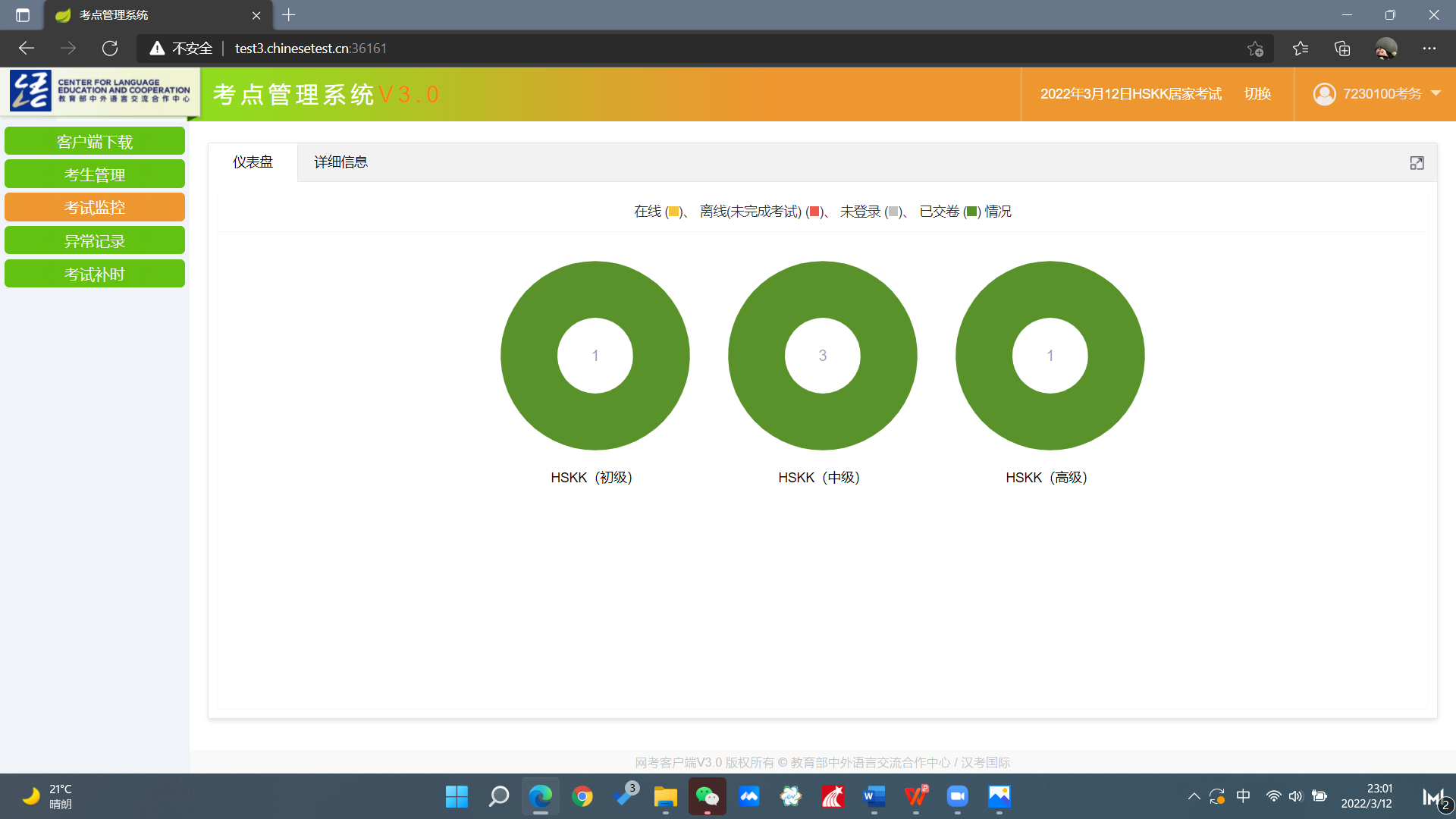 于北京时间2022年3月5日下午14:00,各位监考人员使用ZOOM会议软件与HSK考试客户端开展了模拟考试,利于学生熟悉流程的同时也帮助考官反思及改进了监考工作。3月12日星期六下午14:00开始,第一场(HSK2&HSK4)考试作考前准备,孔院中方院长尚劝余和李民、所有监考人员、考生们准时进入了会议间,监考官们有序协助各位考生进行设备、环境的核验,明确考试须知,考试于下午15:00正式开始。接着,第二场HSKK中级、第三场(HSK2&HSK4)、第四场HSKK初级和第五HSKK高级也依次开展考前准备及考试。期间,监考工作确保了全天候待命,助力HSK考试的正常进行。