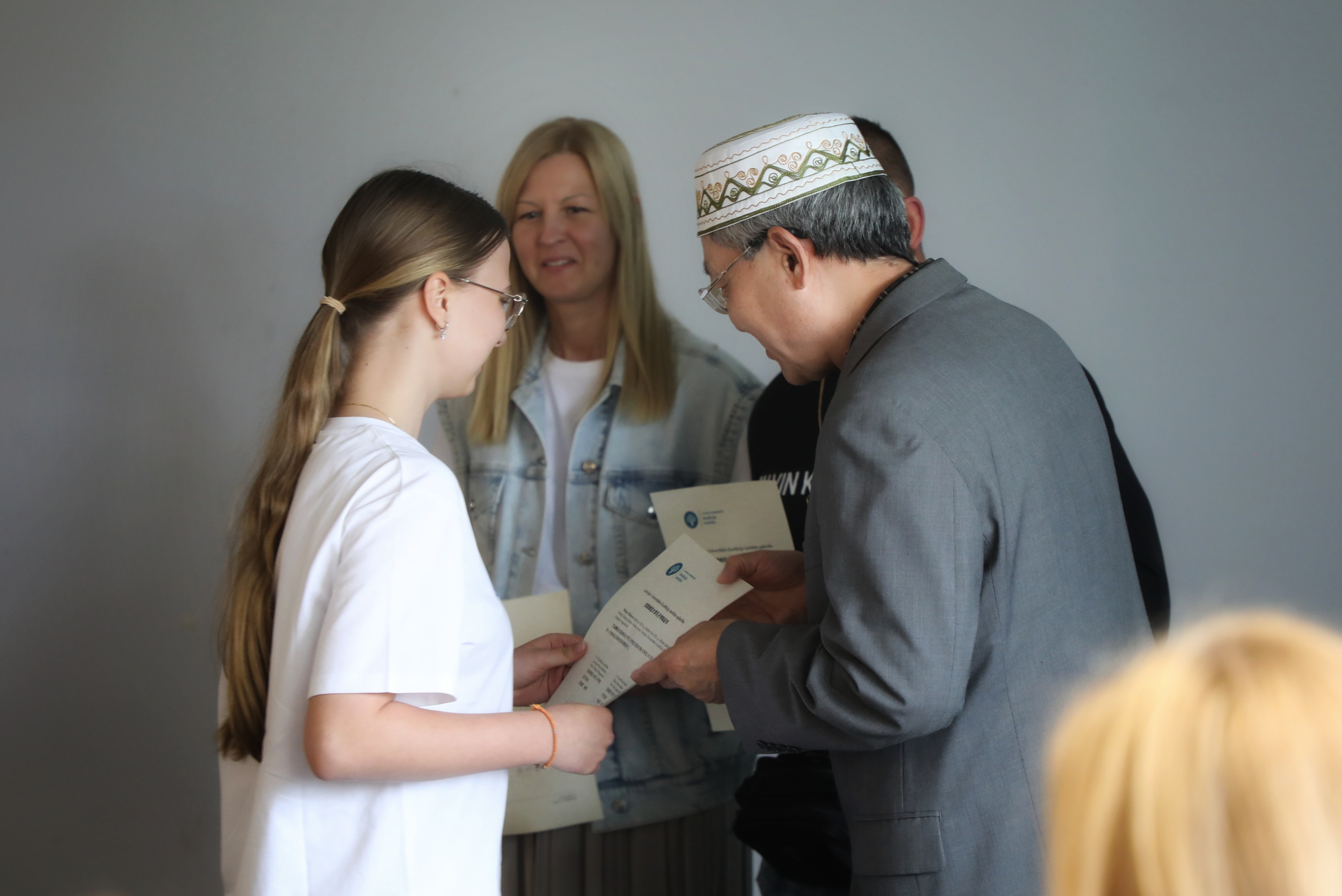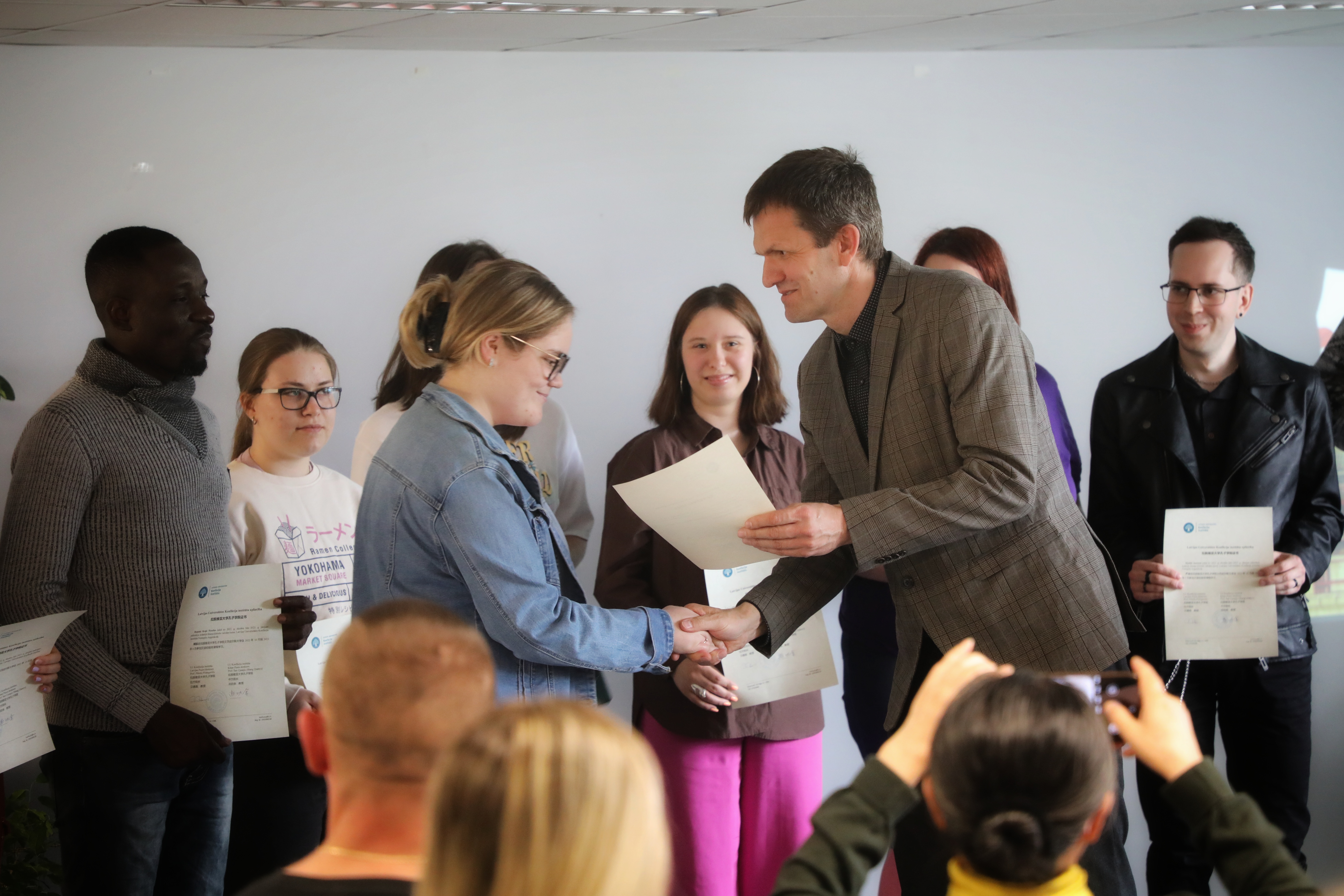 当地时间2023年6月1日,拉脱维亚大学孔子学院拉方院长贝德高教授、中方院长尚劝余教授及其夫人张桂英、秘书高安娜等一行亲赴文茨皮尔斯应用科技大学参加文城汉语教学点2022-2023学年中文课程结业典礼。校长安德里斯教授、翻译学院院长珊迪亚女士、学习部负责人里佳女士、终生学习中心负责人爱吉塔女士等热情接待,近30位学员参加典礼,中文教师徐申主持本次活动。