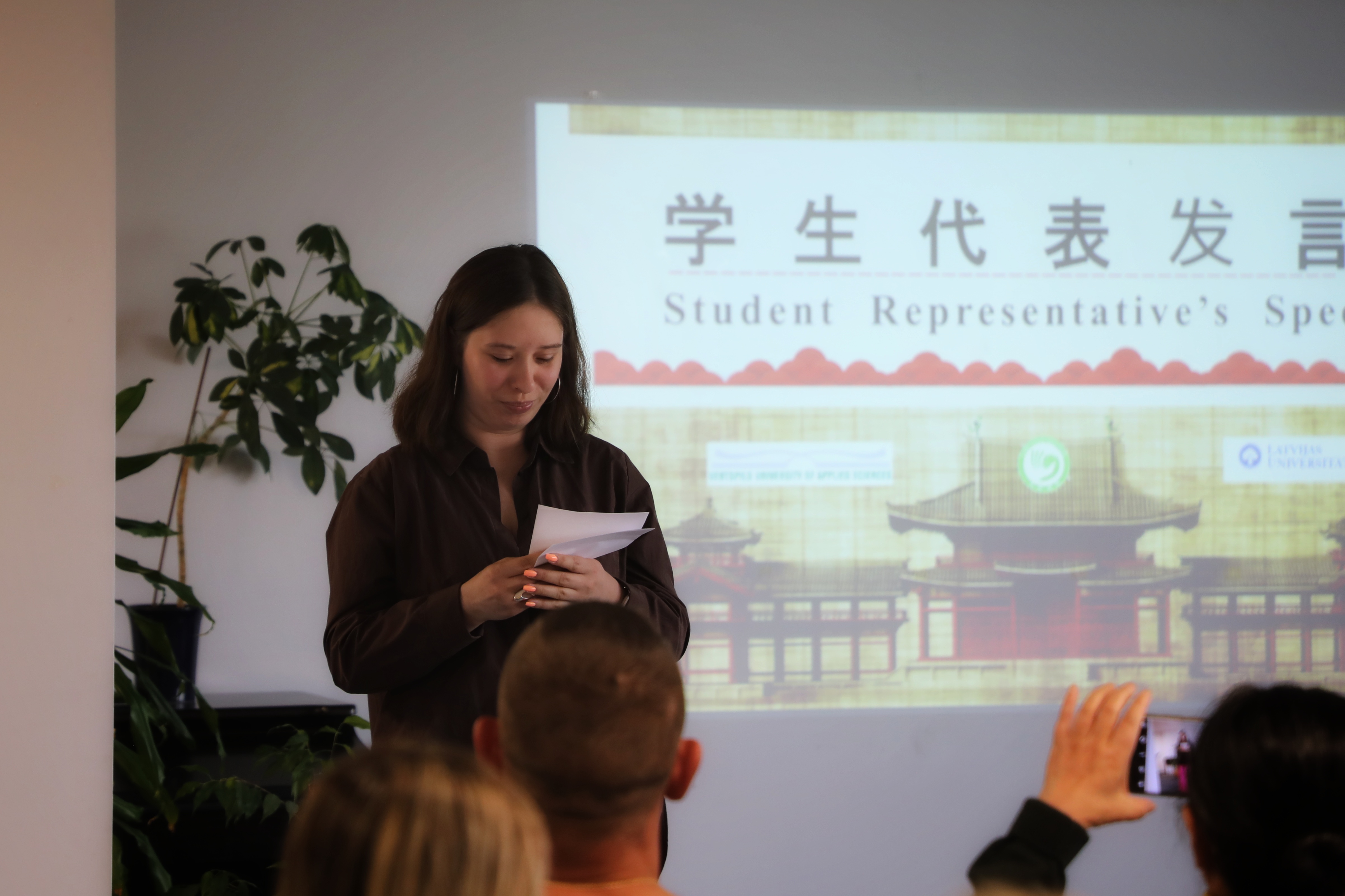 At the beginning of the ceremony, a teaching video overviewed the whole academic year, which brought tears to the eyes. The Rector Andris shared his travel experience in China in his speech, saying that he attached great importance to the cooperation with the Confucius Institute at LU and hoped to continue to strengthen communication and enhance friendship in the future. The Dean Sandija emphasized the importance of cultural experience. Language is the carrier of culture, and language learning is more about experiencing culture. She hopes that students can understand China and feel Chinese culture through learning Chinese. The Director Shang Quanyu highly praised the achievements of Chinese language teaching in VUAS and showed appreciation to VUAS for its continuous support since the establishment of the Chinese teaching point in 2017. Professor Peteris introduced his working career and his indissoluble bond with China, and donated his books “My China Story” and “Selected Translation of Tang Poems” to the university library. Li Yaling, the student representative, also shared her feelings about learning Chinese over the past year. At last, Rector Andris, Professor Peteris, and Professor Shang Quanyu presented certificates to the students, and the event ended successfully.